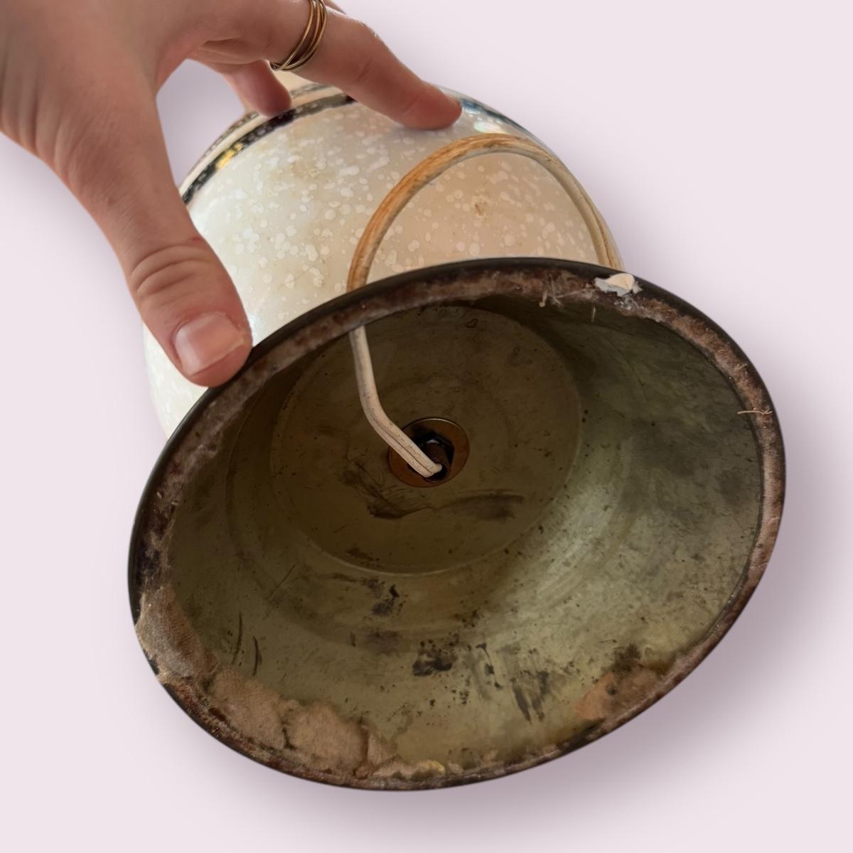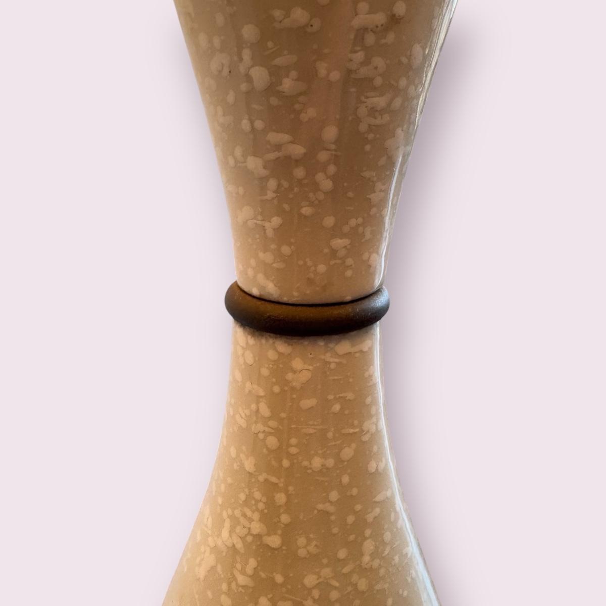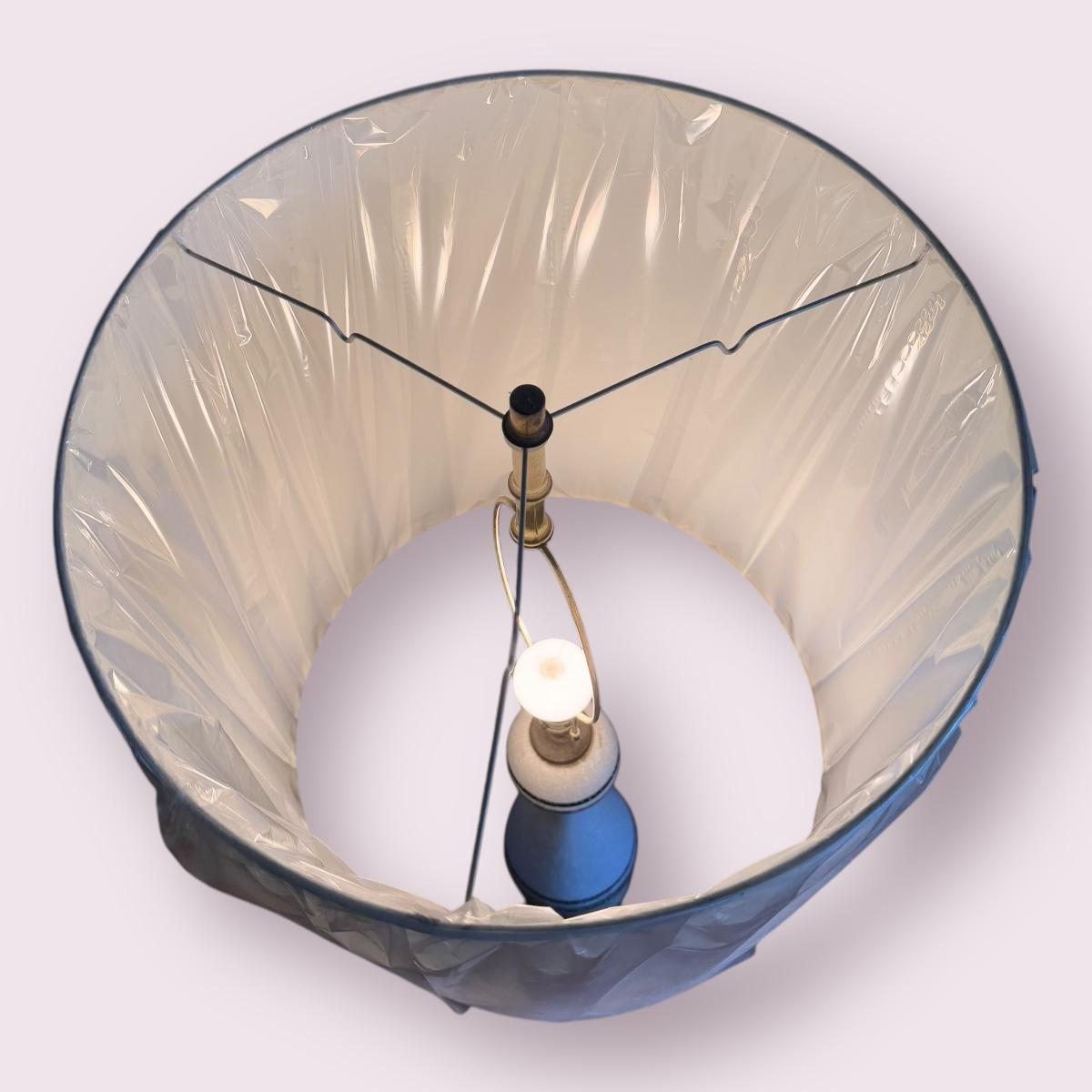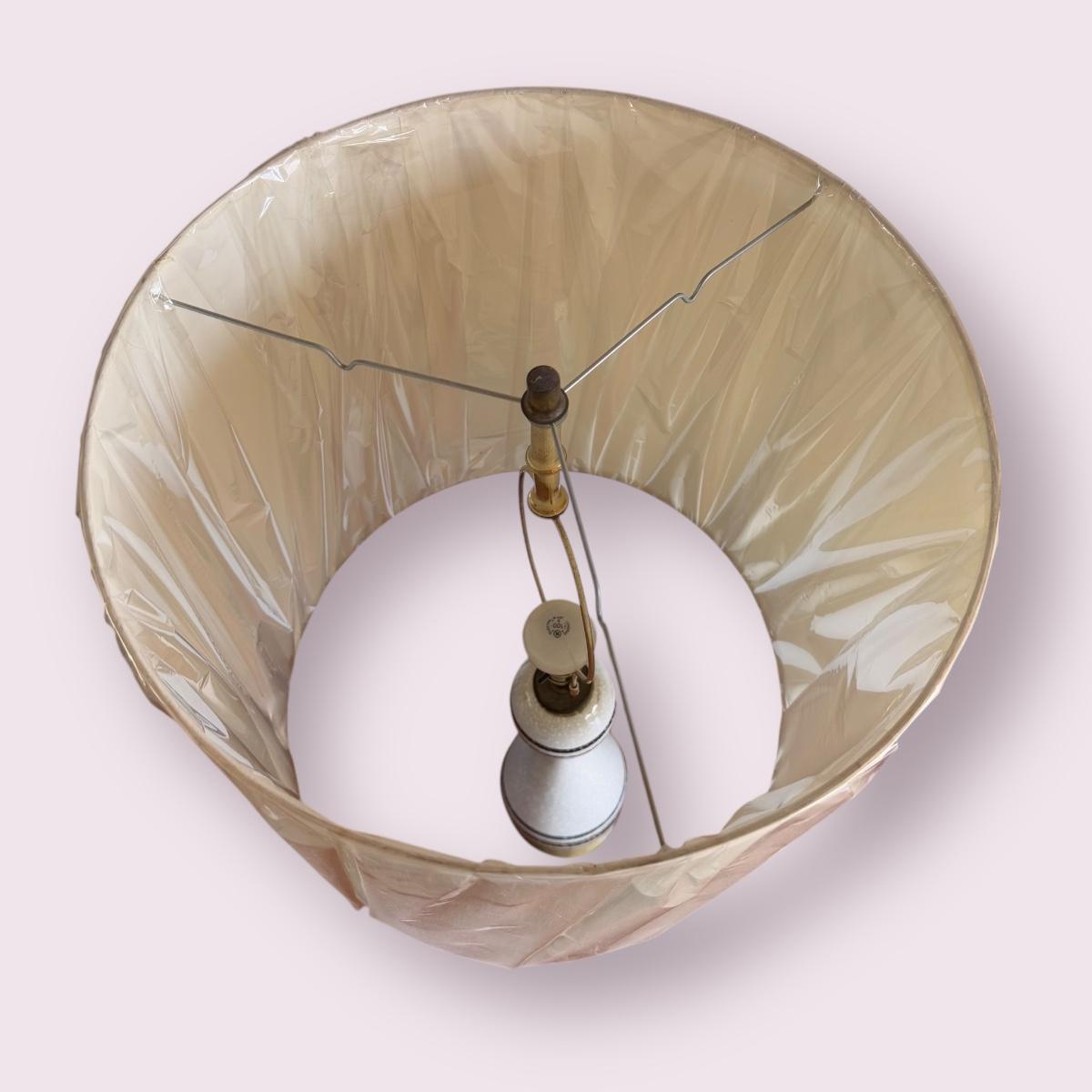 Lot includes one Mid Century style ceramic lamp. The lamp has a brass bottom with several other brass features. The lamp measures 17” x 47”H. It powered on when plugged in - see pictures included. Lamp has a on/off switch.
