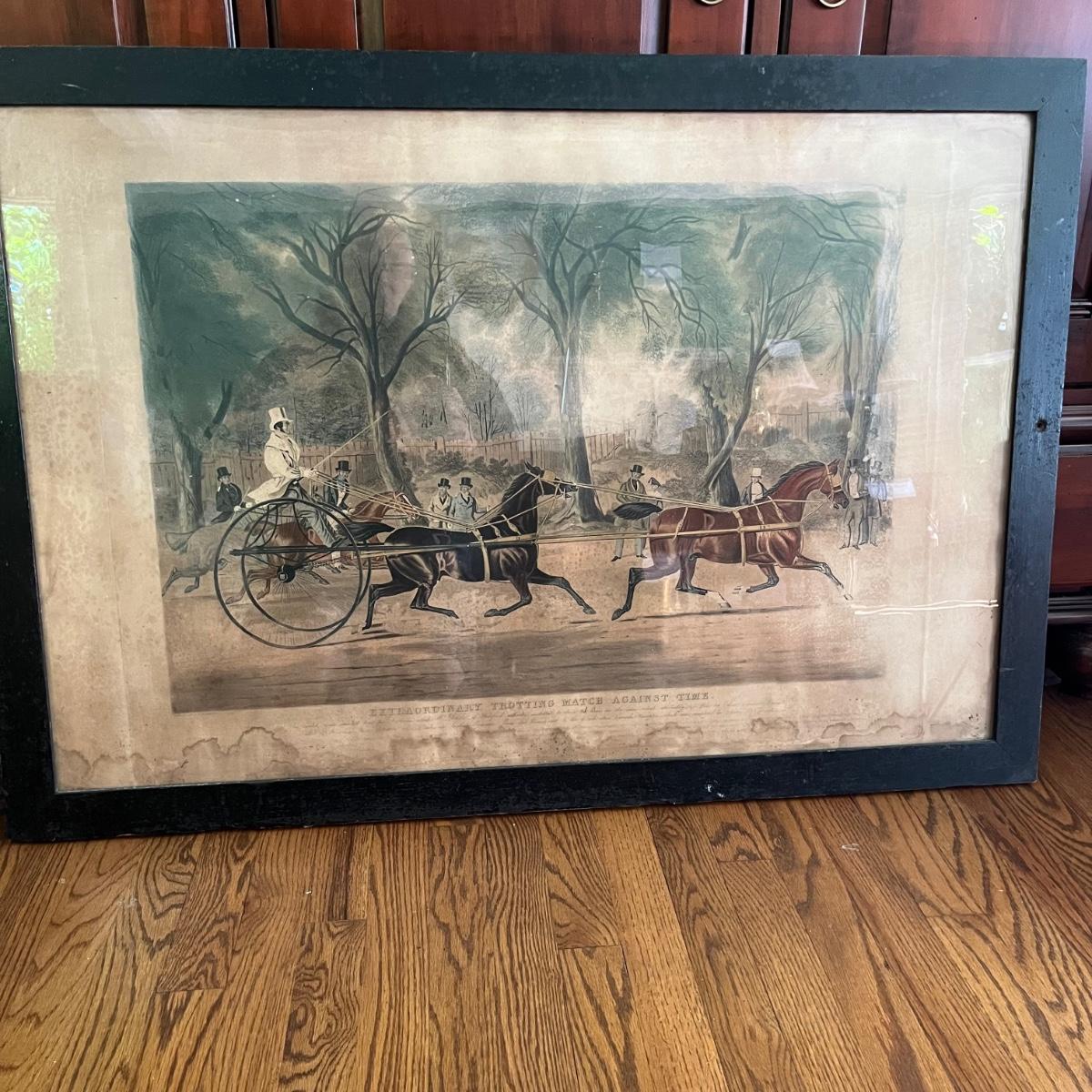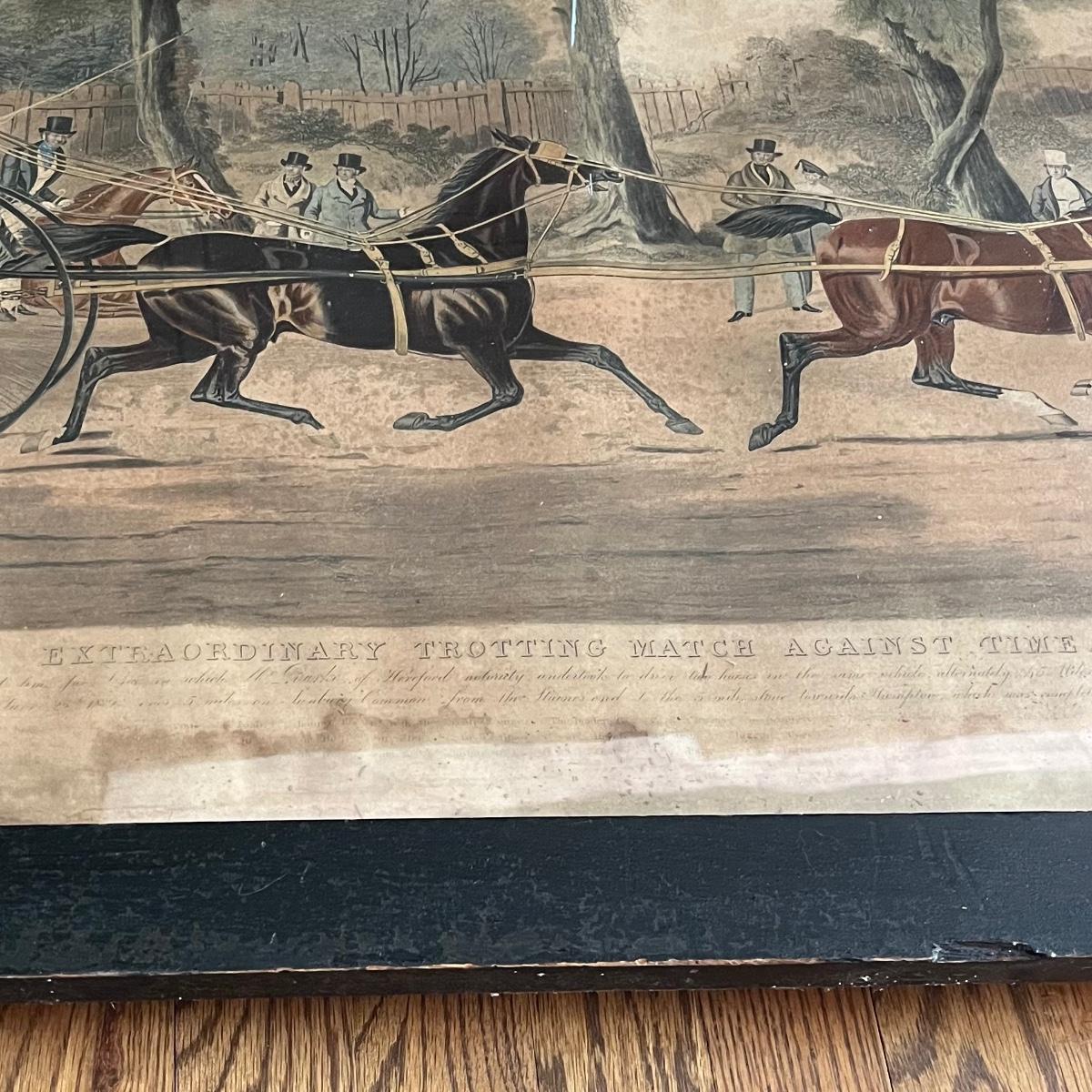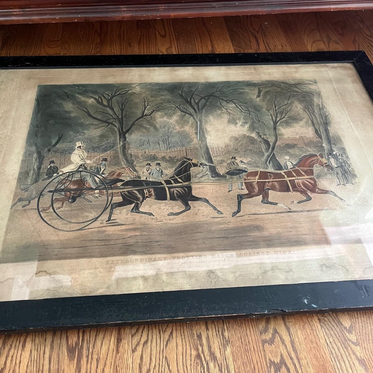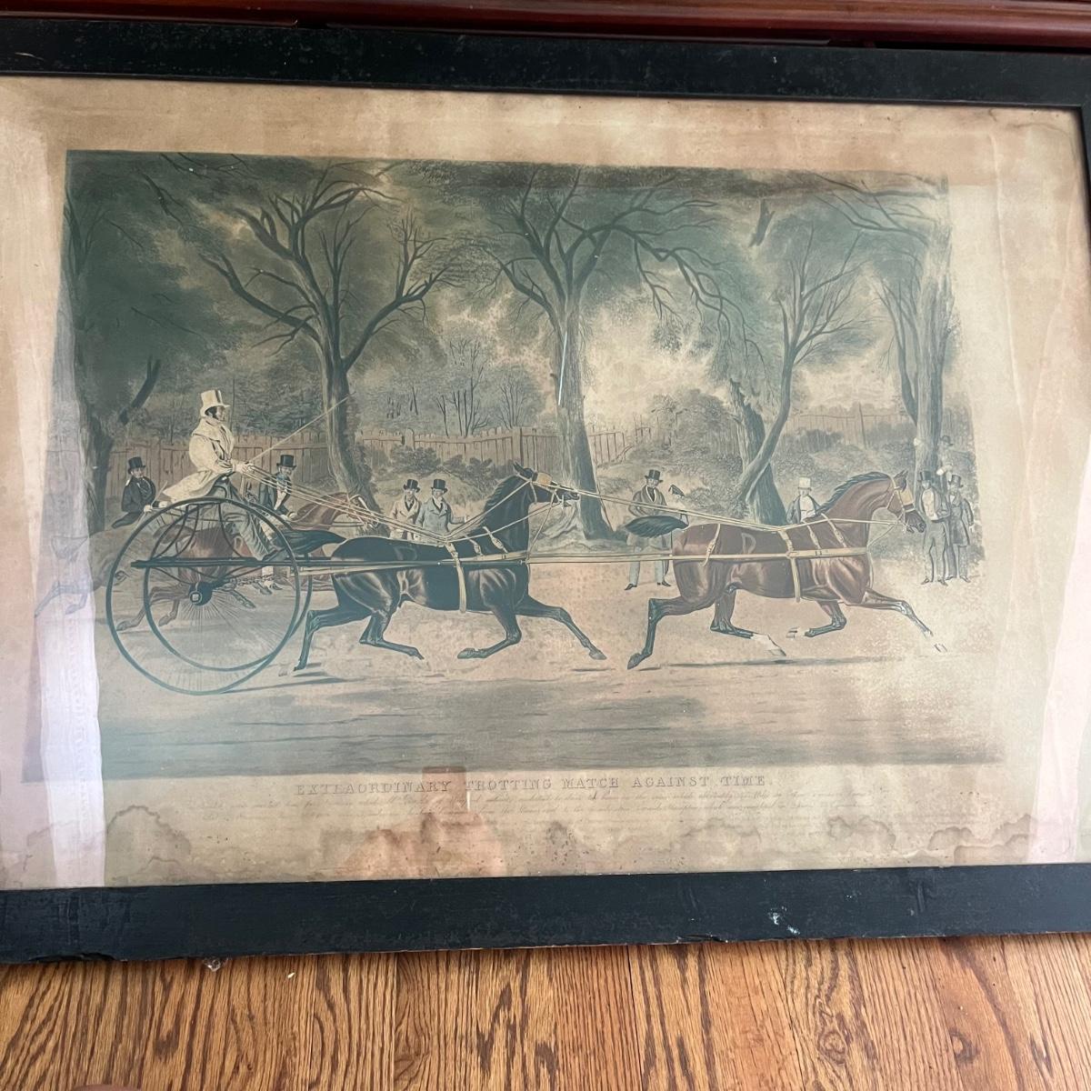 Lot includes a wooden framed print titled “Extraordinary Trotting Match Against Time”. Print has water damage on bottom, see pictures. Frame measures 29.5” x 43”.