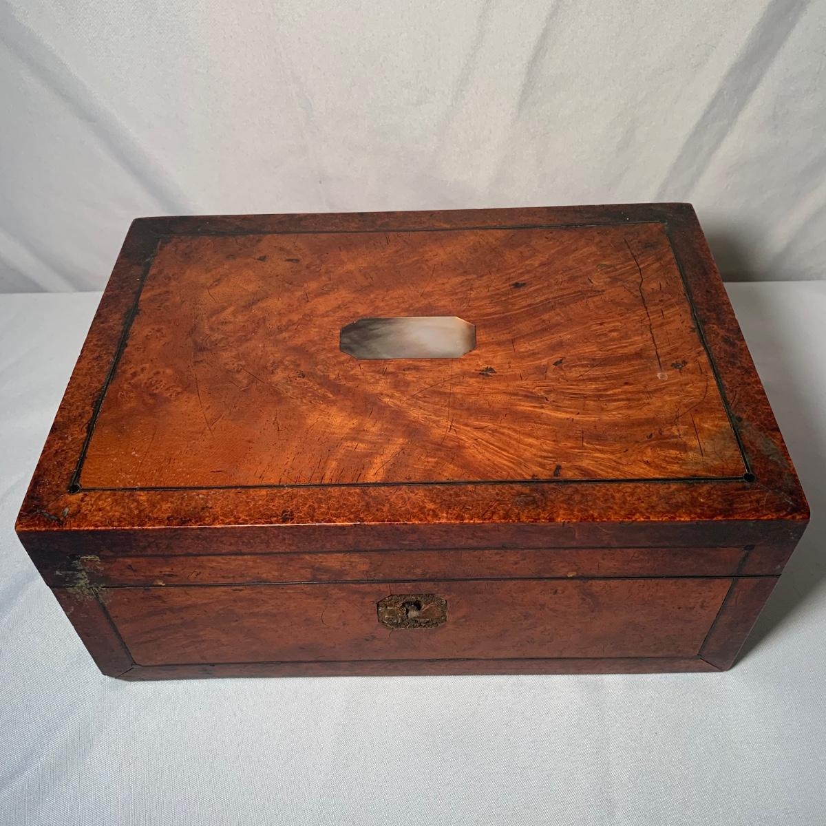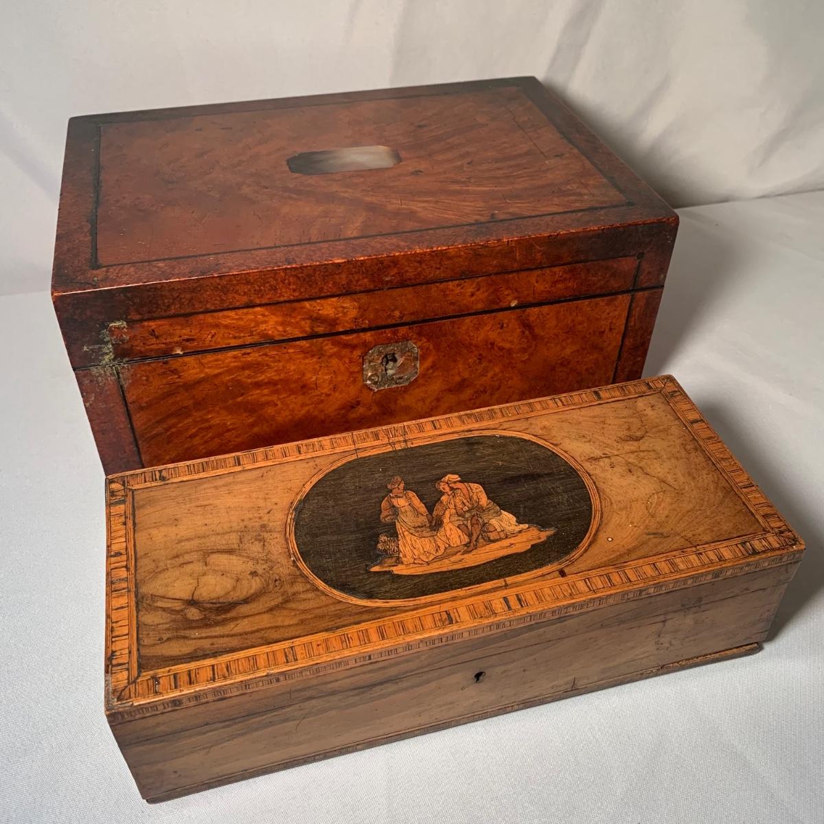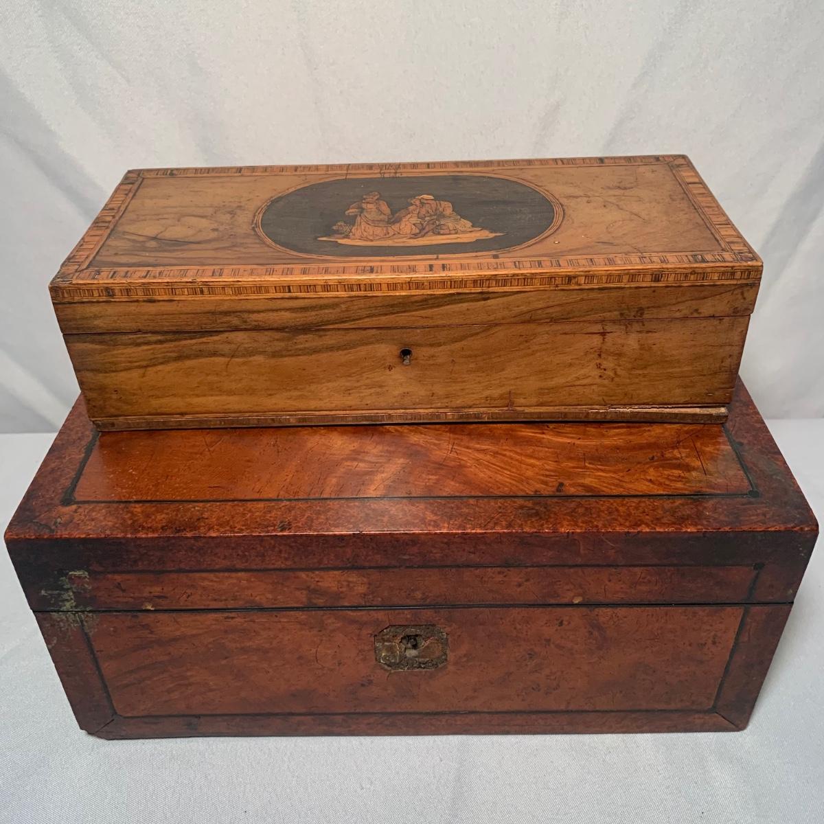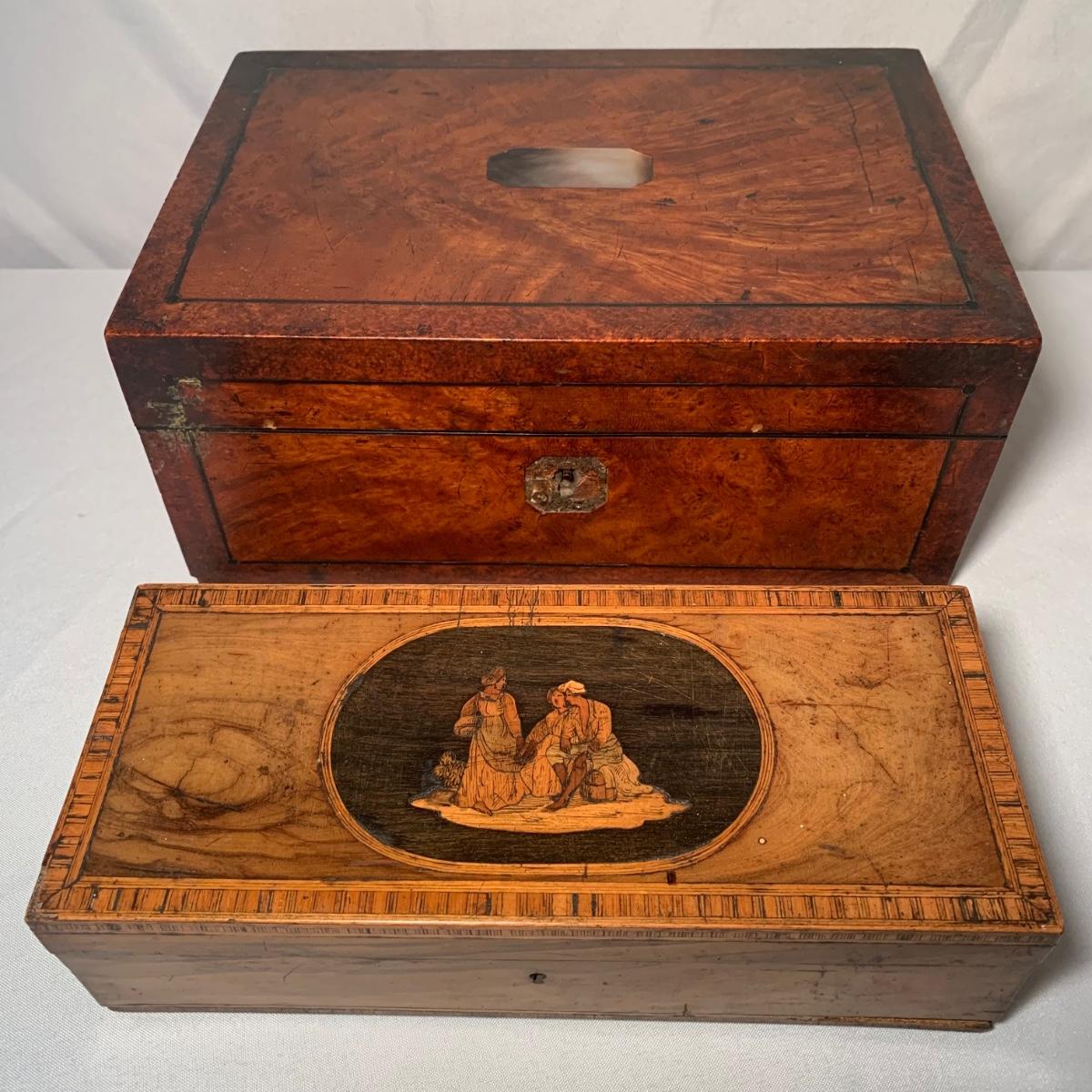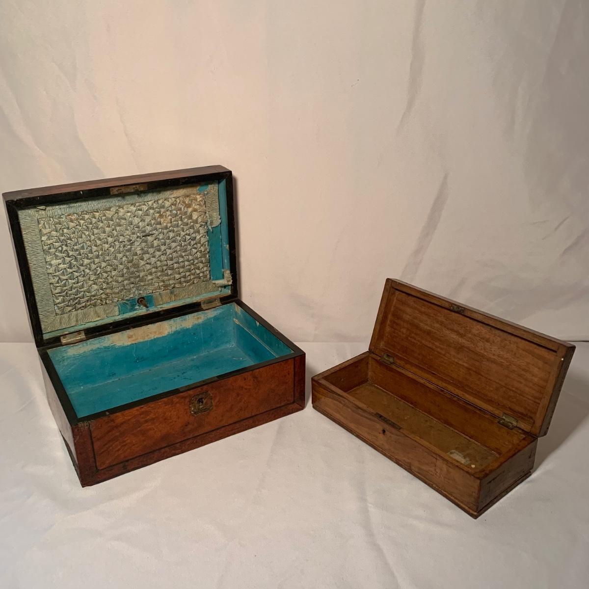 Lot includes two wooden boxes. The largest box measures, 12"L x 8”W x 5”H. This box has a mother of pearl-like inlay and locking mechanism with key (non-functioning). Both boxes have blemishes, but are unique and beautiful pieces. They open and close with ease. Please see photos for more details.