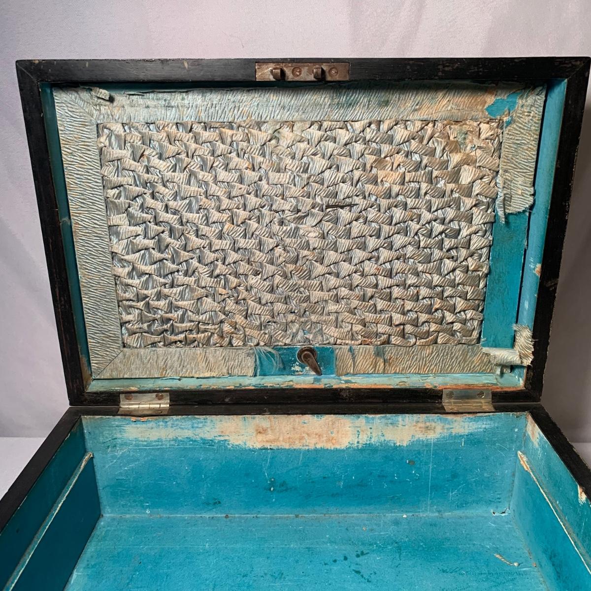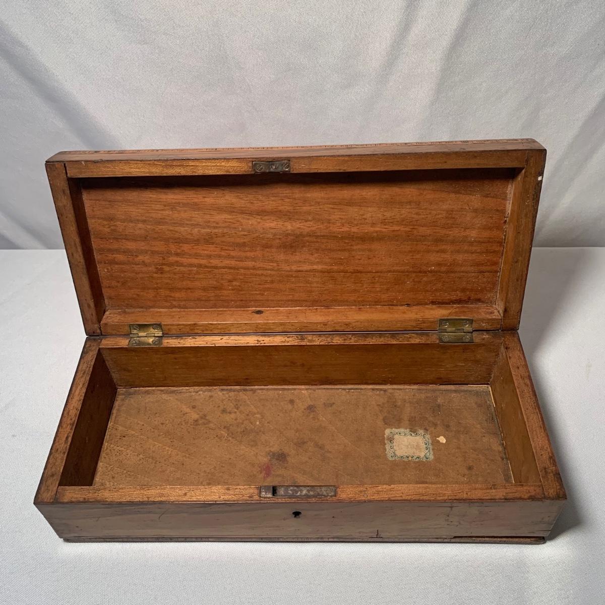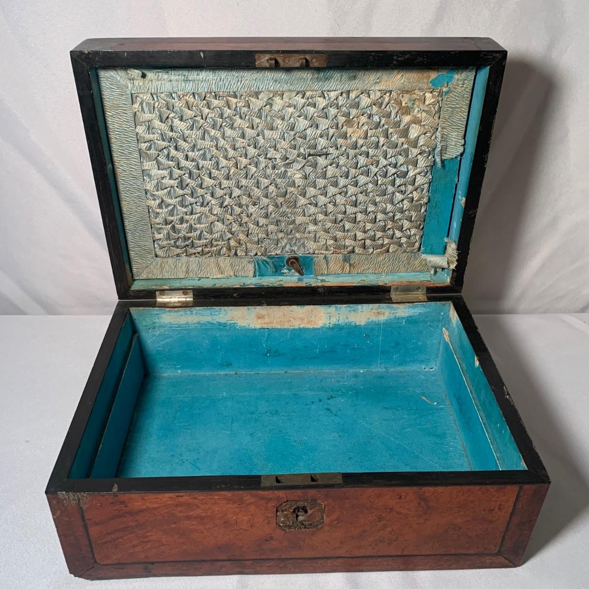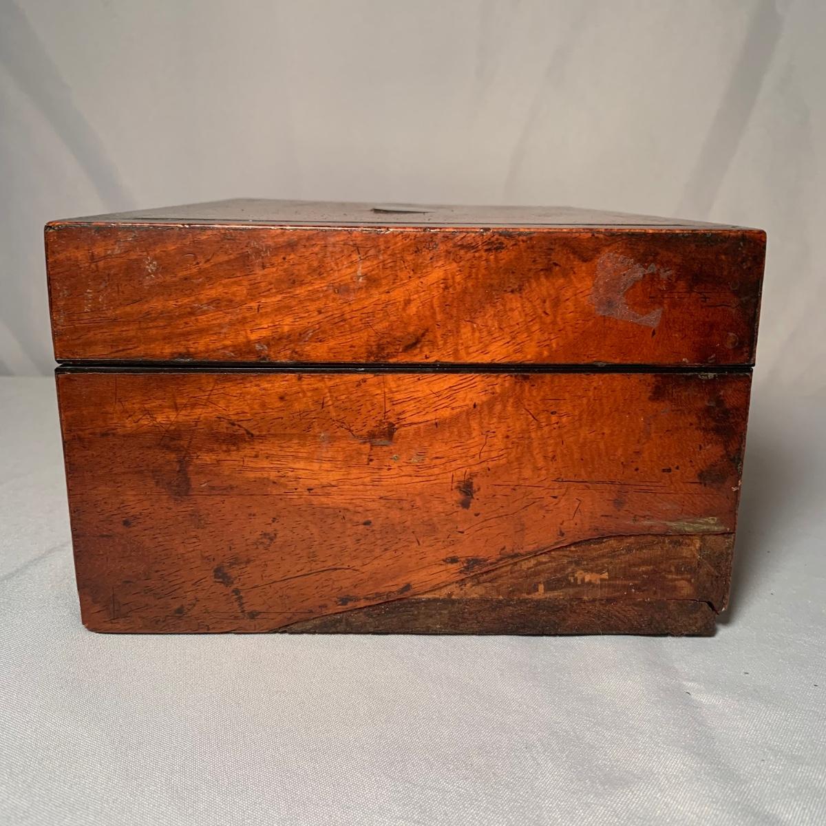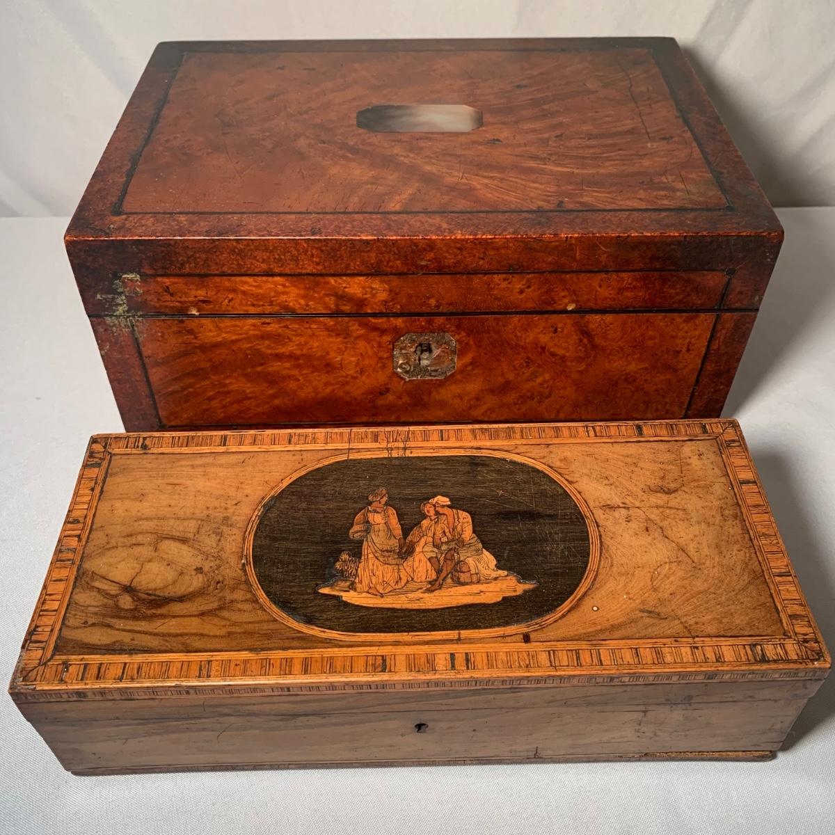 Lot includes two wooden boxes. The largest box measures, 12"L x 8”W x 5”H. This box has a mother of pearl-like inlay and locking mechanism with key (non-functioning). Both boxes have blemishes, but are unique and beautiful pieces. They open and close with ease. Please see photos for more details.