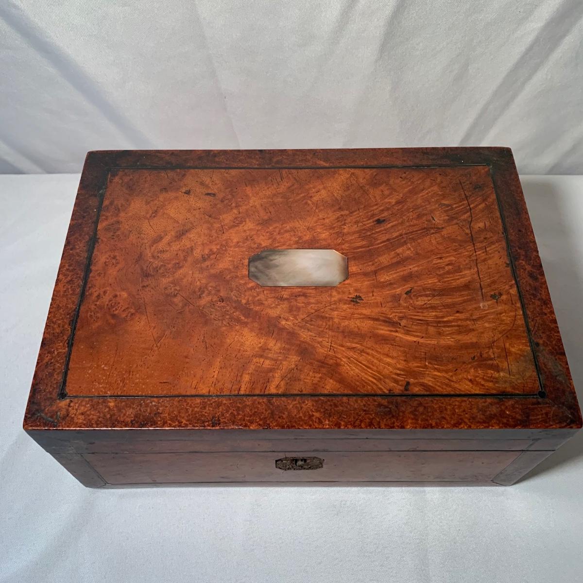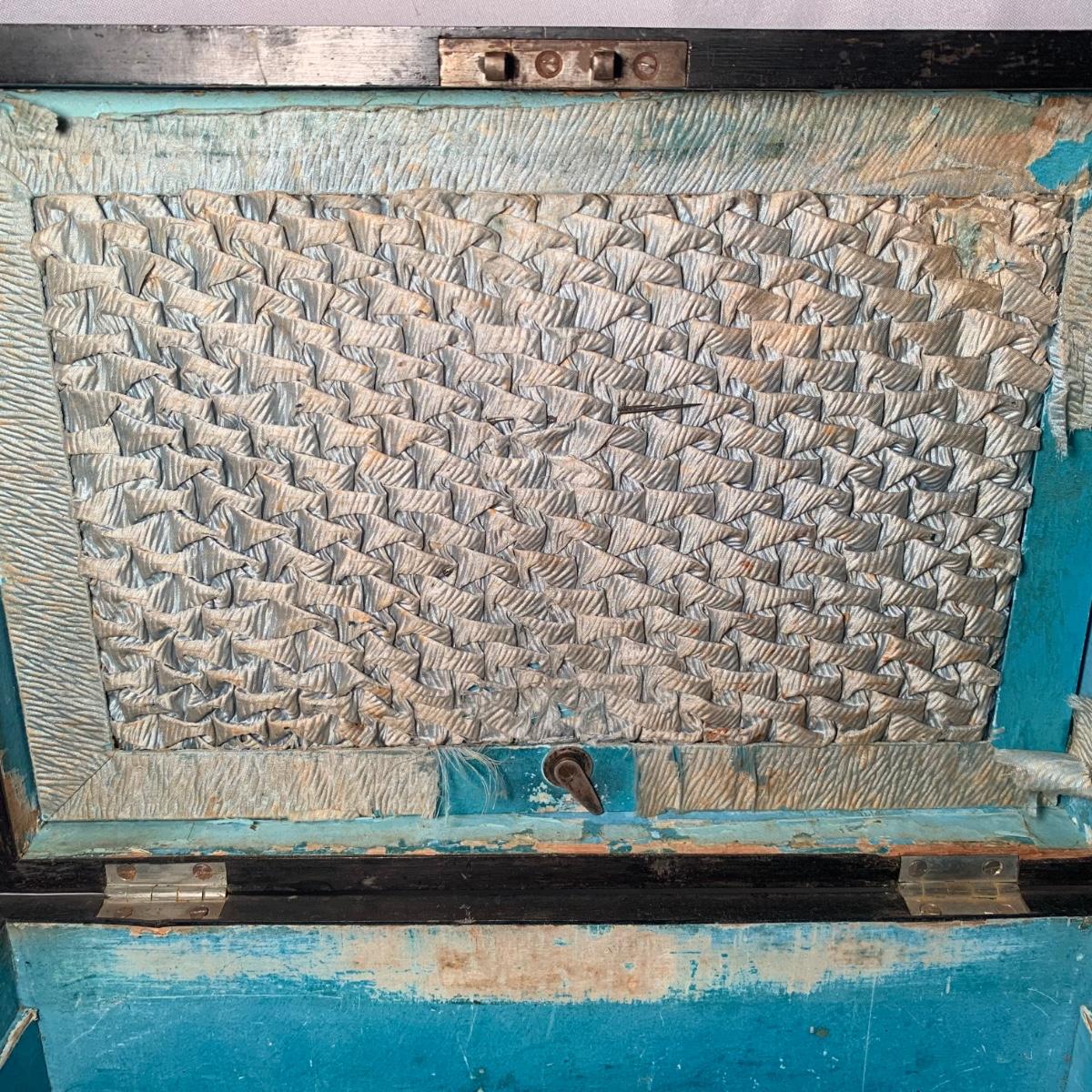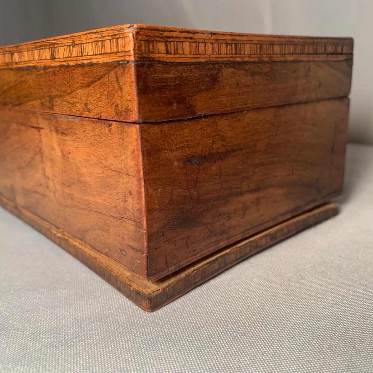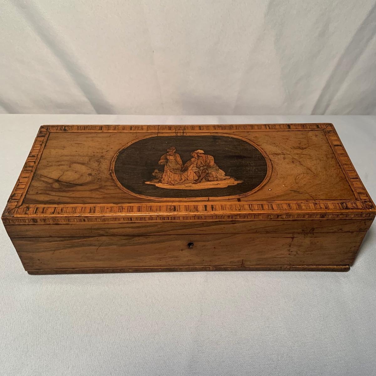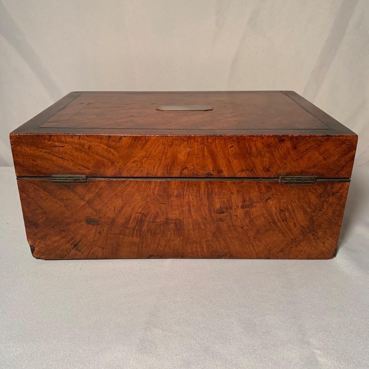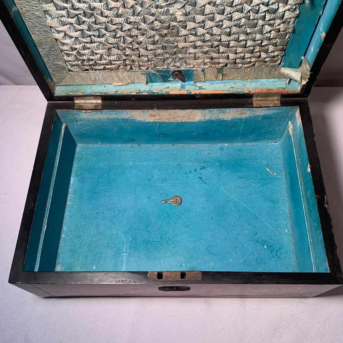 Lot includes two wooden boxes. The largest box measures, 12"L x 8”W x 5”H. This box has a mother of pearl-like inlay and locking mechanism with key (non-functioning). Both boxes have blemishes, but are unique and beautiful pieces. They open and close with ease. Please see photos for more details.
