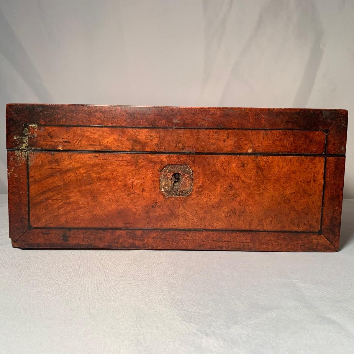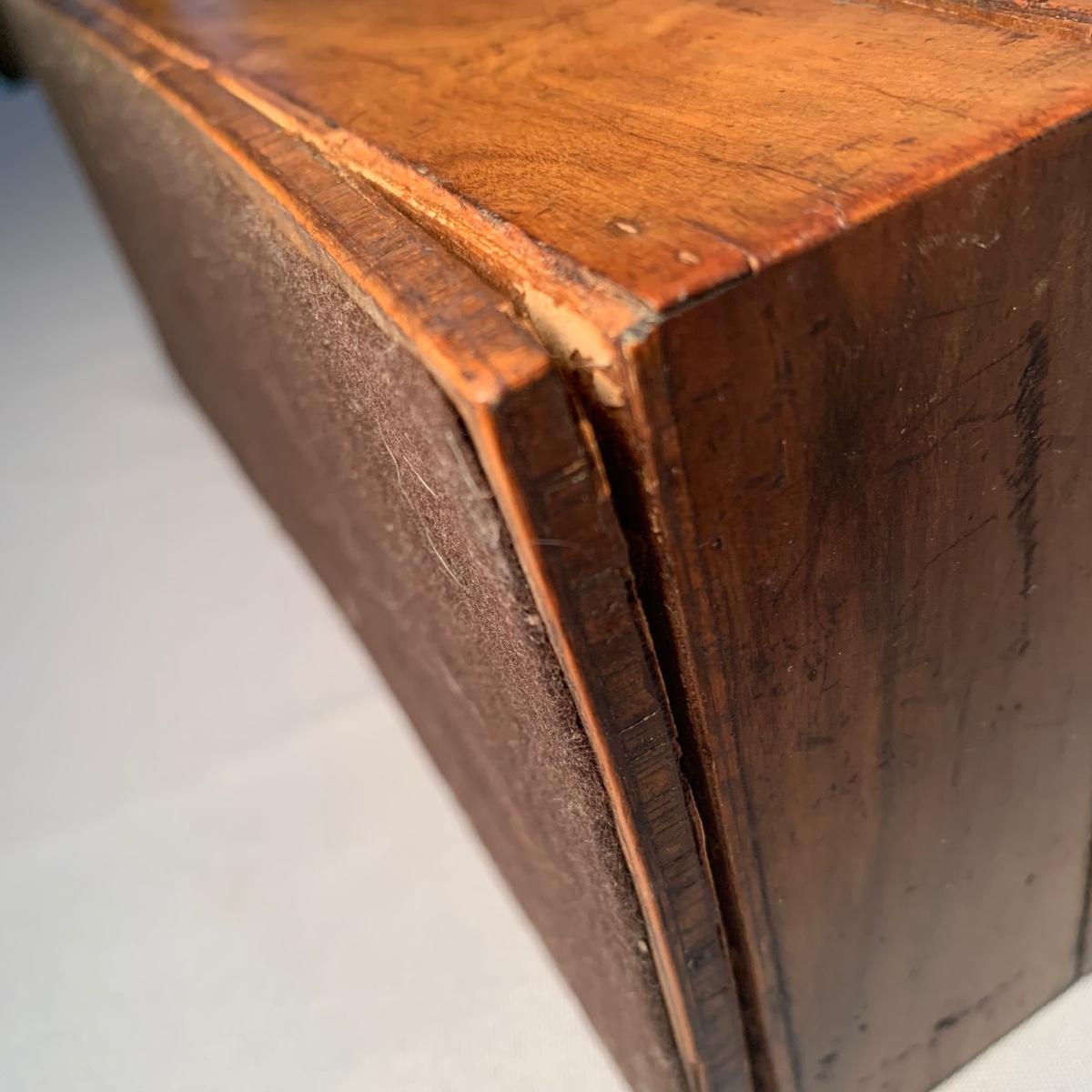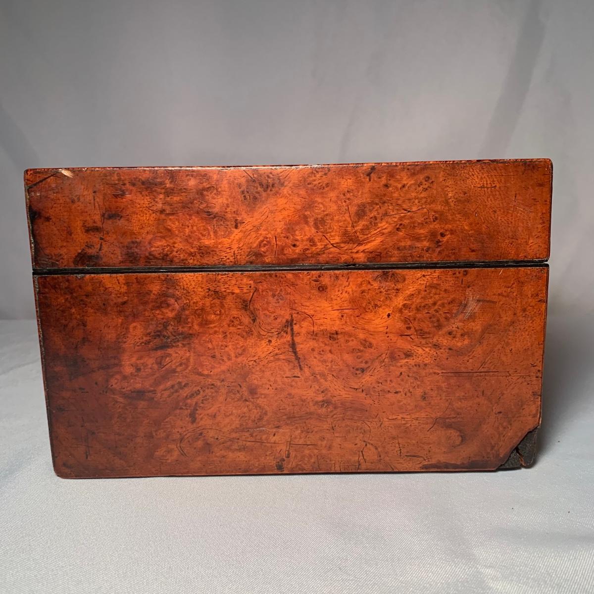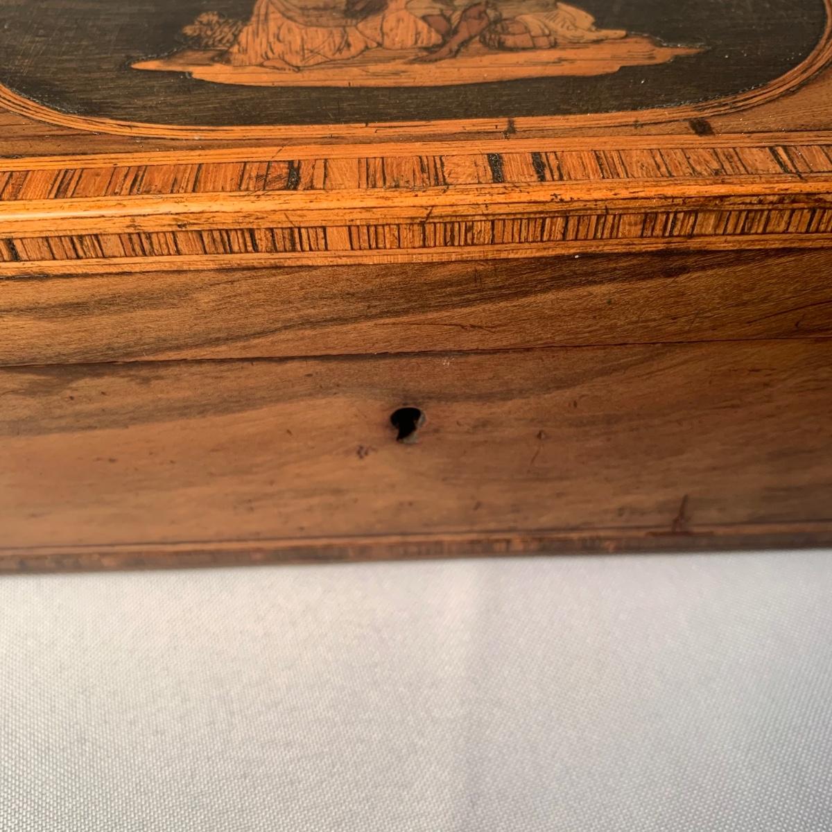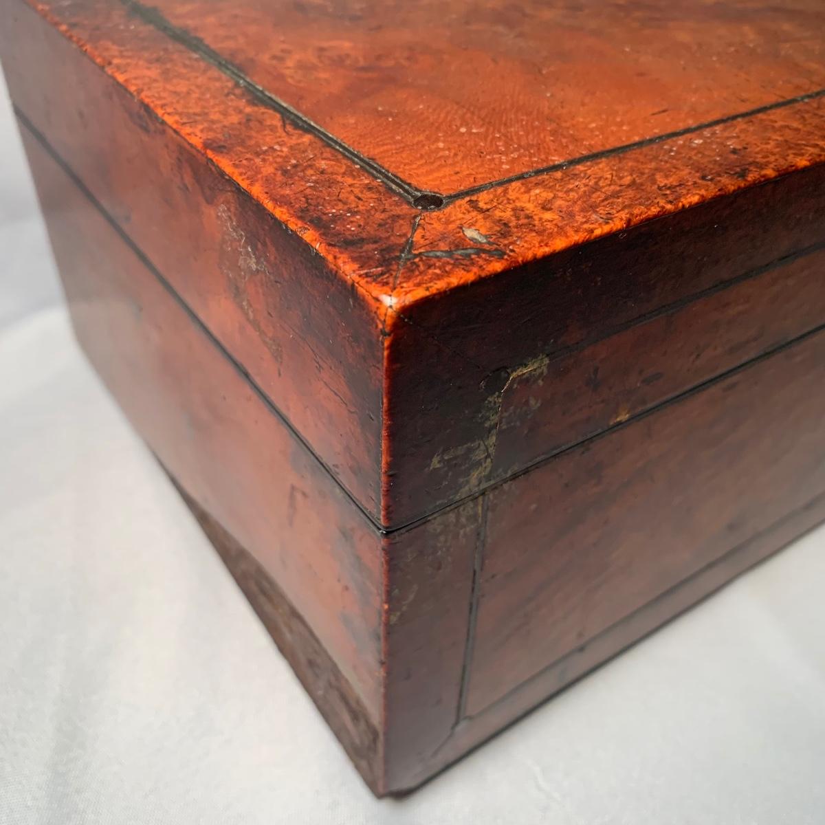 Lot includes two wooden boxes. The largest box measures, 12"L x 8”W x 5”H. This box has a mother of pearl-like inlay and locking mechanism with key (non-functioning). Both boxes have blemishes, but are unique and beautiful pieces. They open and close with ease. Please see photos for more details.