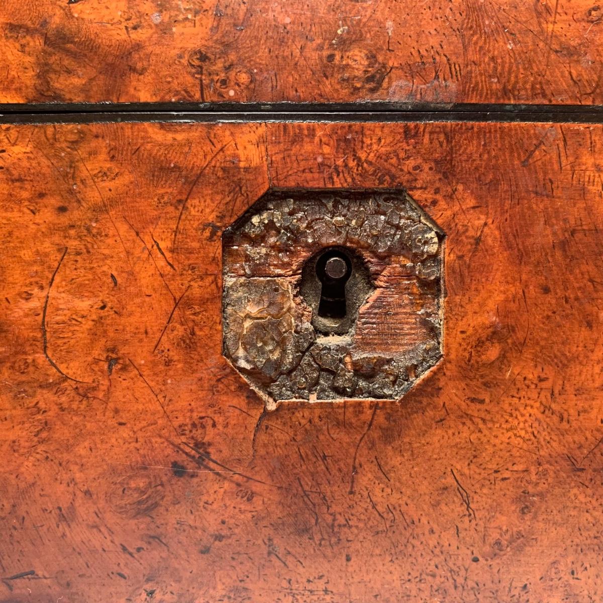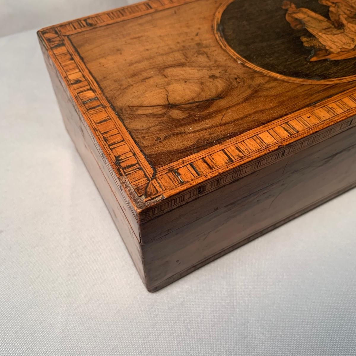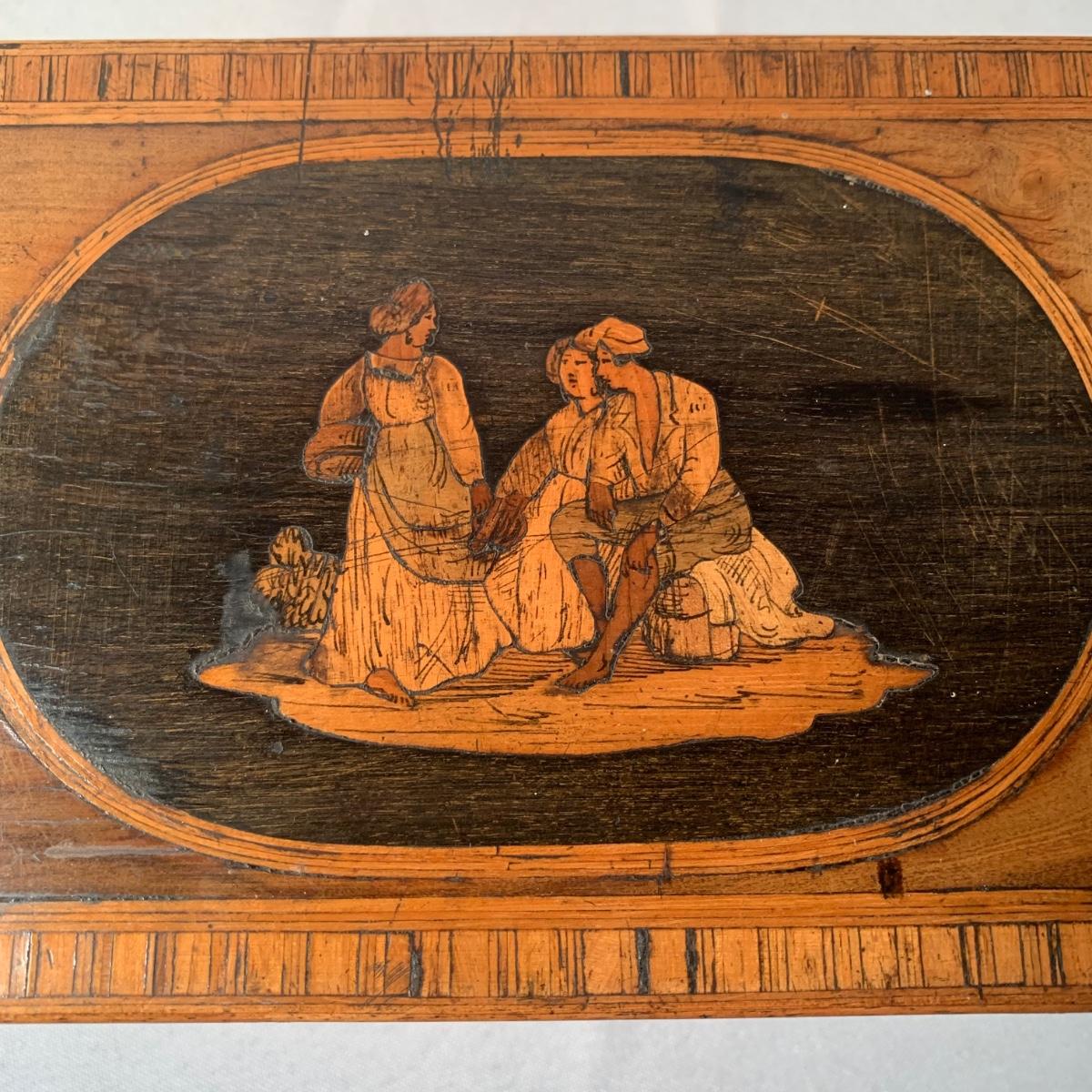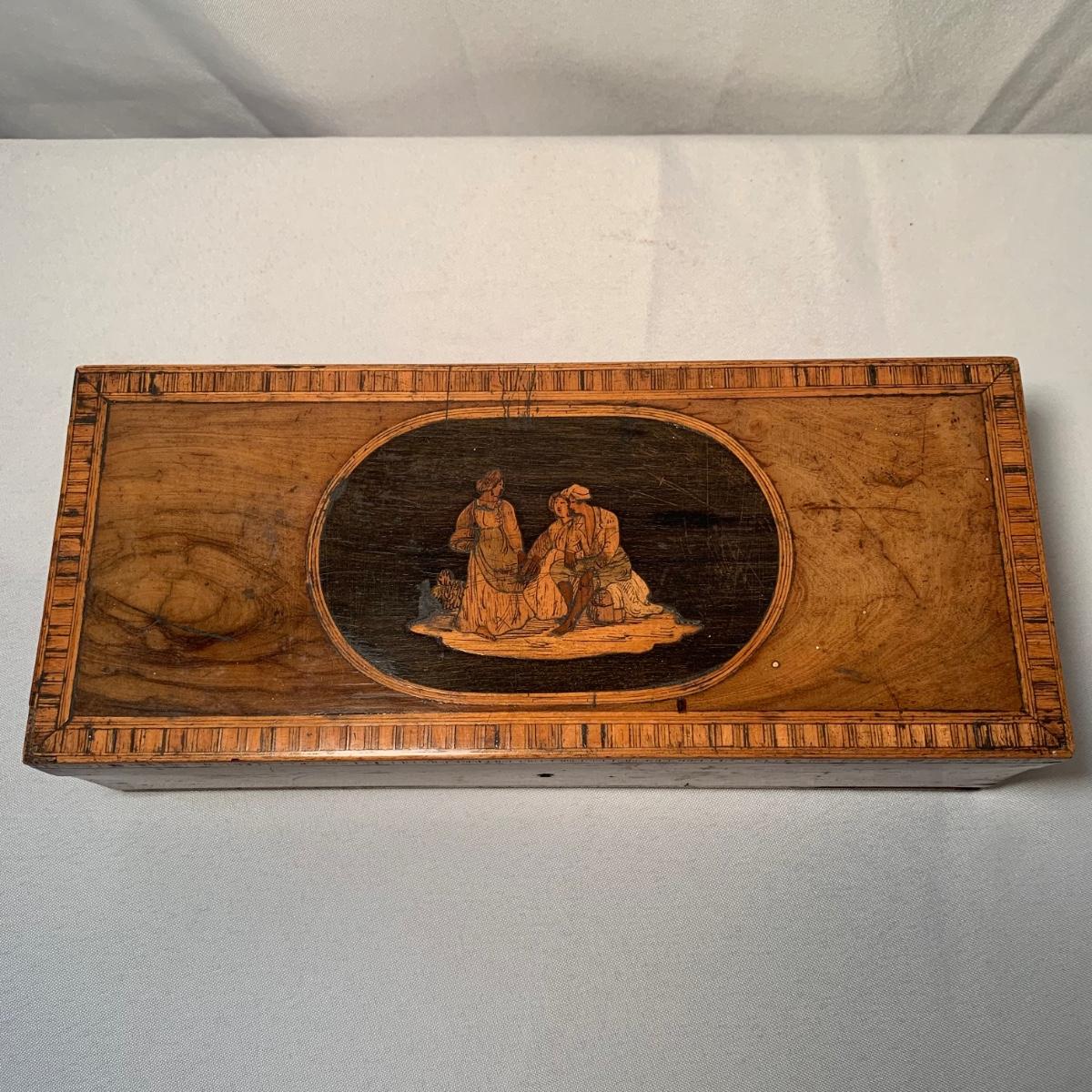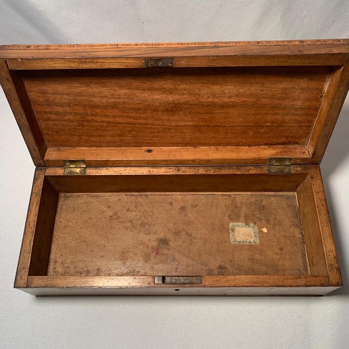 Lot includes two wooden boxes. The largest box measures, 12"L x 8”W x 5”H. This box has a mother of pearl-like inlay and locking mechanism with key (non-functioning). Both boxes have blemishes, but are unique and beautiful pieces. They open and close with ease. Please see photos for more details.
