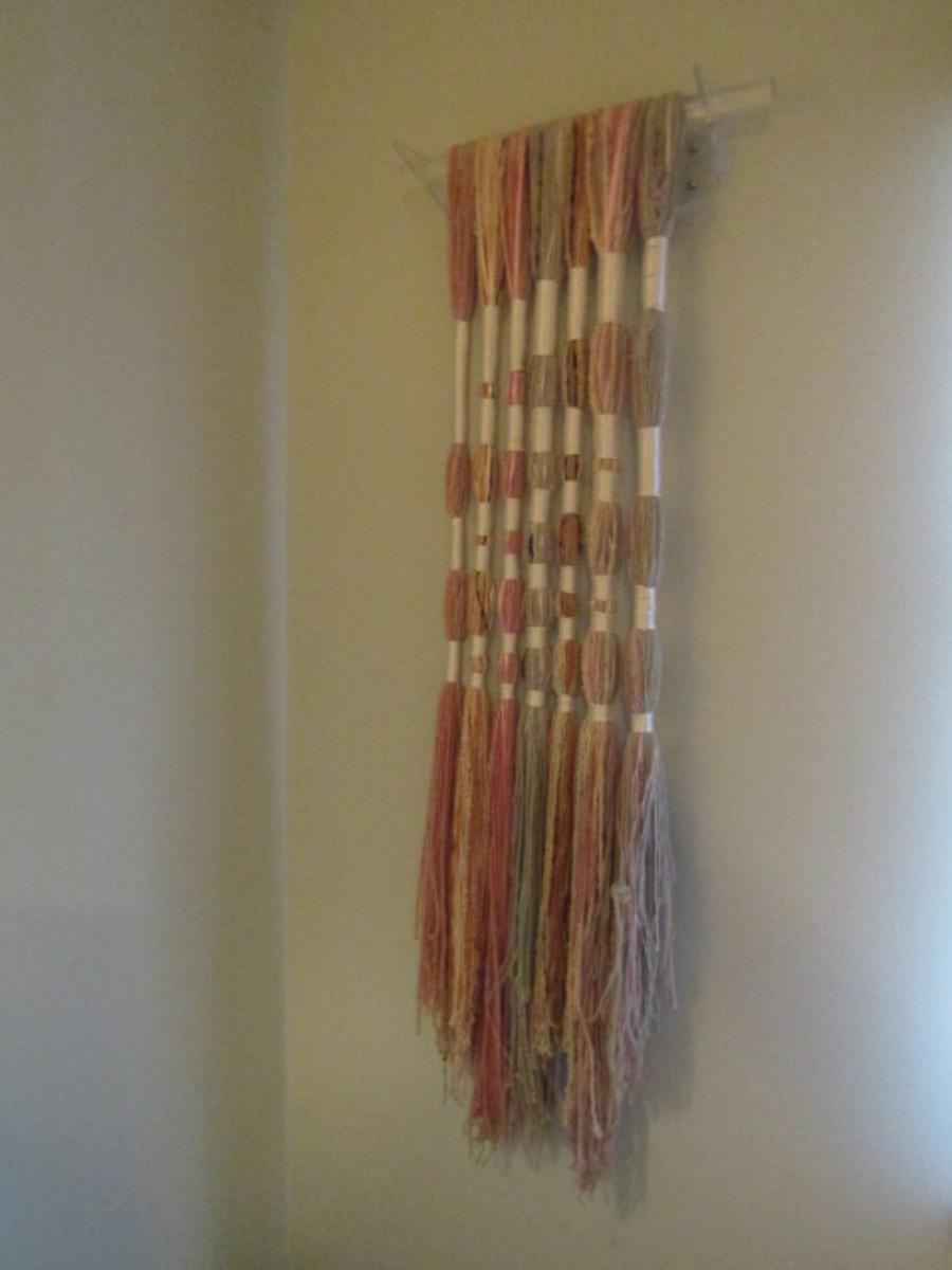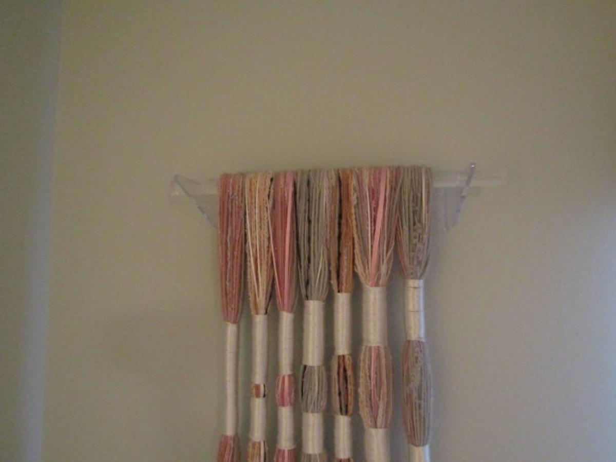 Handcrafted Fiber Art with Acrylic Bracket and Rod for Hanging. Beautiful, multi-color, with small seashell accents. This is a must see!