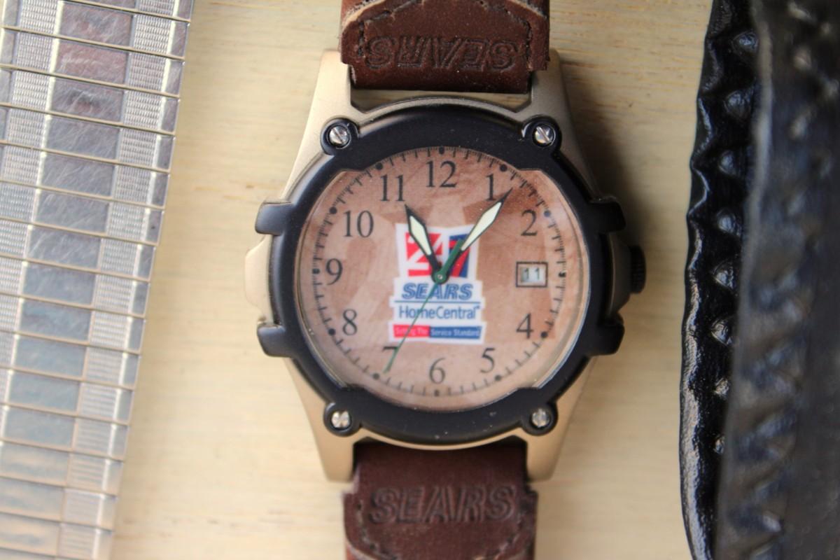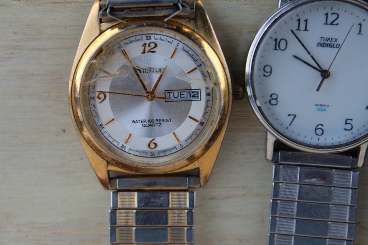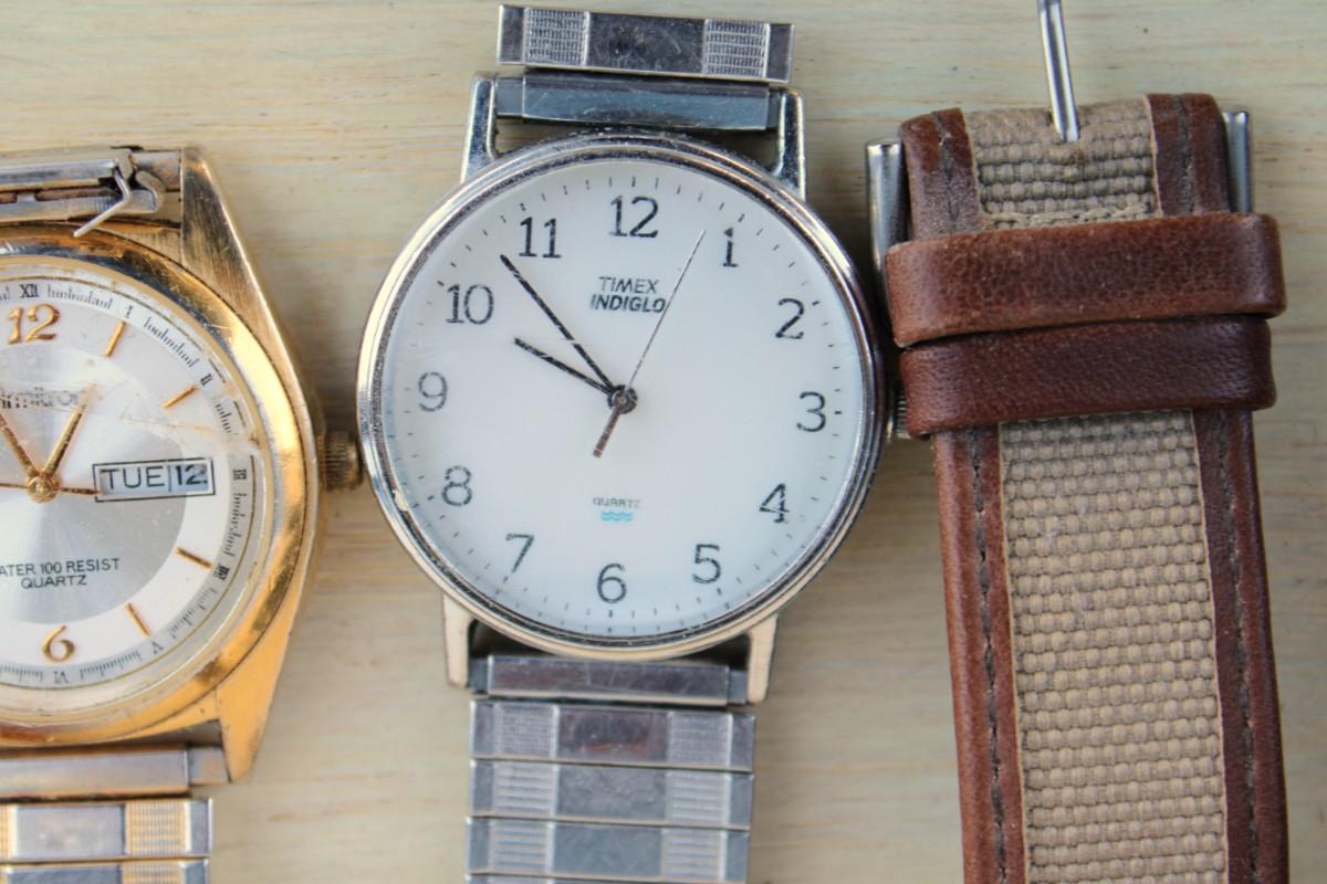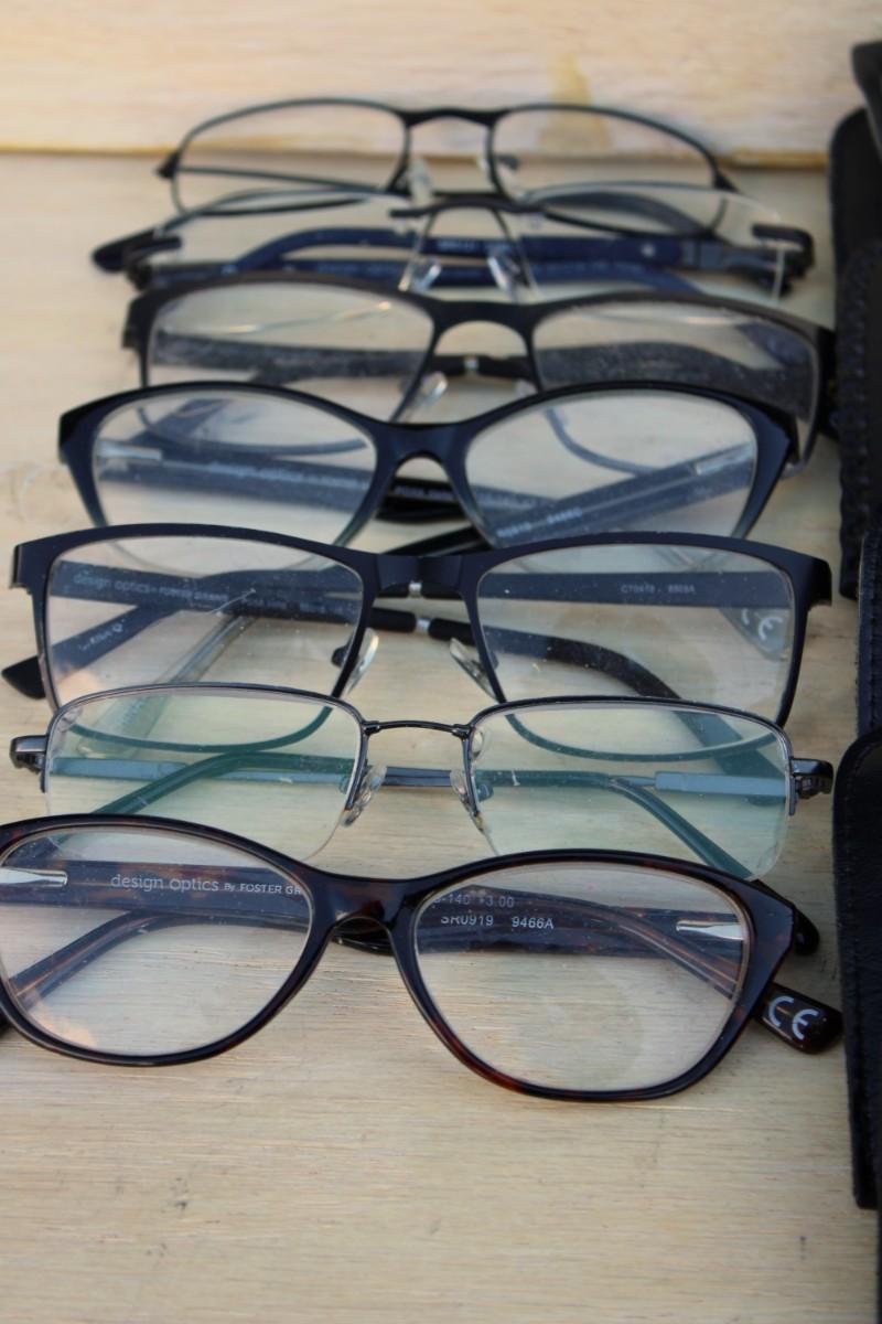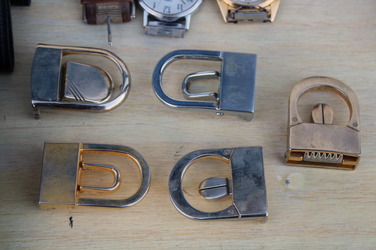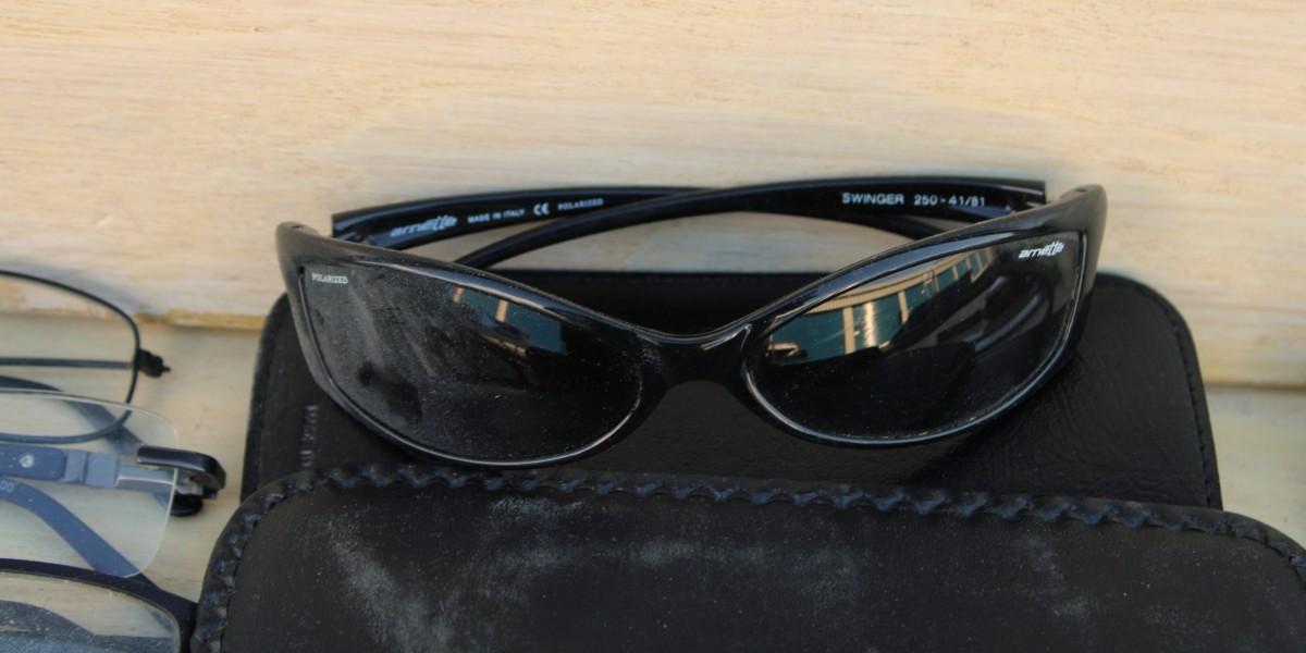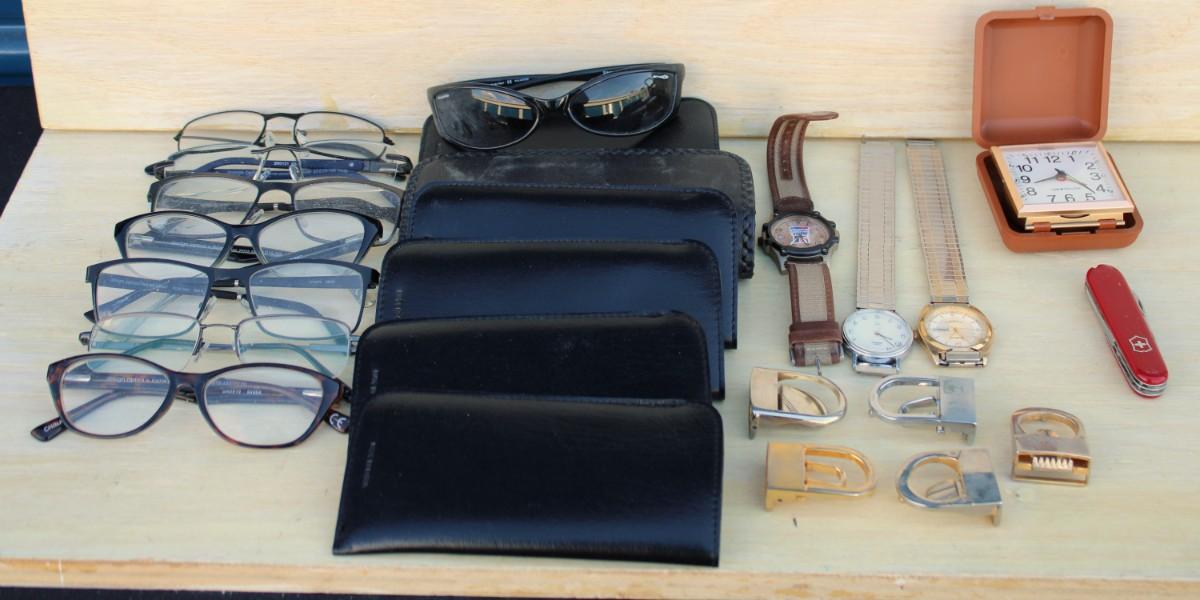 Eyeglasses. Sunglasses, eyeglass cases, watches, small clock, Swiss army knife and belt buckles