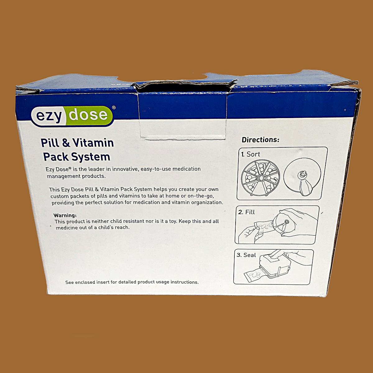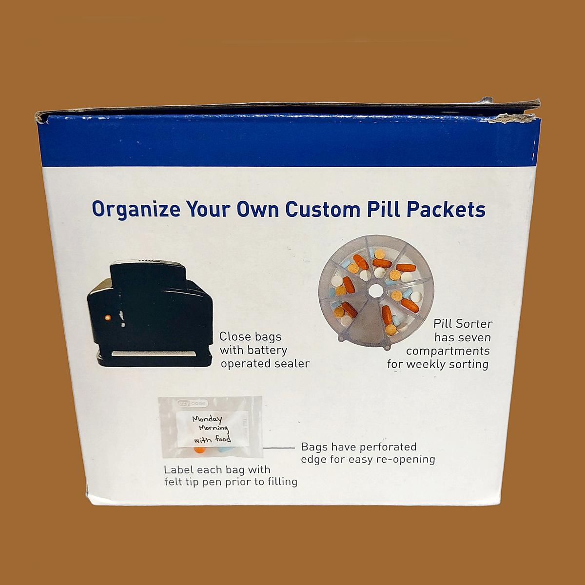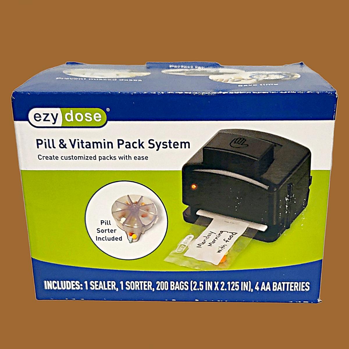 The Ezy Dose Pill and Vitamin Pack System helps you create your own custom packets of pills and vitamins to take at home or on the go, providing the perfect solution for medication and vitamin organization. Close bags with battery operated sealer Organize and customize and use the label area to personalize the pouch.