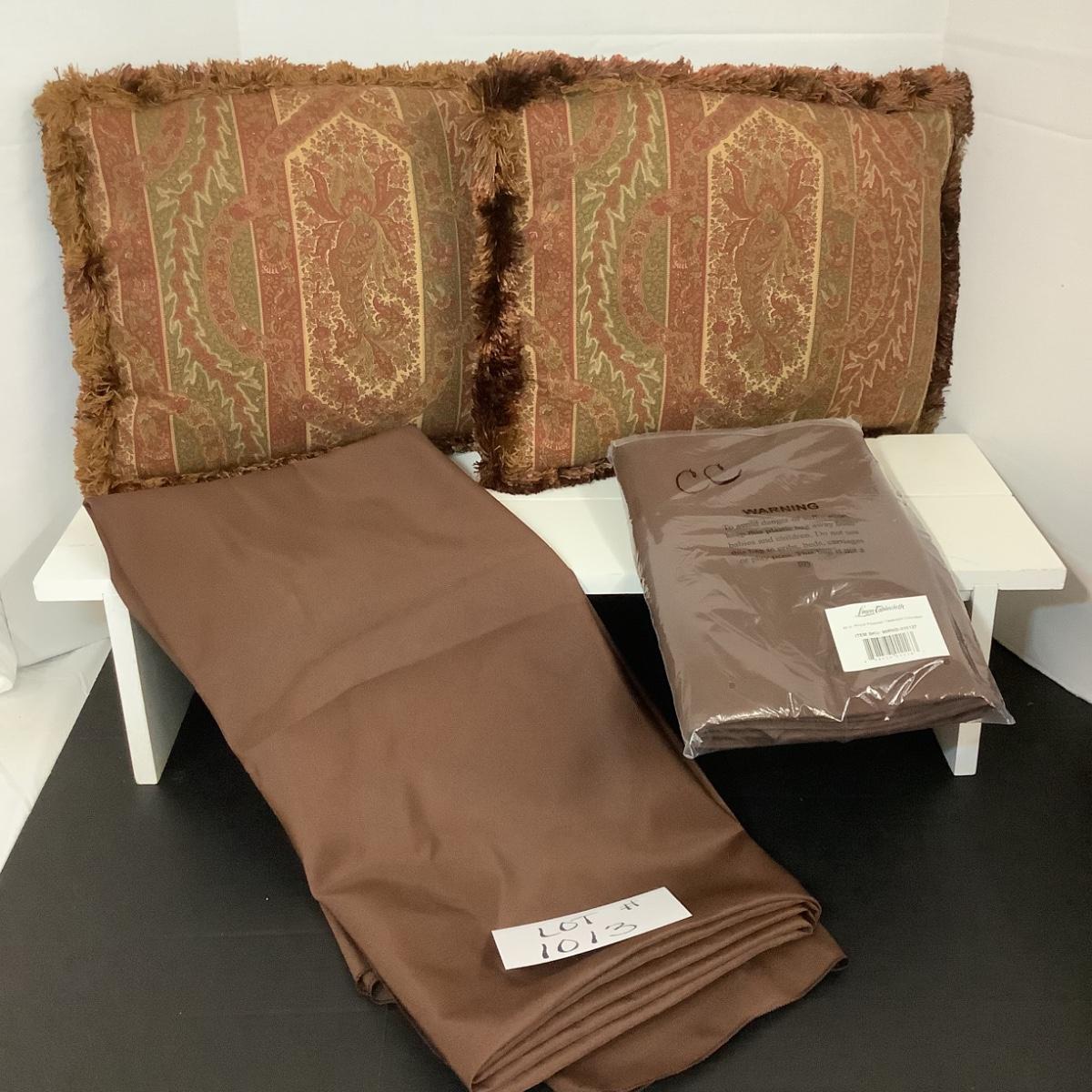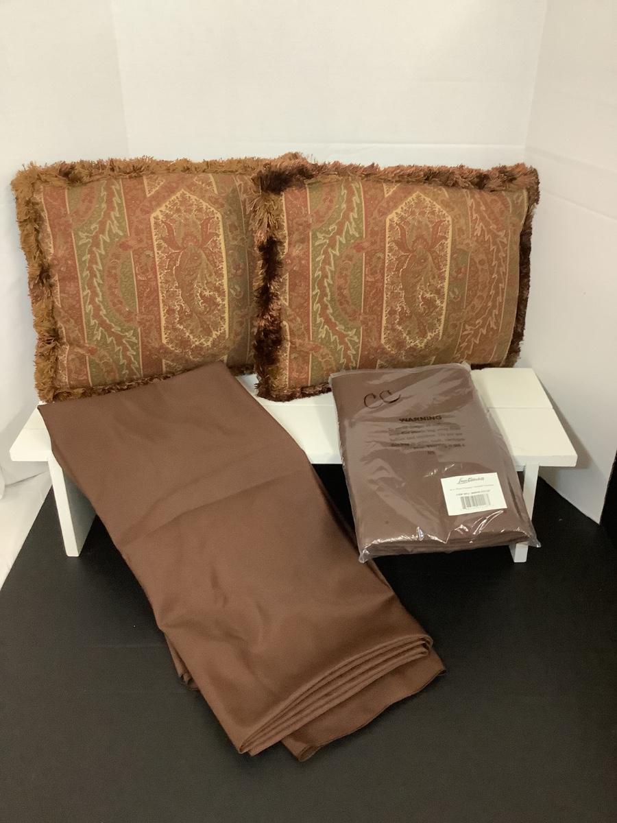 F - 1013  Pair of Beautiful Brown Paisley Pillows & Pair of Chocolate Brown Round Table Cloths