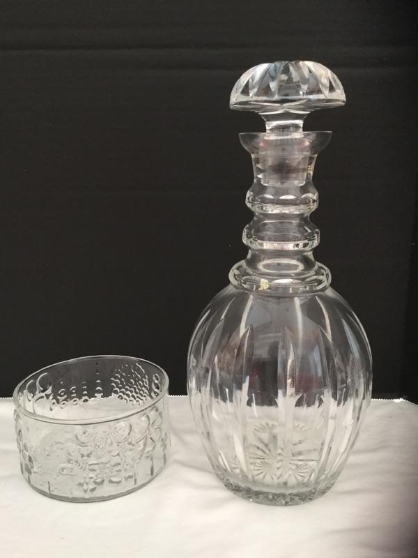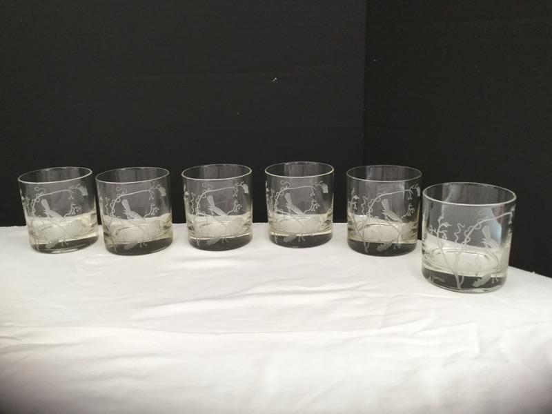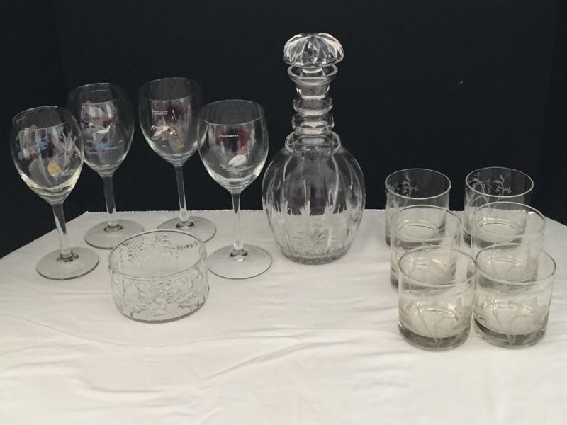 F - 1022. J. James SIGNED EtchedGlasses, Painted Glasses, Bowl & Decanter