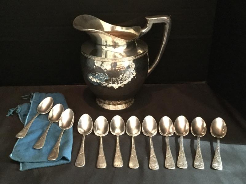 F - 1044. Community Silver Plate Spoons, B.S. & Co. Pitcher
