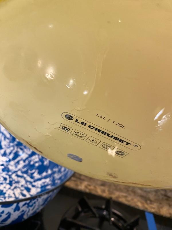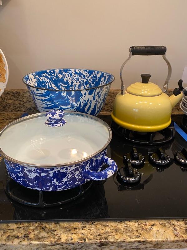 F - 1049  Le Crueset Kettle with 2 Blue and White Spatterware