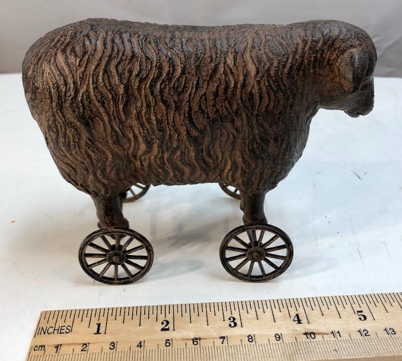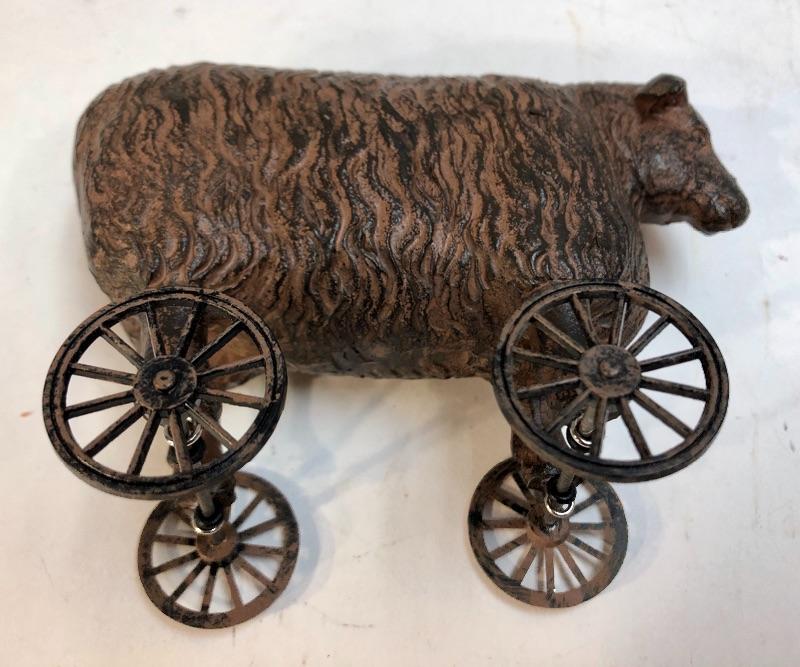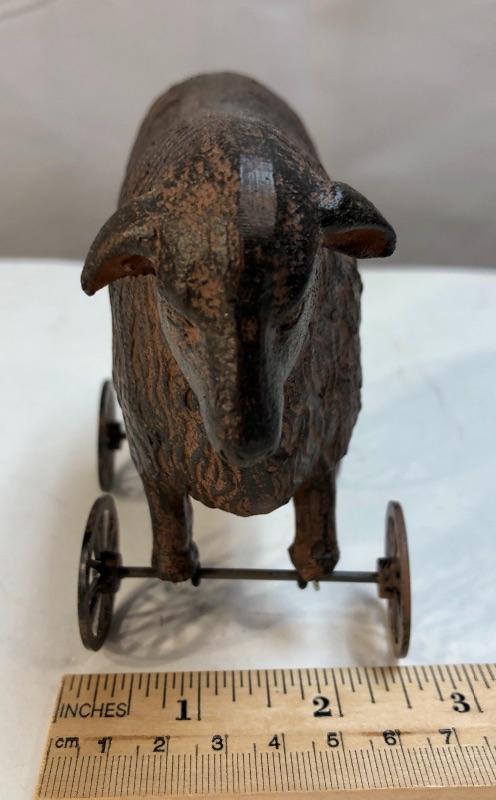 Small 5" metal sheep push toy replica. Great for rustic farmhouse deco