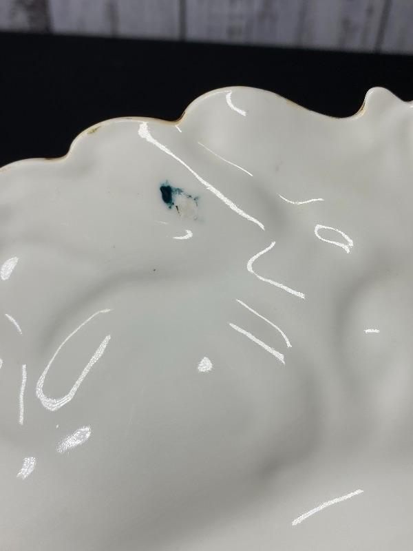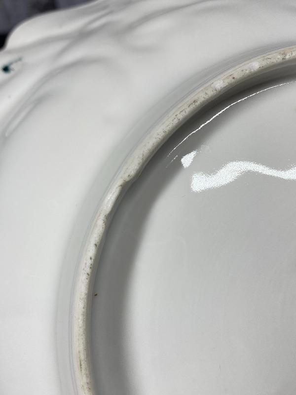 Beautiful porcelain serving bowl. Unmarked. Green and off white swirl design with flowers. Displays nicely. A couple small chips on the underside, not noticed from top side. About 10" size. #24-30017