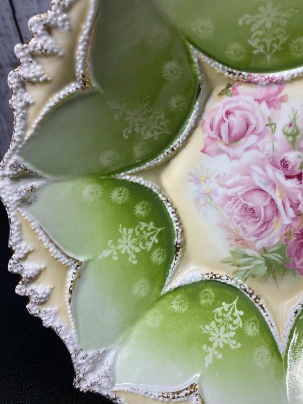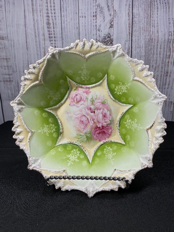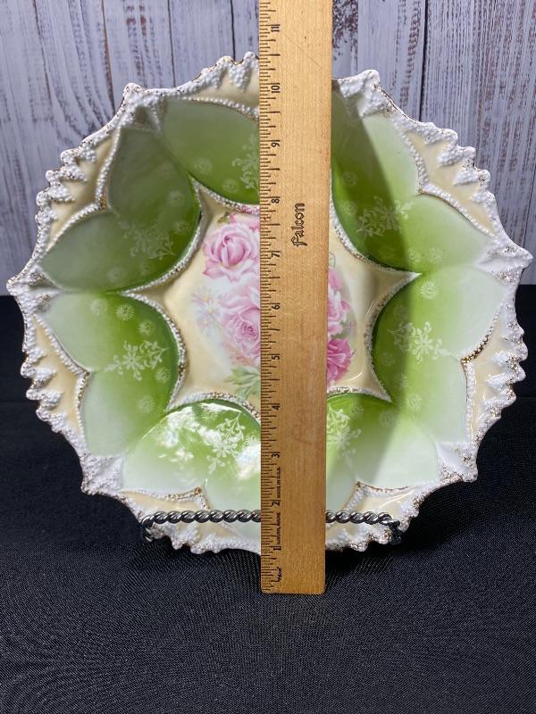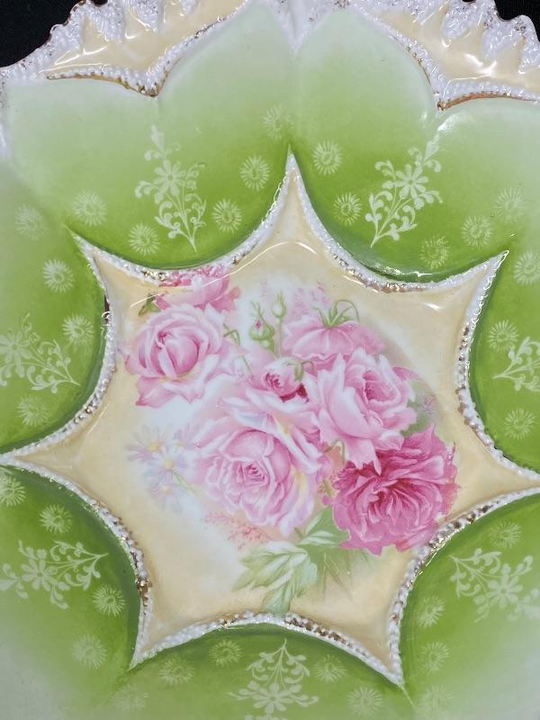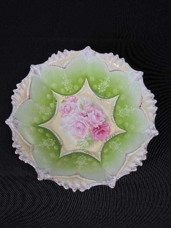 Antique RS Prussia pink rose porcelain bowl. Fluted star shape bowl. Pink roses at the center with a contrasting green makes the pattern stand out. About 11" size. In good condition, displays nicely. Marked on the bottom, no damage noticed. #24-30018