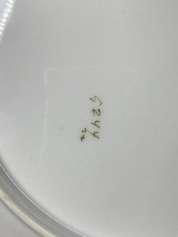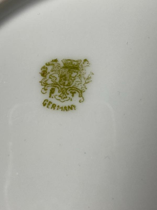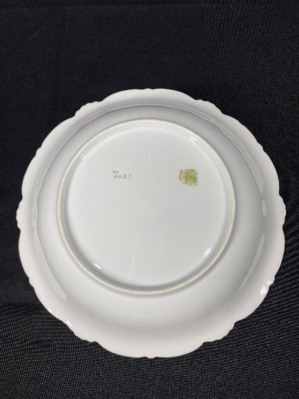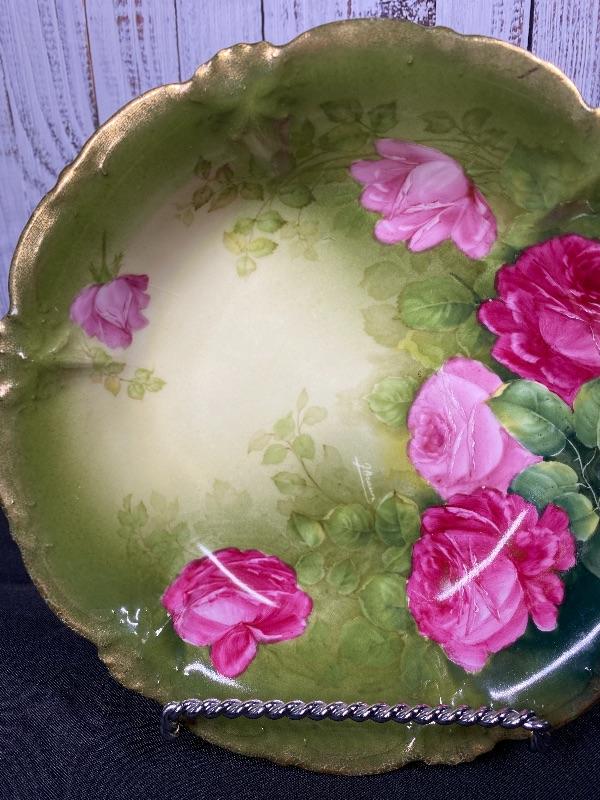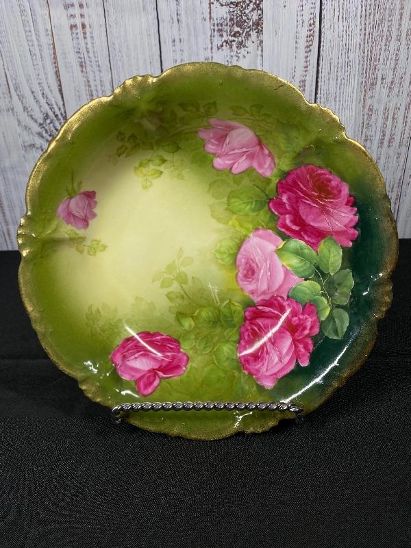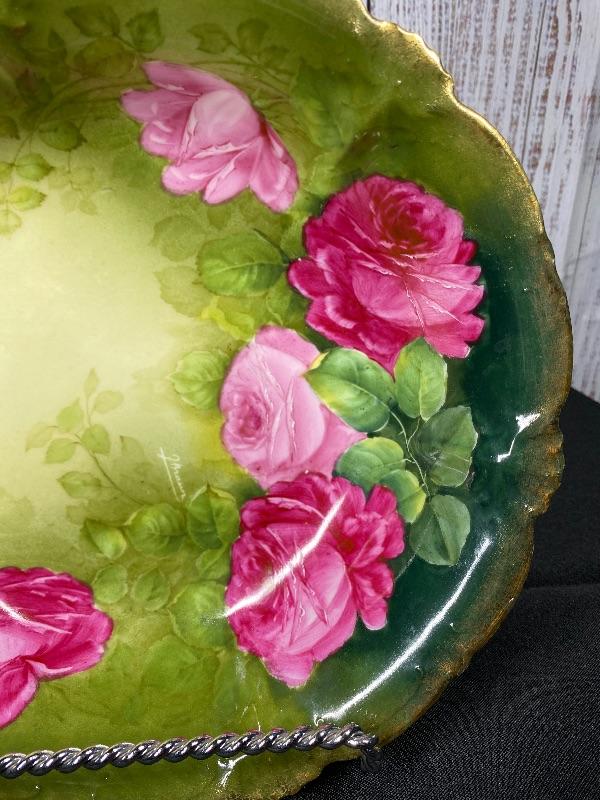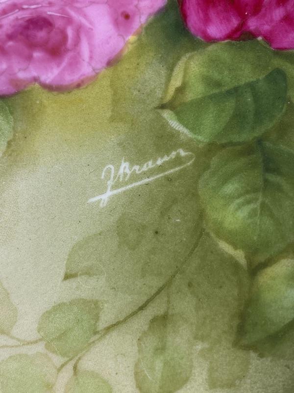 Beautiful deep green porcelain serving bowl with pink roses. Signed by artist J. Braun. Back is stamped PT Germany. Slight scallop to the edge. About 10" size. Displays great.