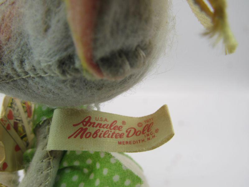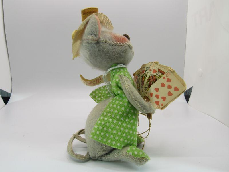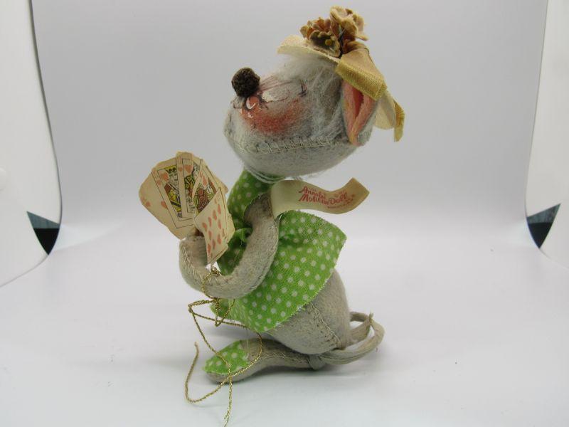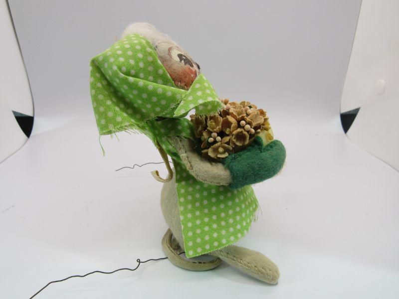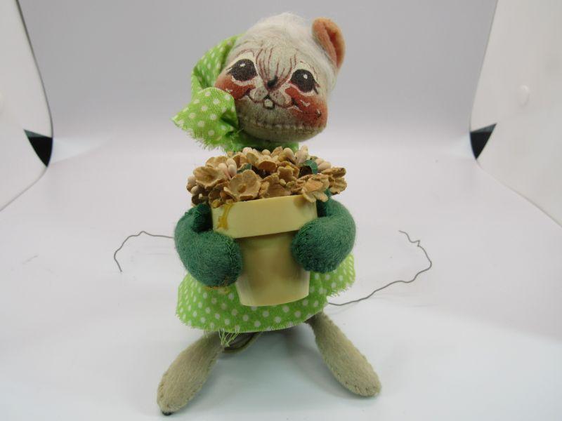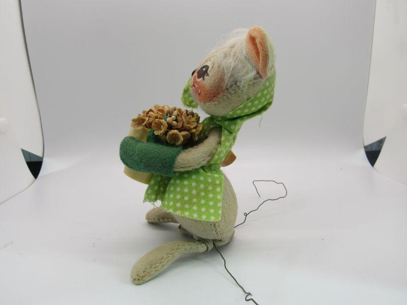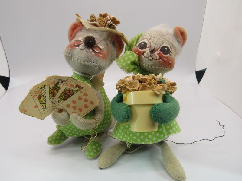 Pair of vintage Annalee Mobilitee Dolls. Cute grey mice plush wear bright green polka dot outfits. One is holding playing cards, the other a flower pot. Great springtime decor.