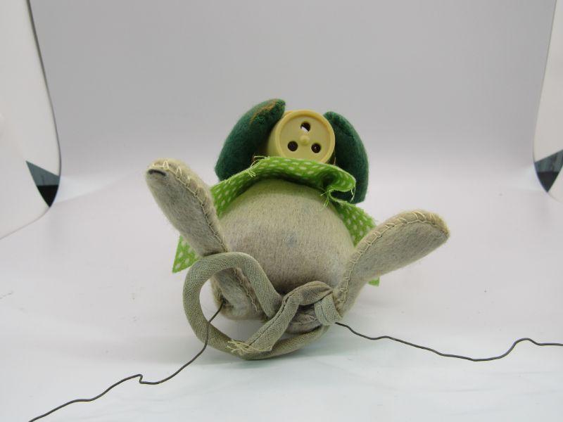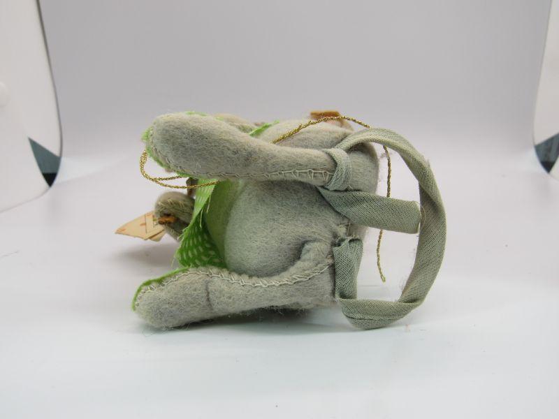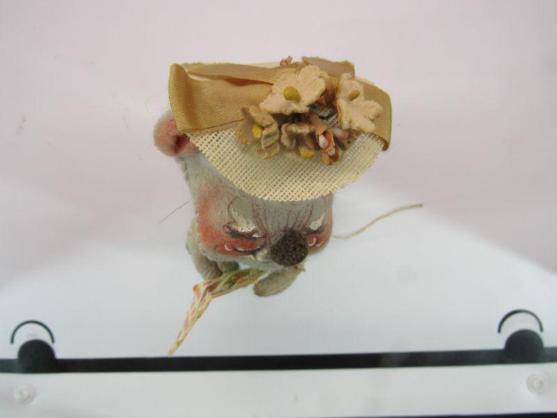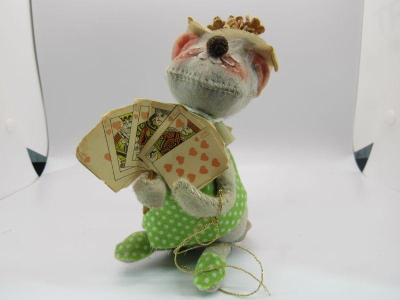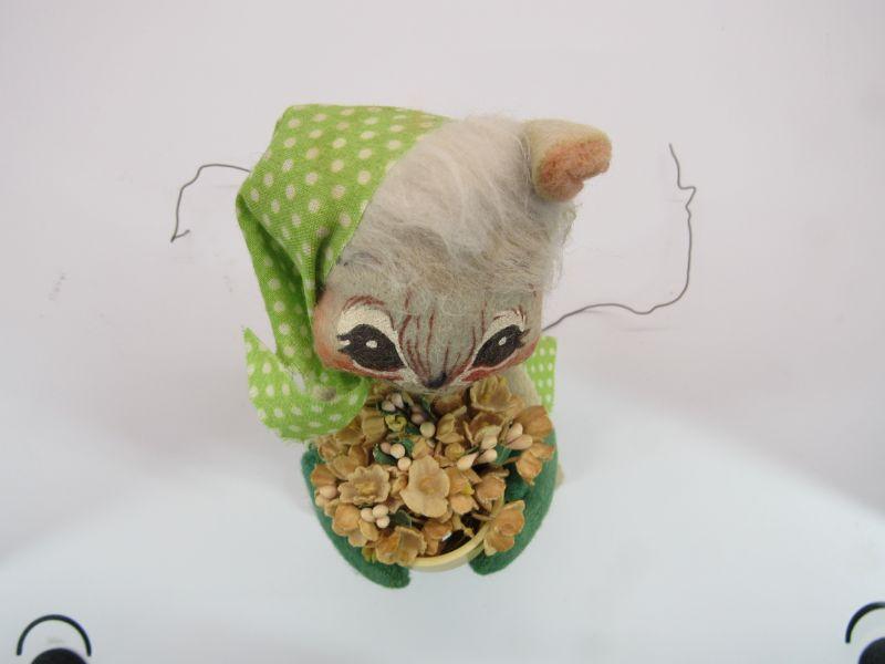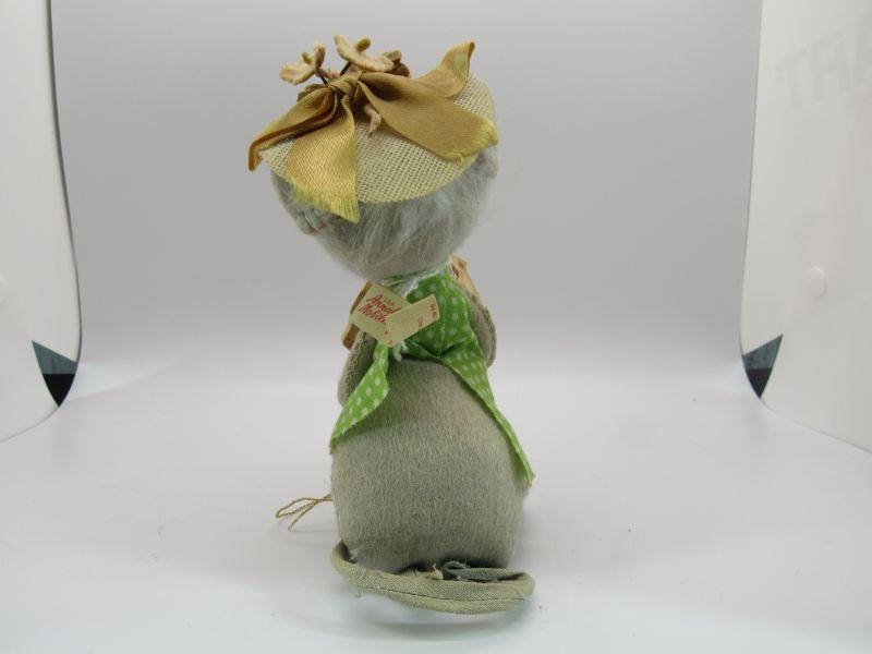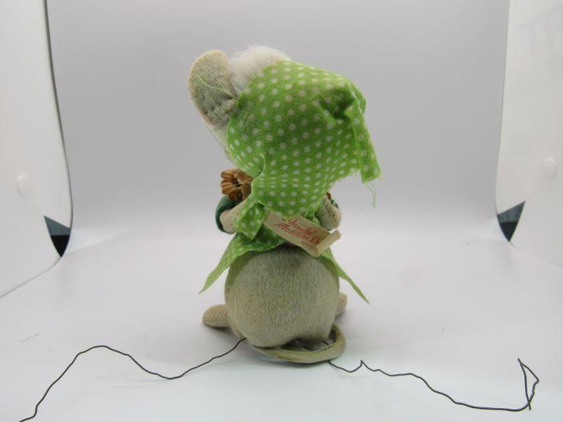 Pair of vintage Annalee Mobilitee Dolls. Cute grey mice plush wear bright green polka dot outfits. One is holding playing cards, the other a flower pot. Great springtime decor.