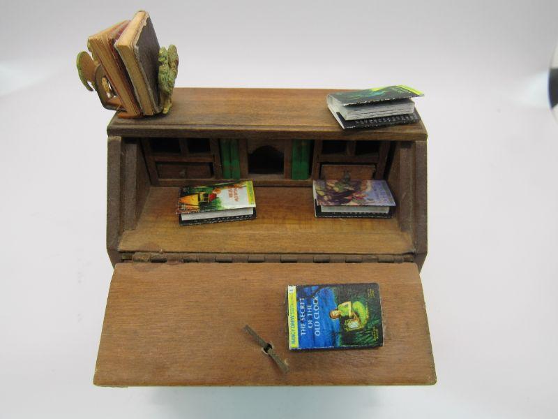 Vintage dollhouse miniature secretary desk with books. Fold down front with drawers. Perfect dollhouse size. Various books including some Nancy Drew. Displays nice. #499a35
