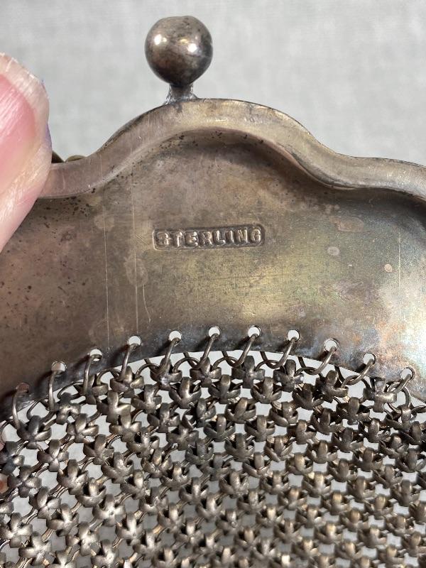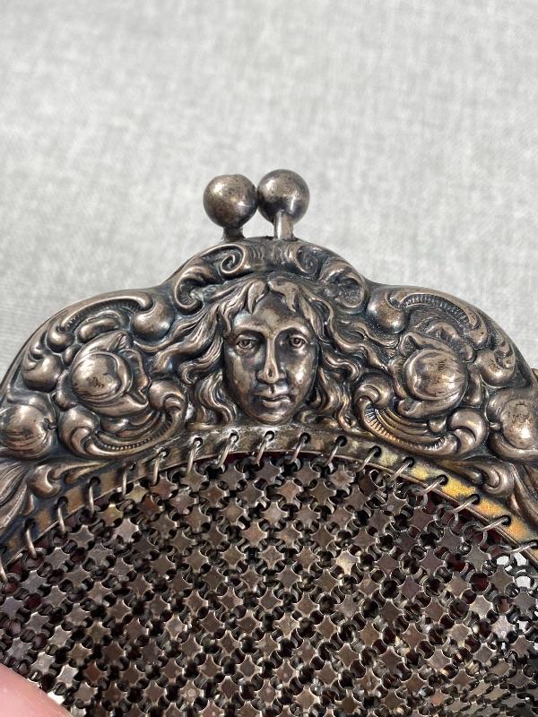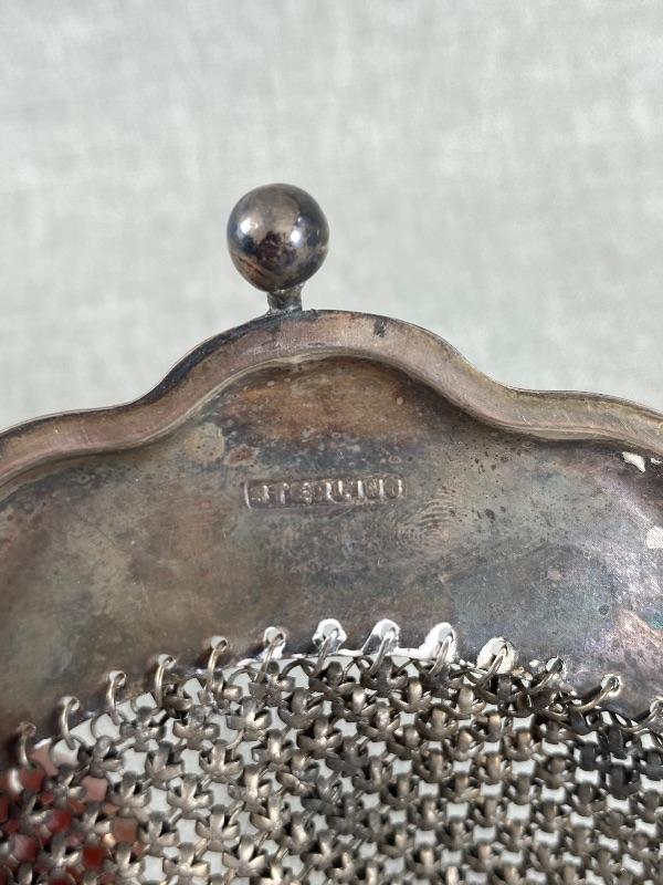 Antique sterling silver mesh purse. Art nouveau flapper style bag, made of a chainmail like mesh. Great figural frame. Stamped Sterling on the inside. In really good condition, no holes in the mesh. Measures about 8' with the chain handle. #020-00345