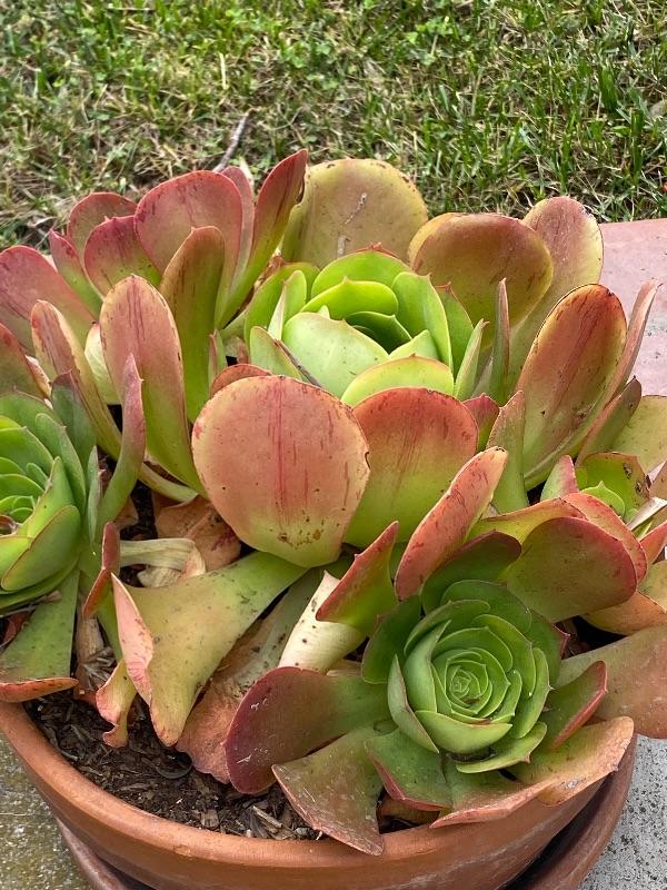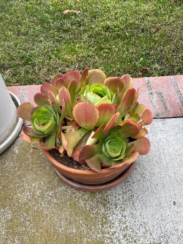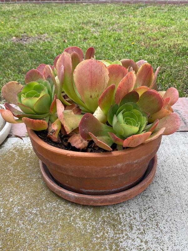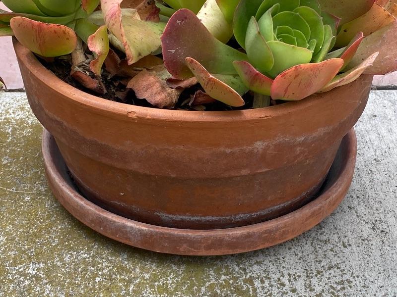 Shallow terra cotta pot with drip tray. Holding multiple succulent plants. #24-50019