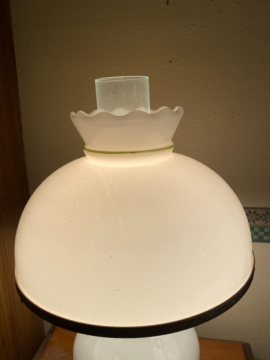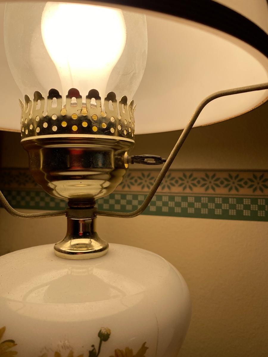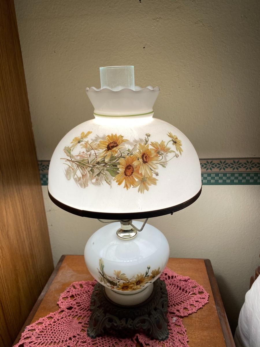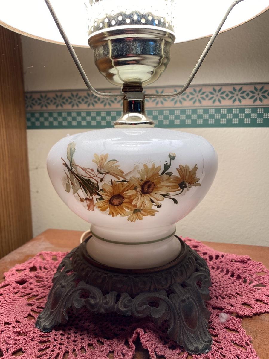 Vintage wildflower painted table lamp. White glass base and shade with floral design. Under 20".