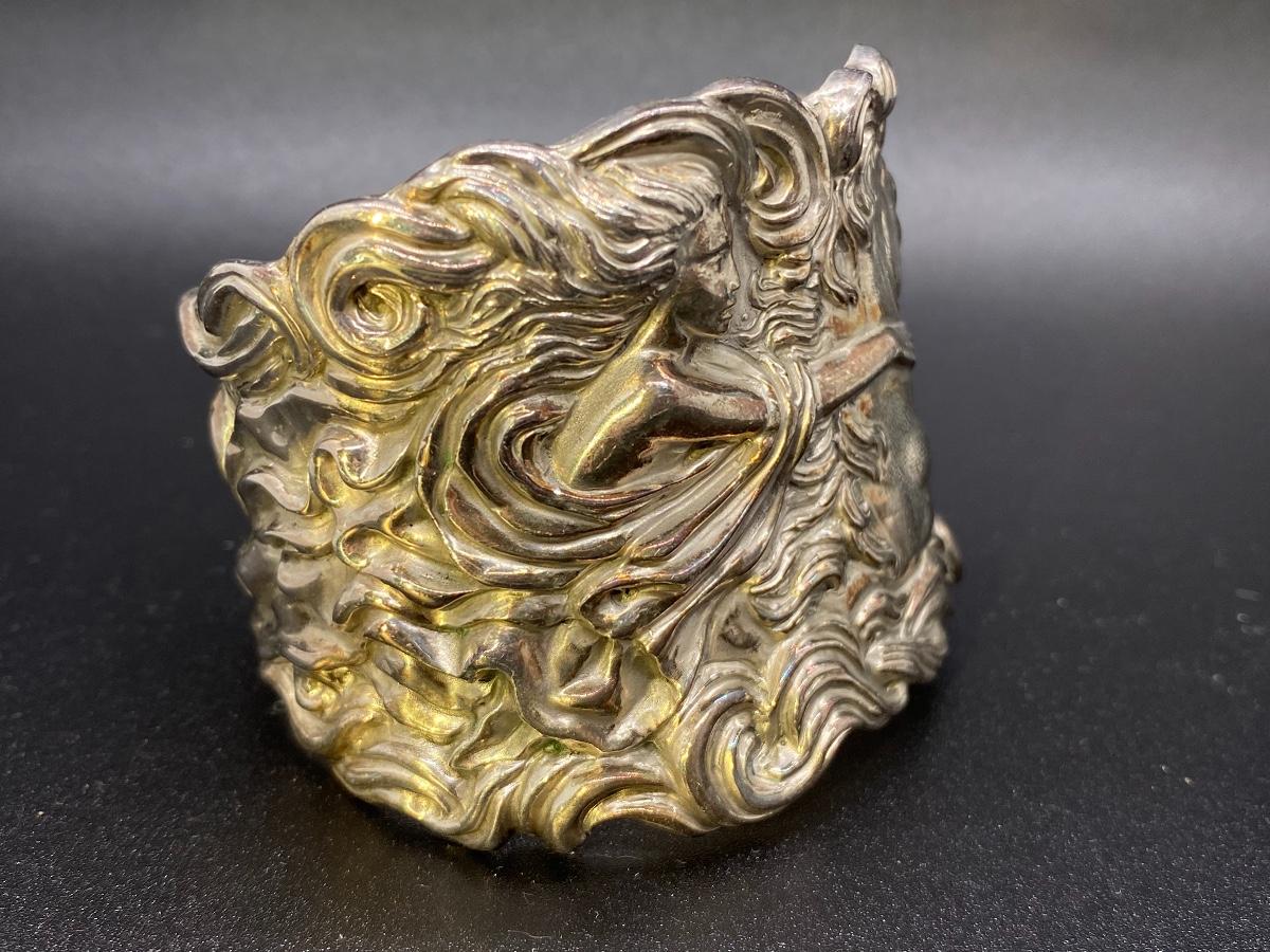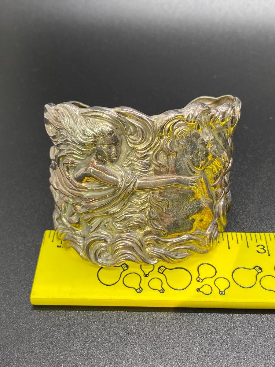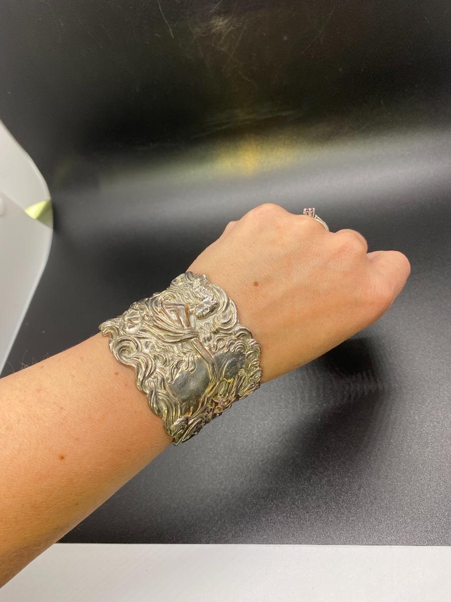 Silver tone Art Nouveau inspired cuff bracelet. Features a whimsical woman with horse design. No sterling or maker marks. Adjustable with a little bending. About 2" wide.