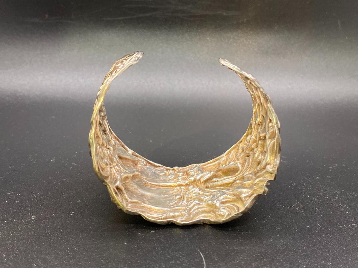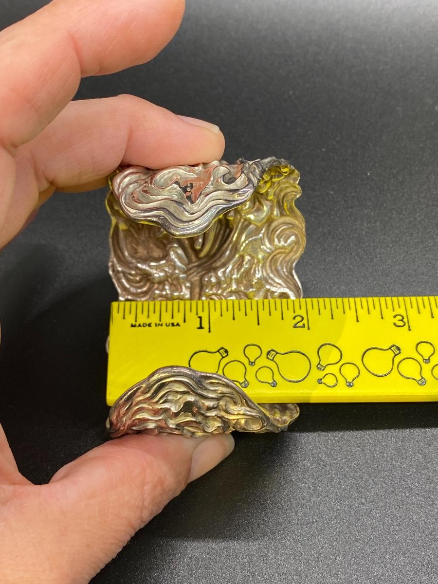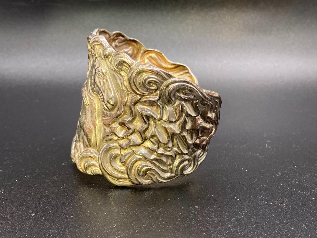 Silver tone Art Nouveau inspired cuff bracelet. Features a whimsical woman with horse design. No sterling or maker marks. Adjustable with a little bending. About 2" wide.
