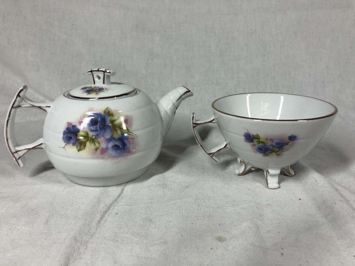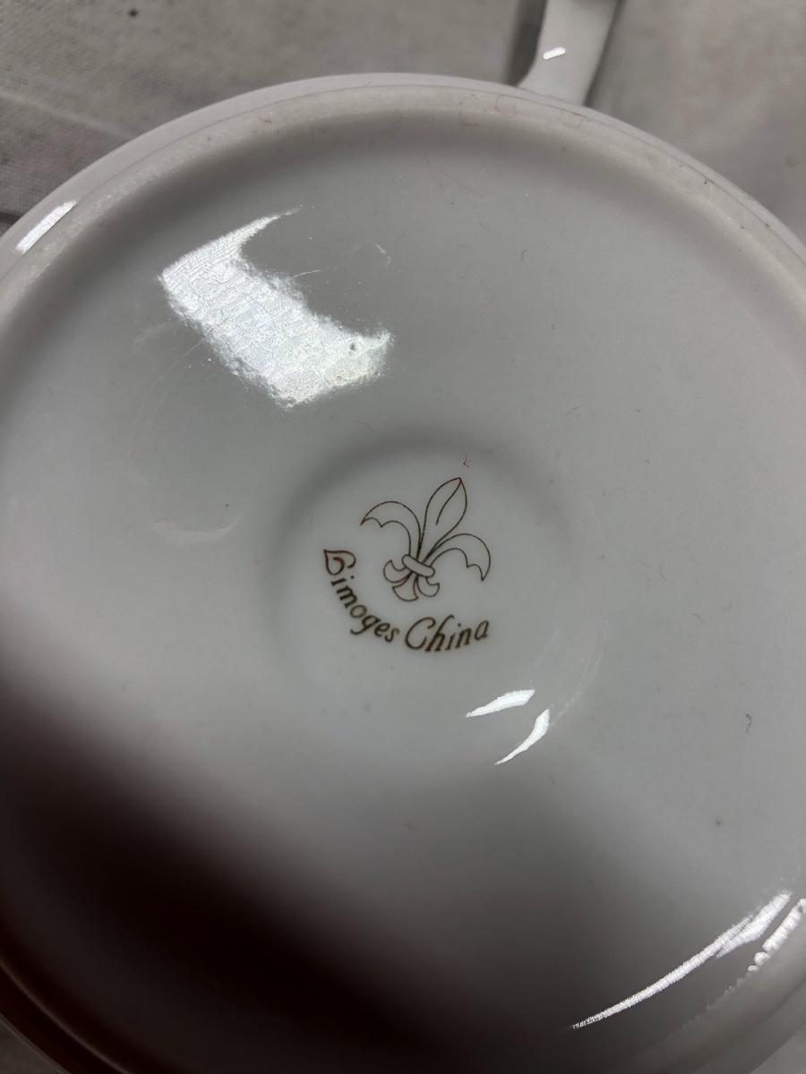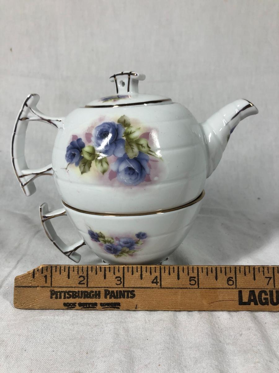 Limoges china tea cup and teapot set. Stacking set. Blue rose pattern. In good condition. Smaller 6" size.