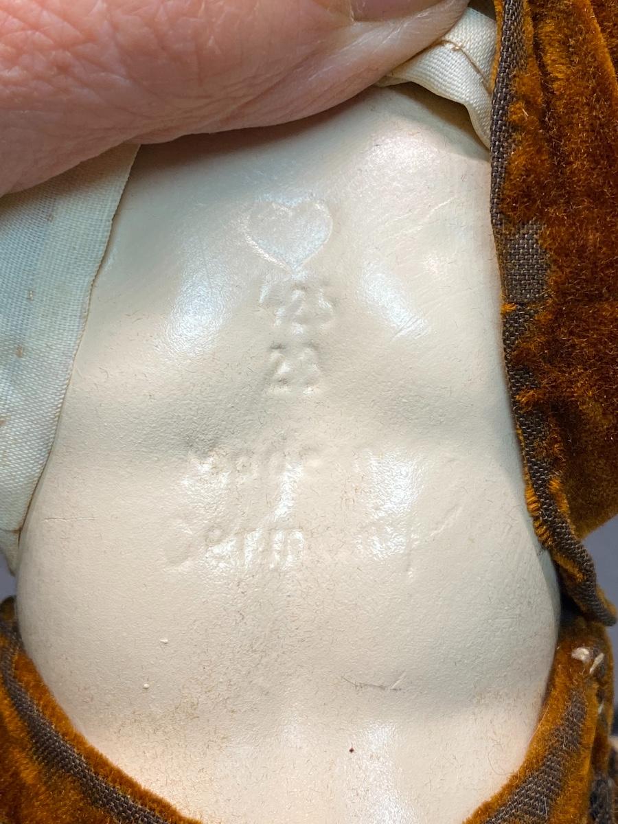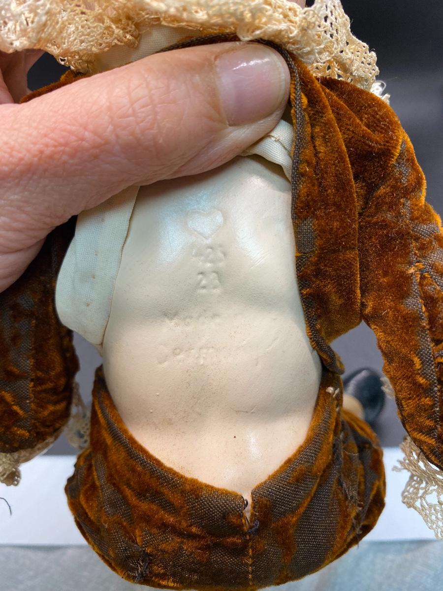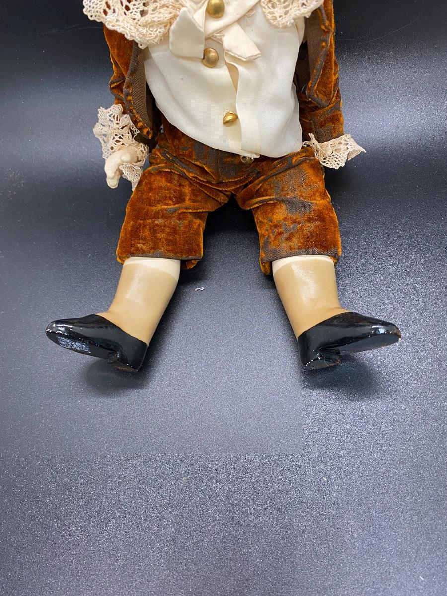 Vintage bisque boy doll. Completely bisque jointed doll. Painted features. Marked on the back ❤ 425 23 Made in Germany. Velvet outfit has signs of age. Doll is in good condition. About 10" size. Socks and shoes are painted on.