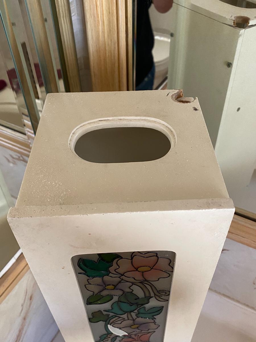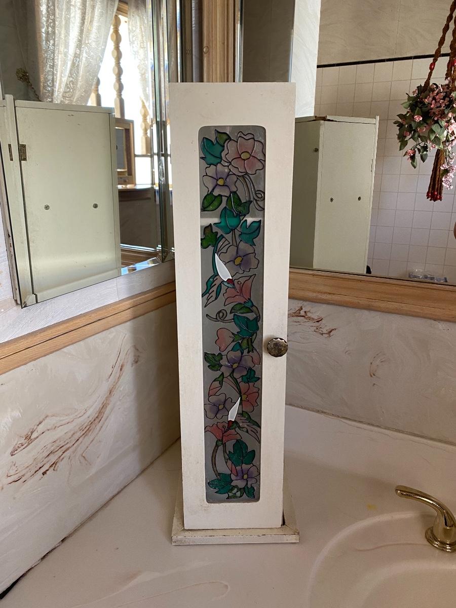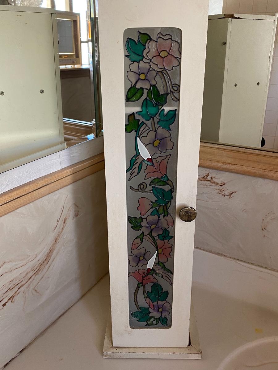 Flowers and Hummingbirds Stained Glass Front Toilet Paper Tissue Holder Stand Cabinet. Holds extra TP in cabinet and the top comes off for tissue box. There is a damaged spot on top corner. About 26" tall.