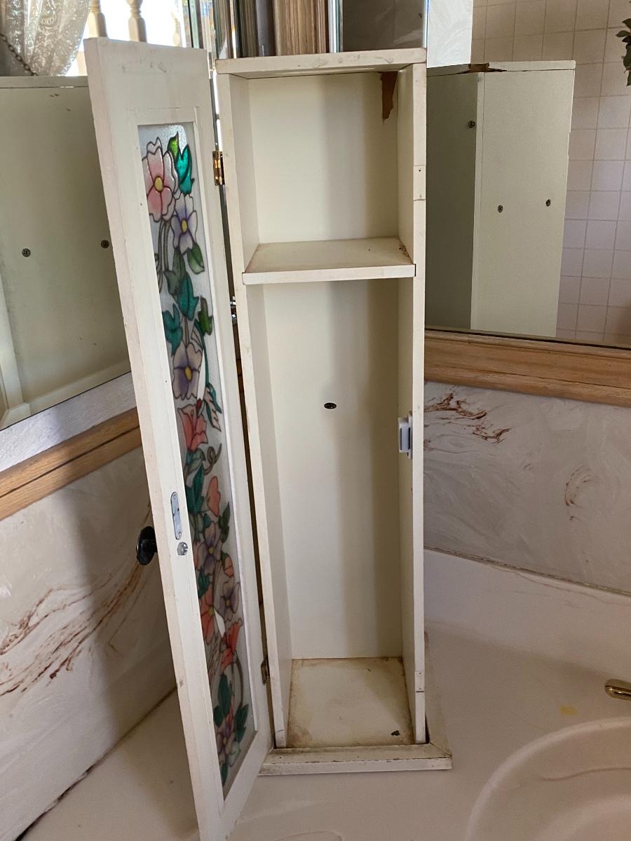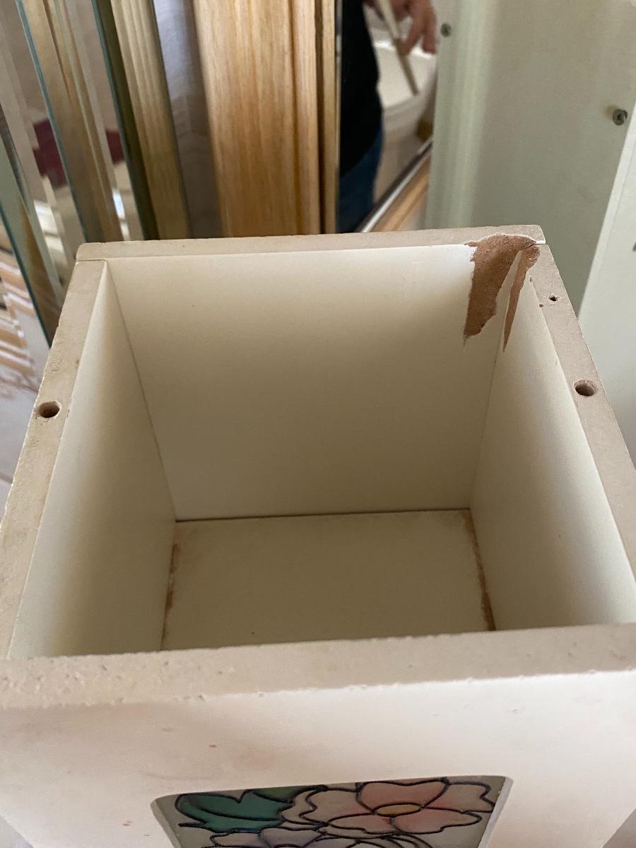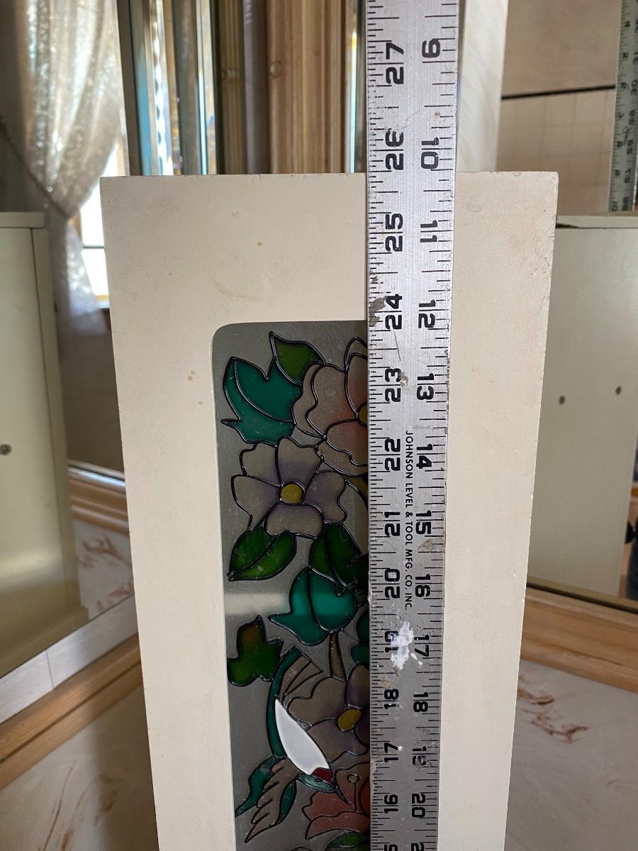 Flowers and Hummingbirds Stained Glass Front Toilet Paper Tissue Holder Stand Cabinet. Holds extra TP in cabinet and the top comes off for tissue box. There is a damaged spot on top corner. About 26" tall.