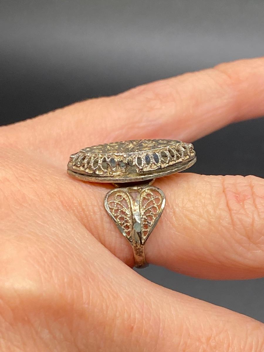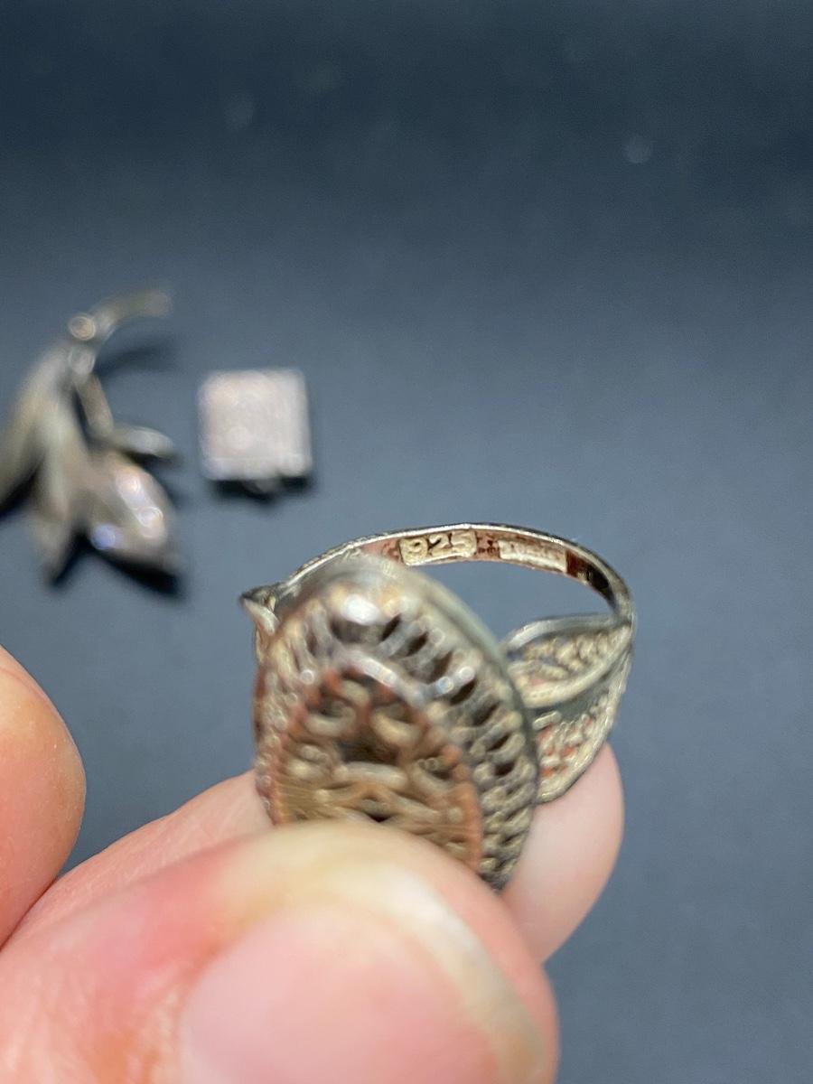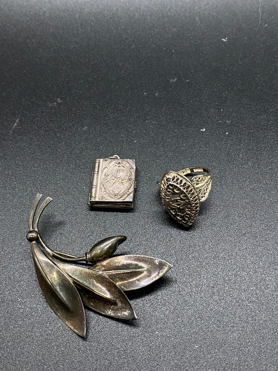 Vintage Sterling Silver Jewelry Lot. Includes a flower pin, a beautiful filigree style ring (size 6), and a 1983 Mothers Day locket. The locket is not marked, may be silver plate, the other pieces are marked either sterling or 925.