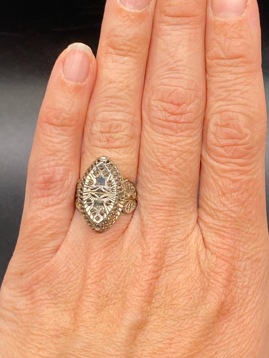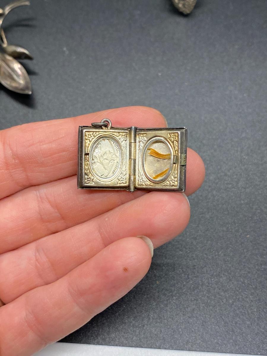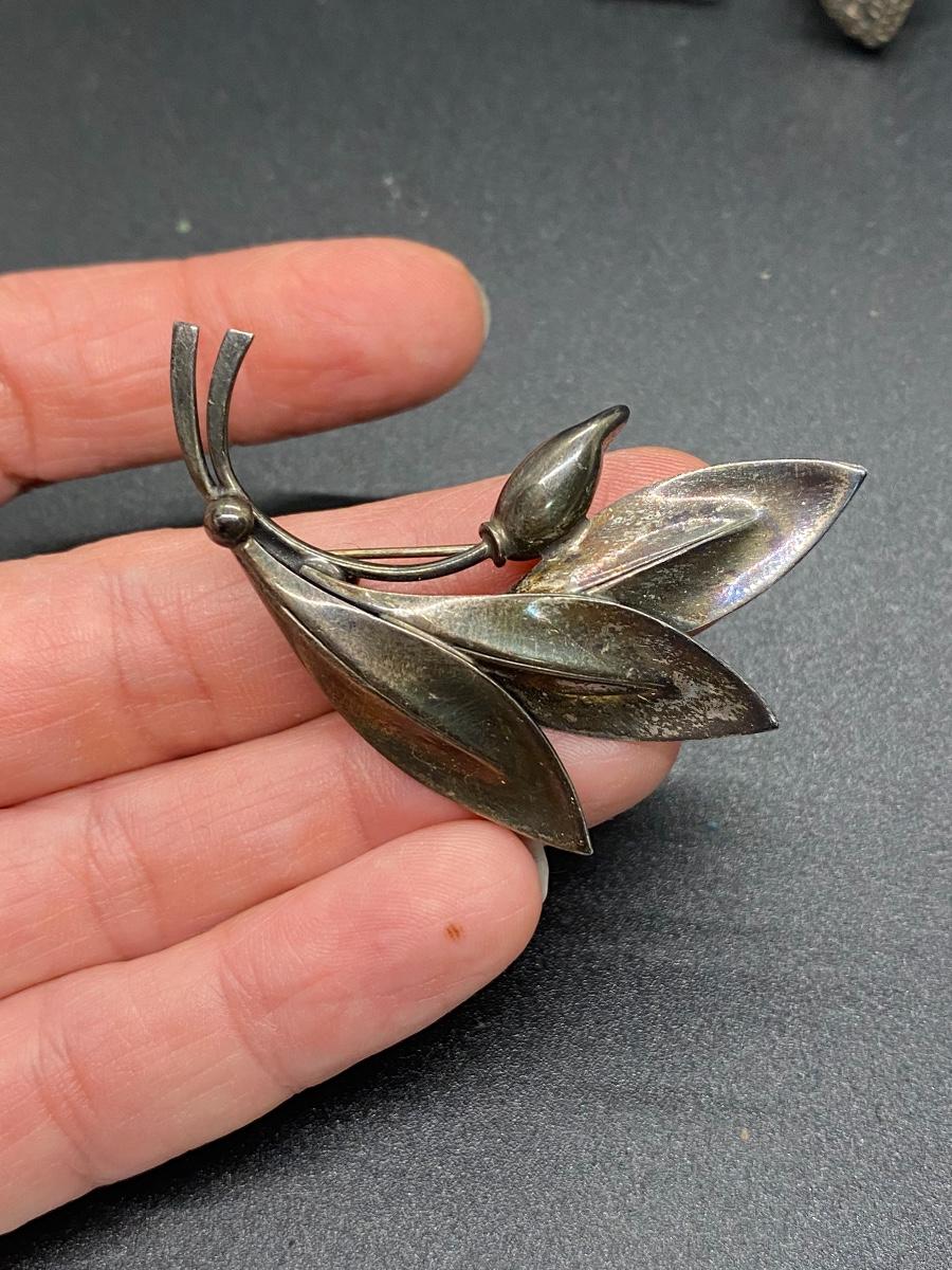 Vintage Sterling Silver Jewelry Lot. Includes a flower pin, a beautiful filigree style ring (size 6), and a 1983 Mothers Day locket. The locket is not marked, may be silver plate, the other pieces are marked either sterling or 925.