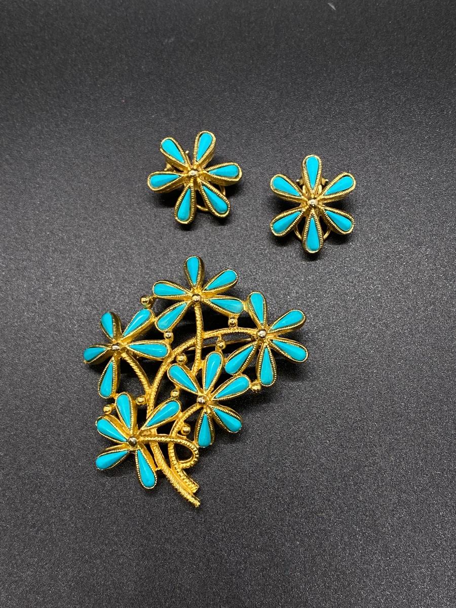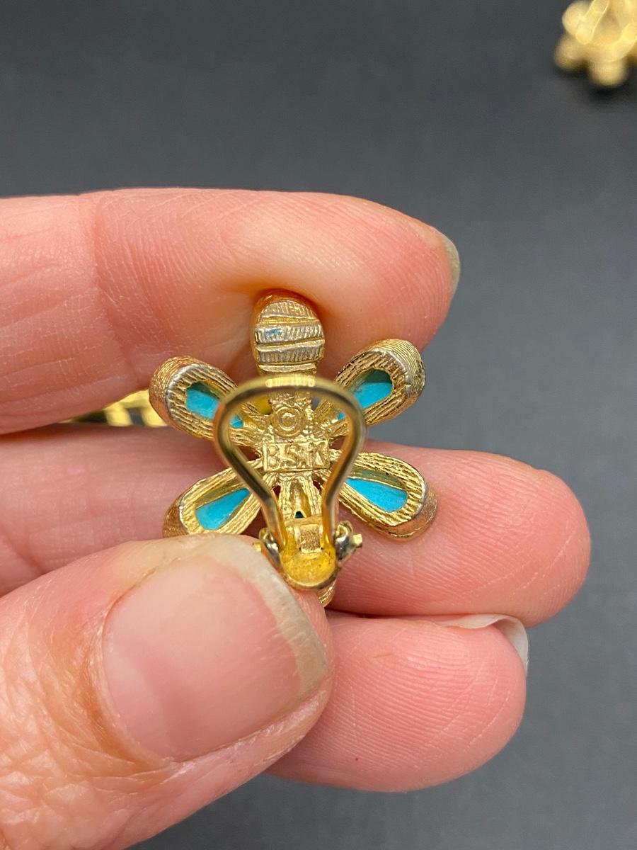 Vintage Gold Tone & Faux Turquoise BSK Daisy Flower Brooch Pin Clip Earrings