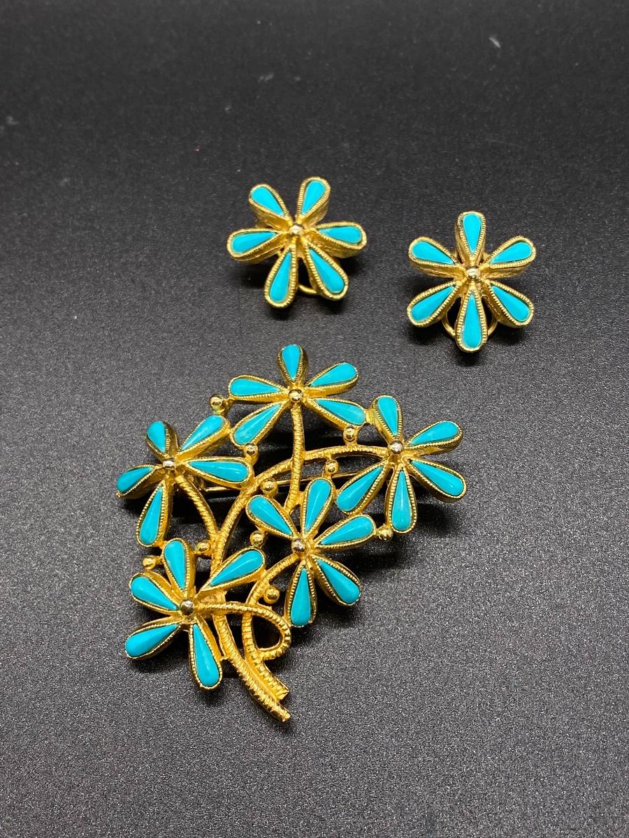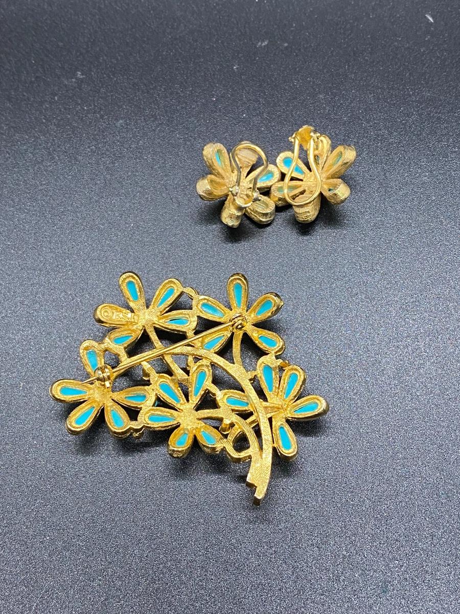 Vintage Gold Tone & Faux Turquoise BSK Daisy Flower Brooch & Clip Earrings. Great vintage condition.