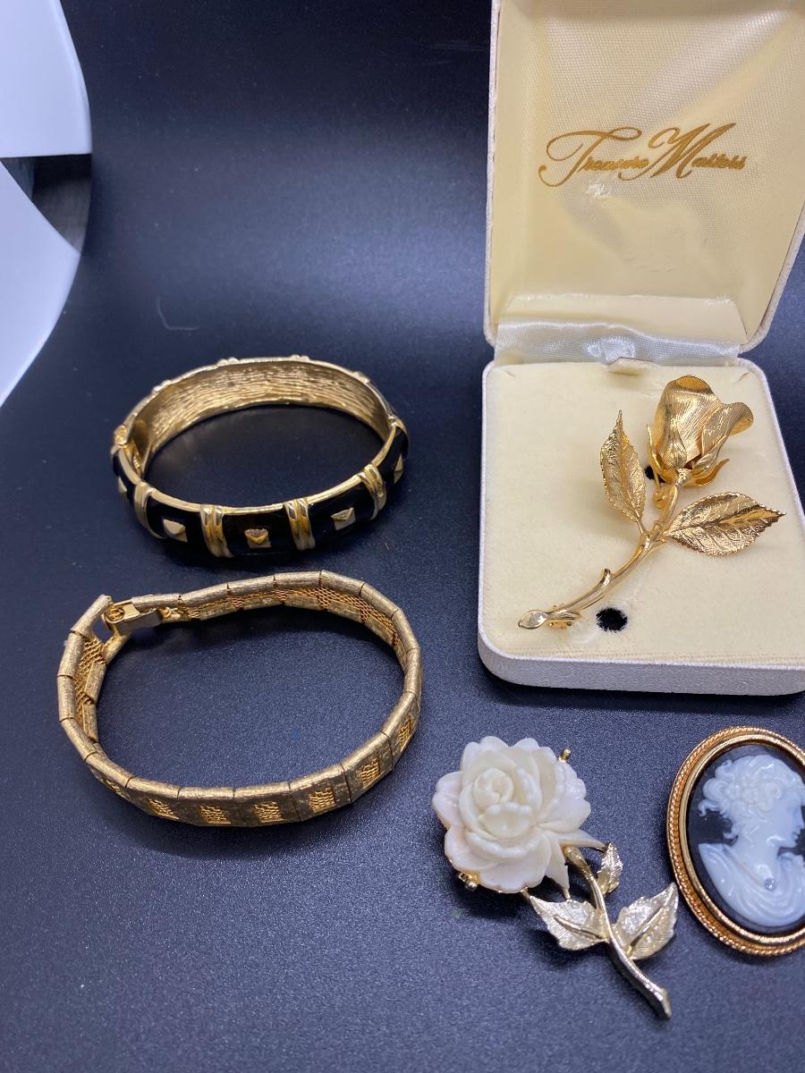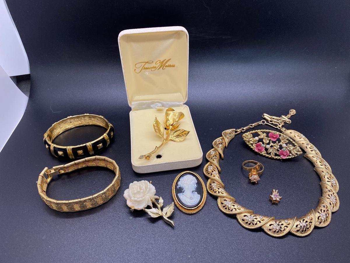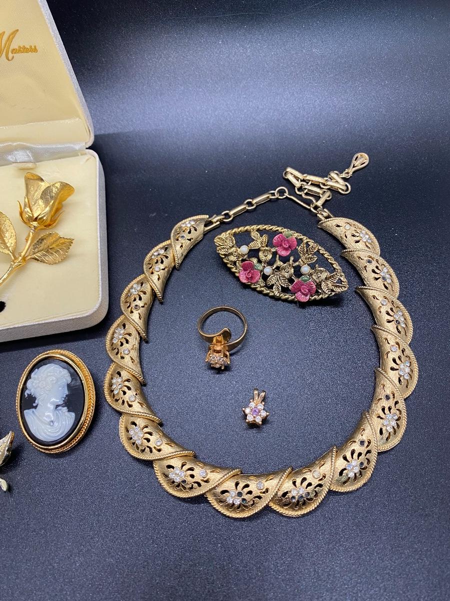 Vintage Gold Tone Jewelry Lot. Bracelets, pins, choker necklace, ring, and pendant. The necklace is missing a couple tiny rhinestones but it doesn't stand out to much.