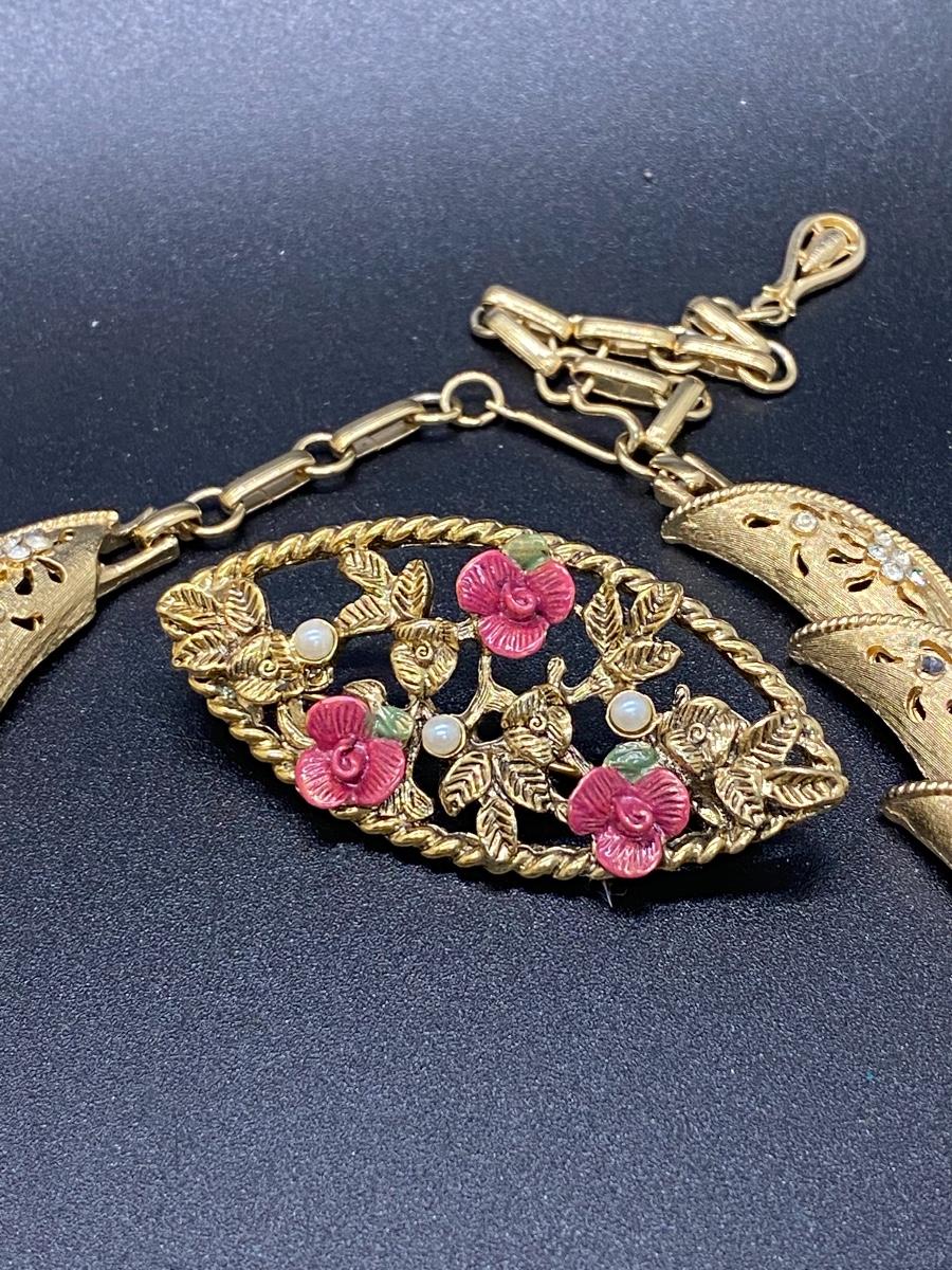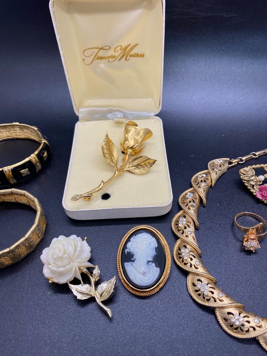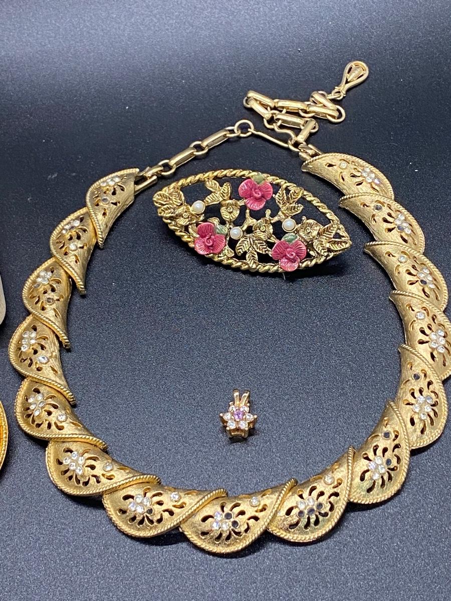 Vintage Gold Tone Jewelry Lot. Bracelets, pins, choker necklace, ring, and pendant. The necklace is missing a couple tiny rhinestones but it doesn't stand out to much.