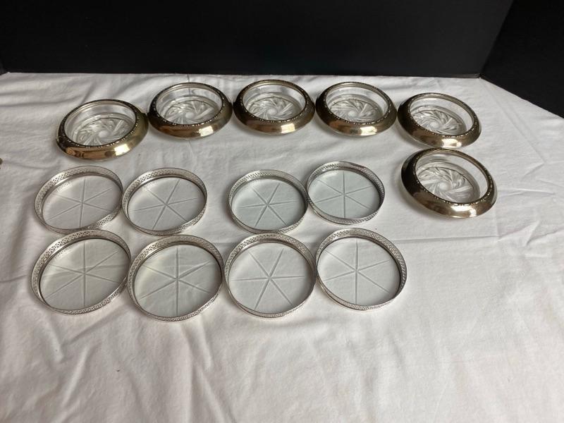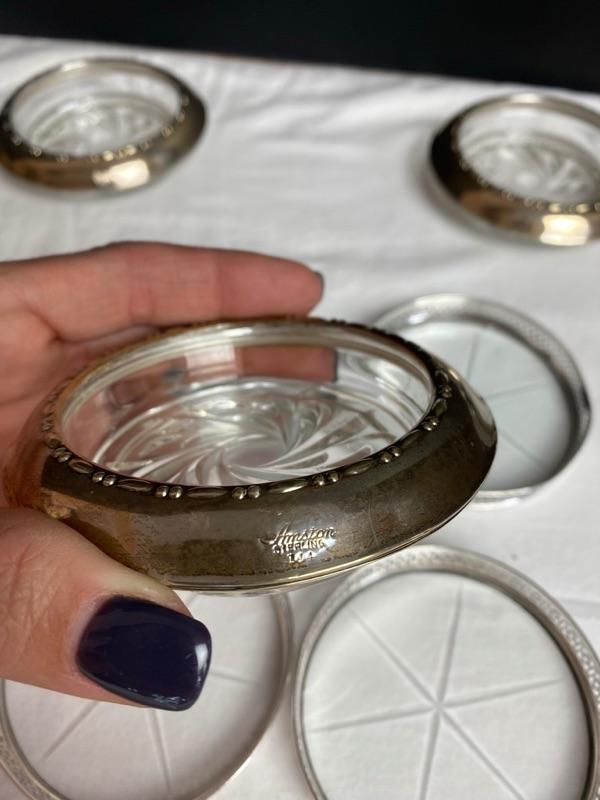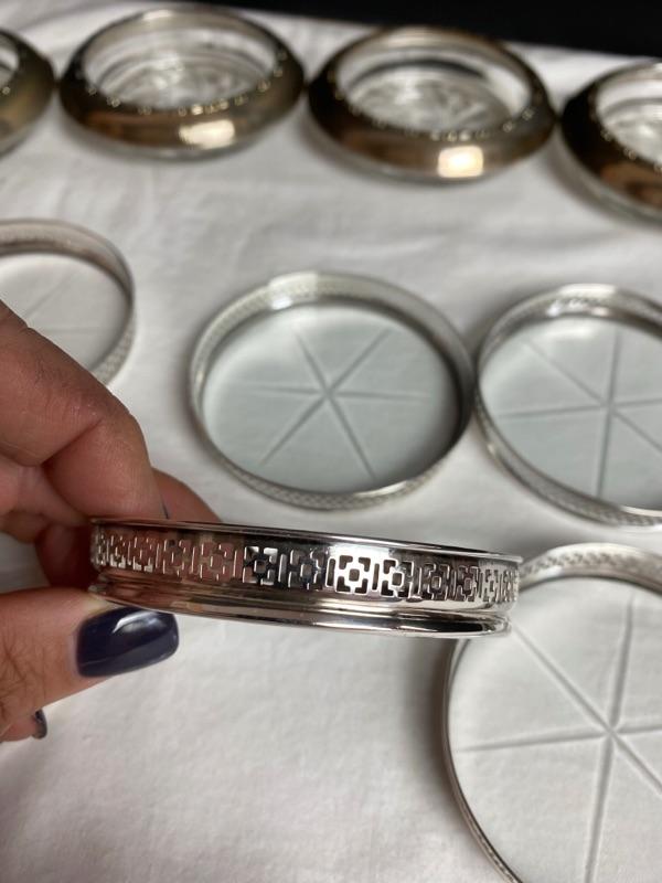 Set of 8 Sterling Reticulated Edge Crystal Bottom Coasters