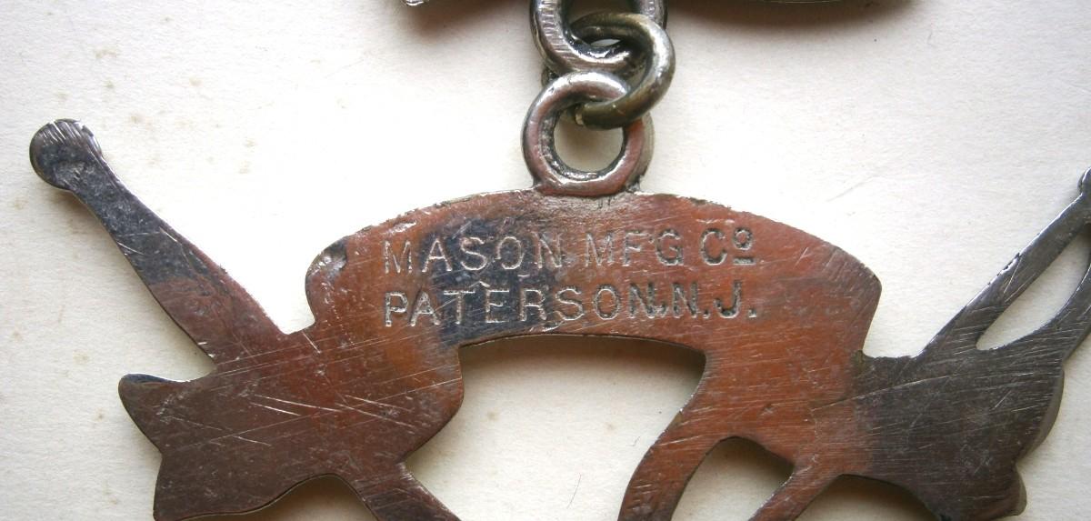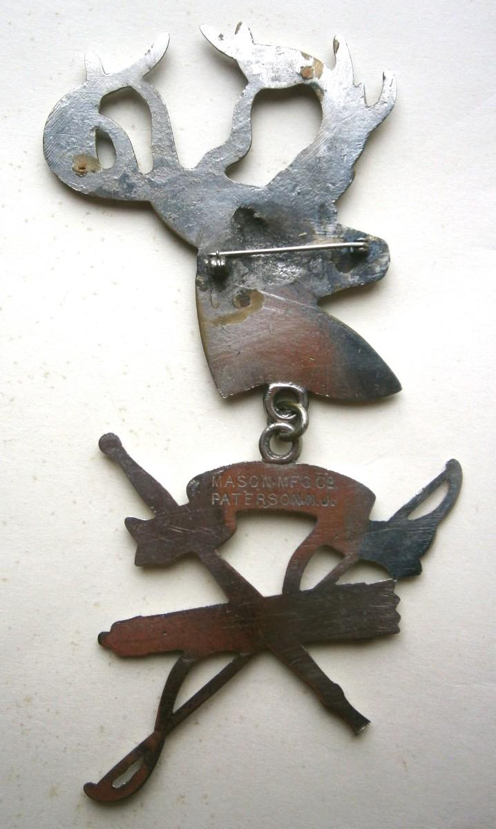 Vintage F. of A. (Foresters of America) Elk Head Pin with S.C.R. Emblem by Mason Mfg. Co. of Paterson, NJ, 5 1/4 in. tall (overall), made of nickel plated brass.