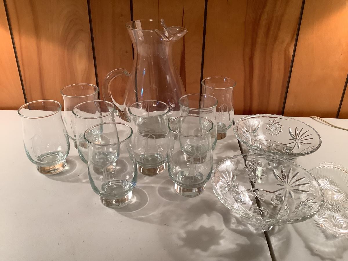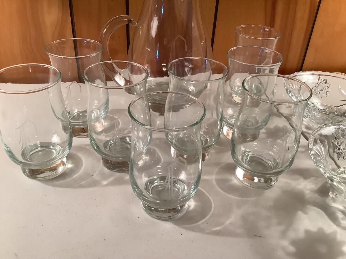 "F" pitcher and 8 glasses, footed, relish lot
