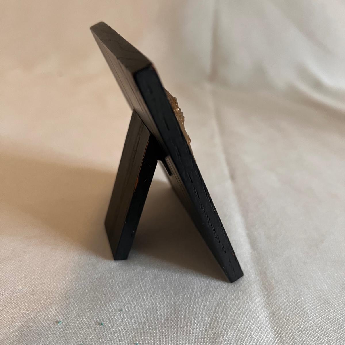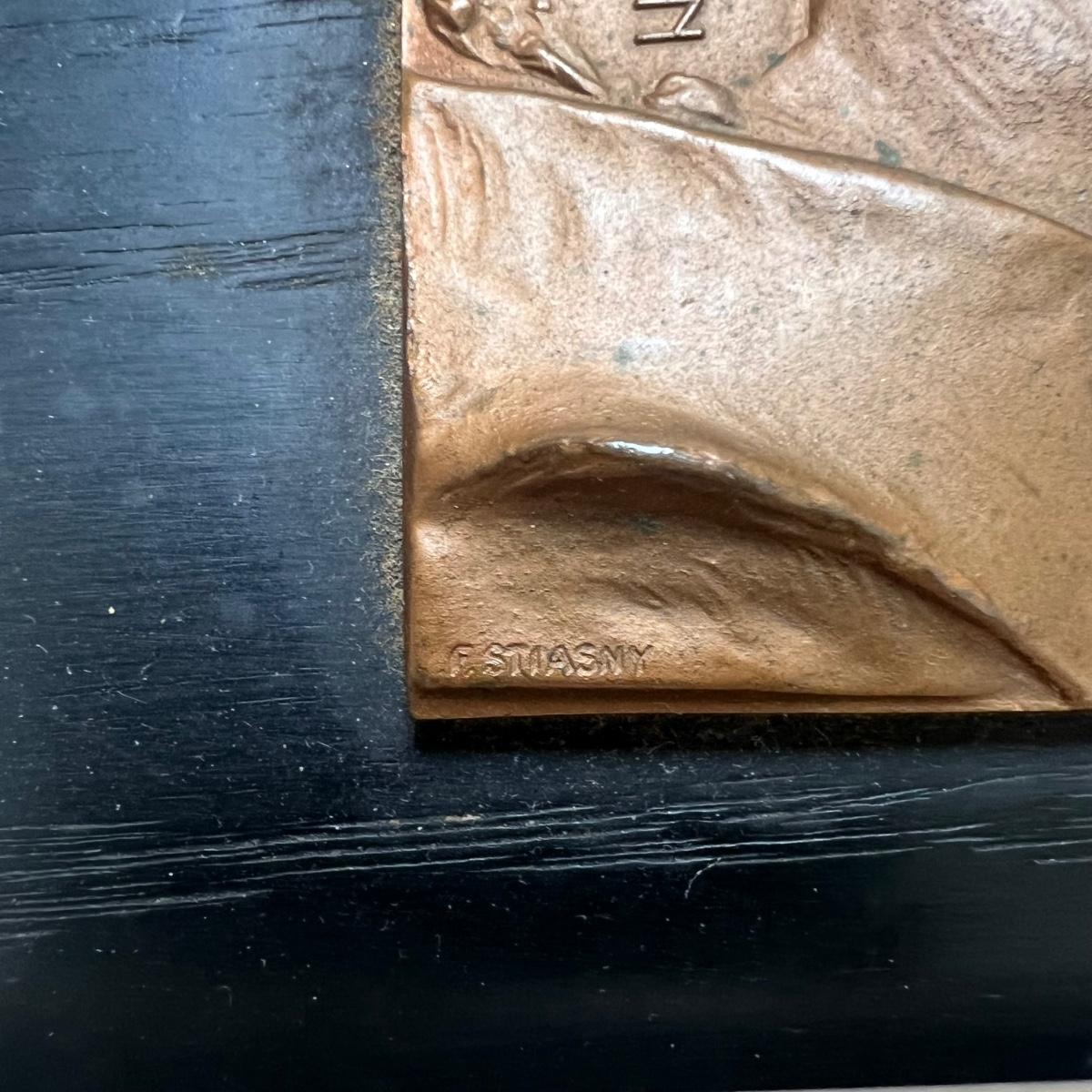 This bronze plaque of Beethoven is mounted on a small dark wood frame. It has the "F. Stiasny" engraved on the right corner.