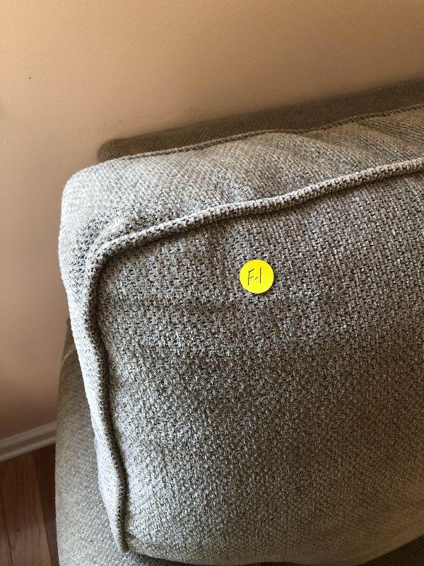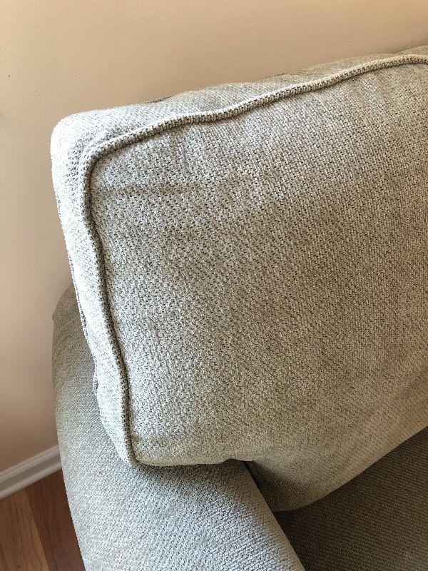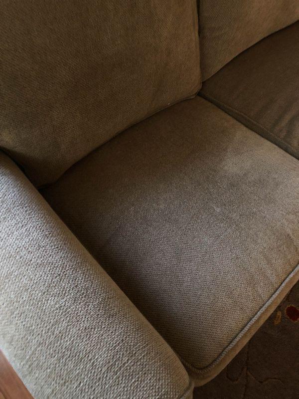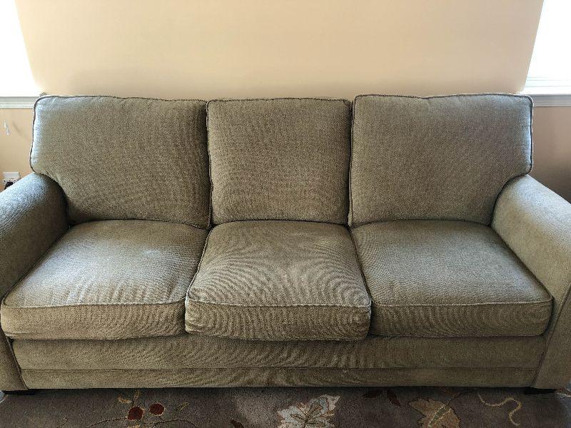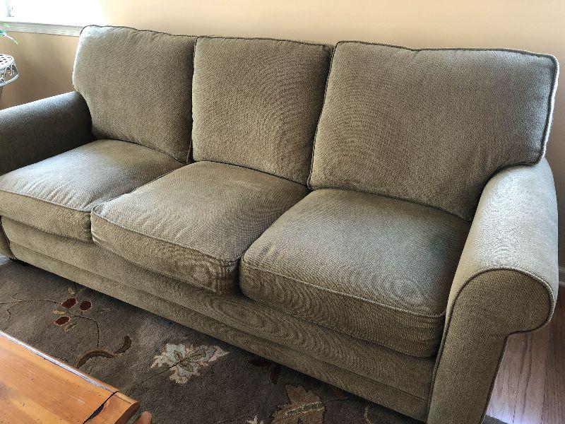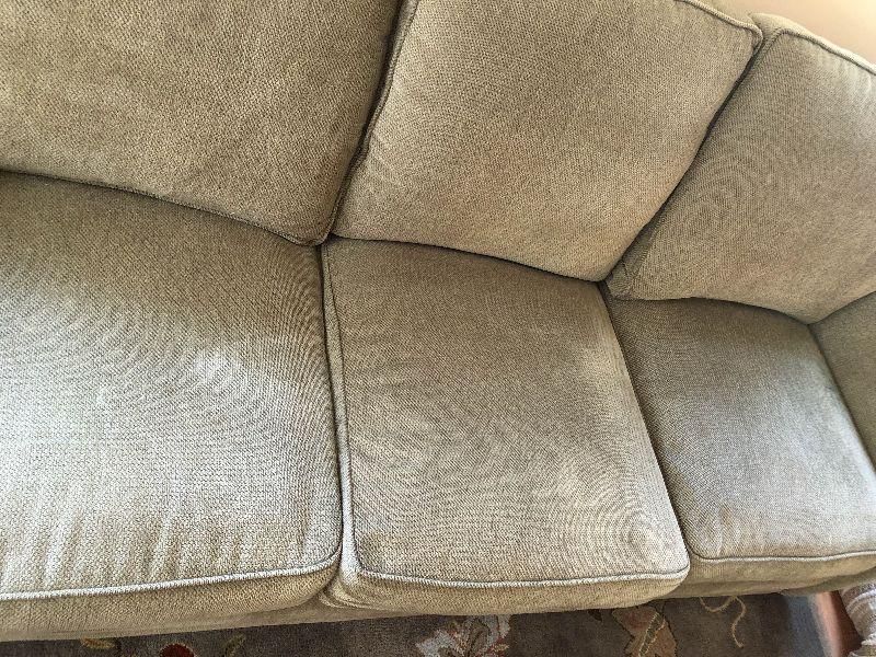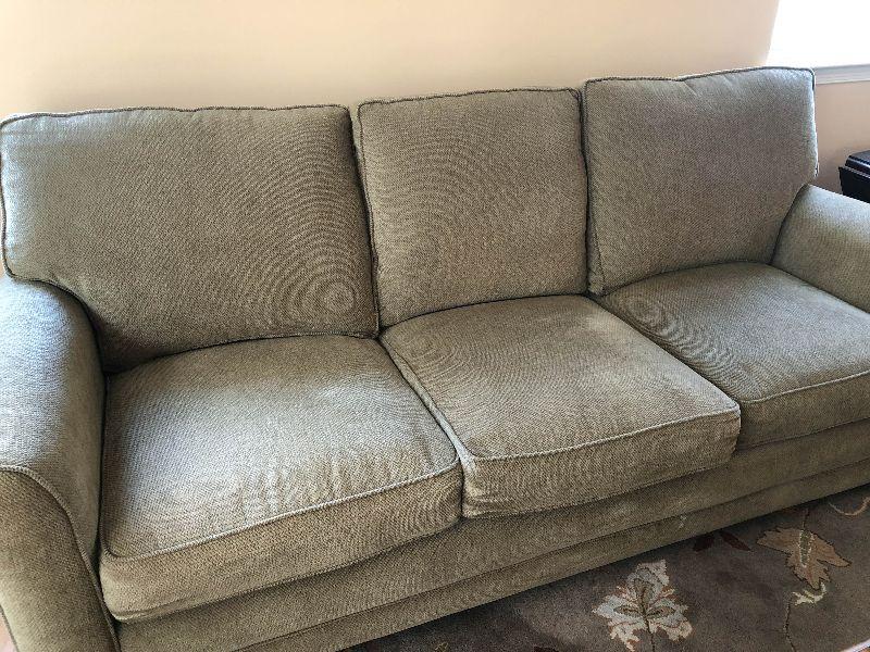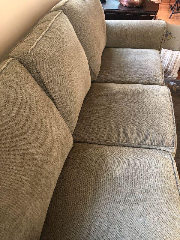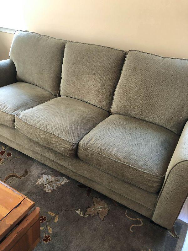HIgh back sofa with cumphy cushions. Has a couple of light stains but overall in great condition. There is an identical sofa available as well.