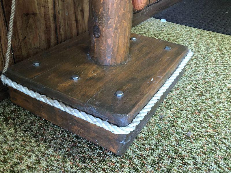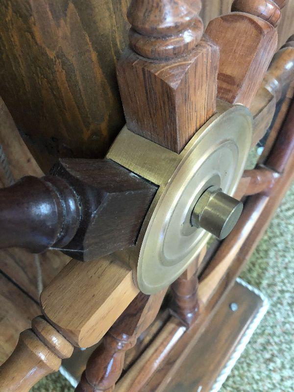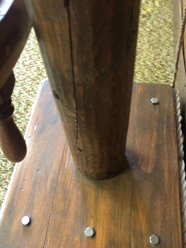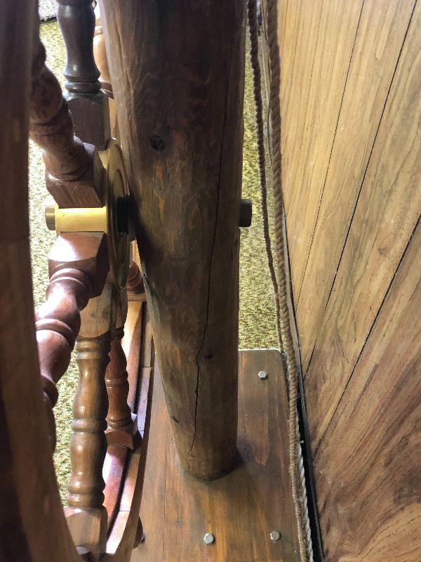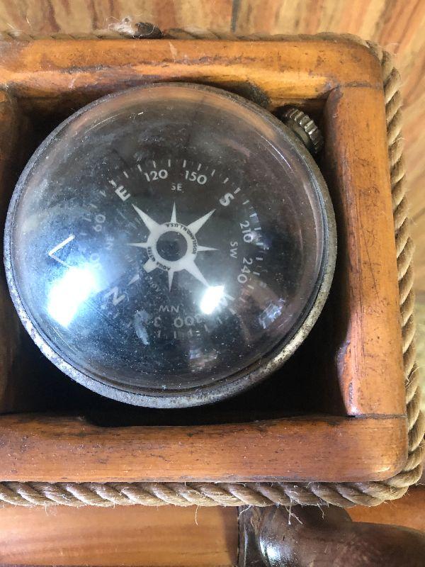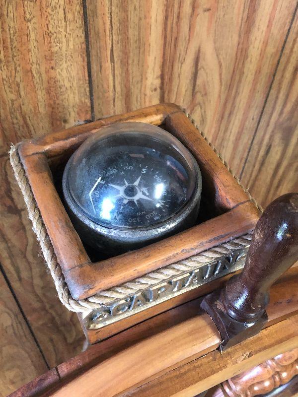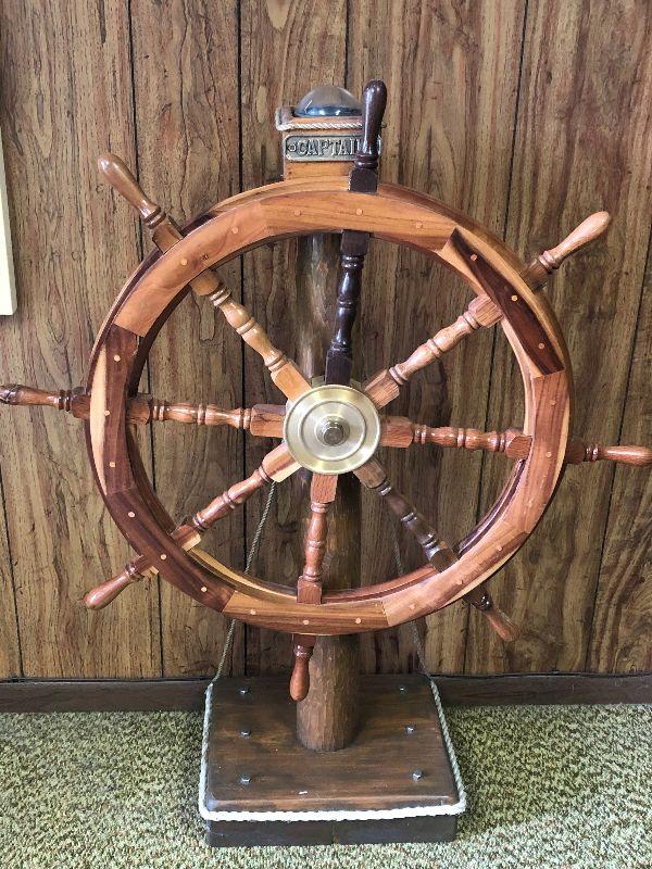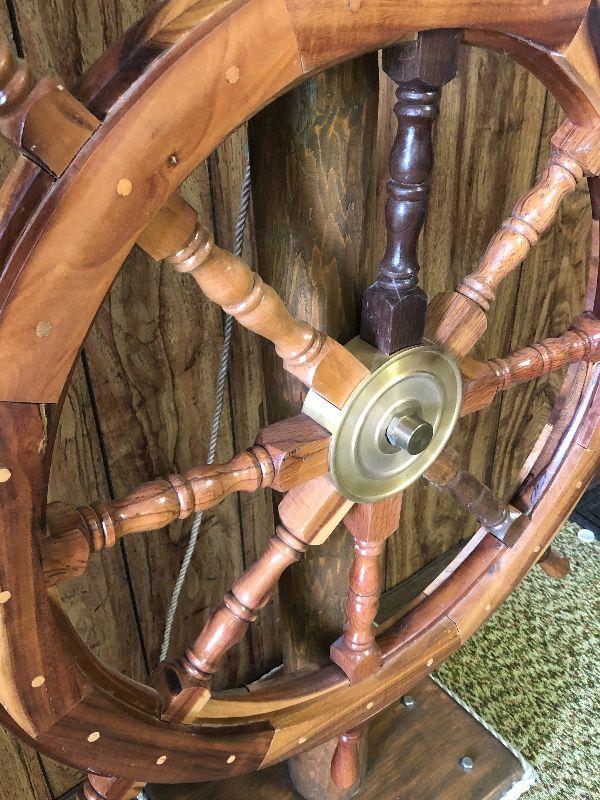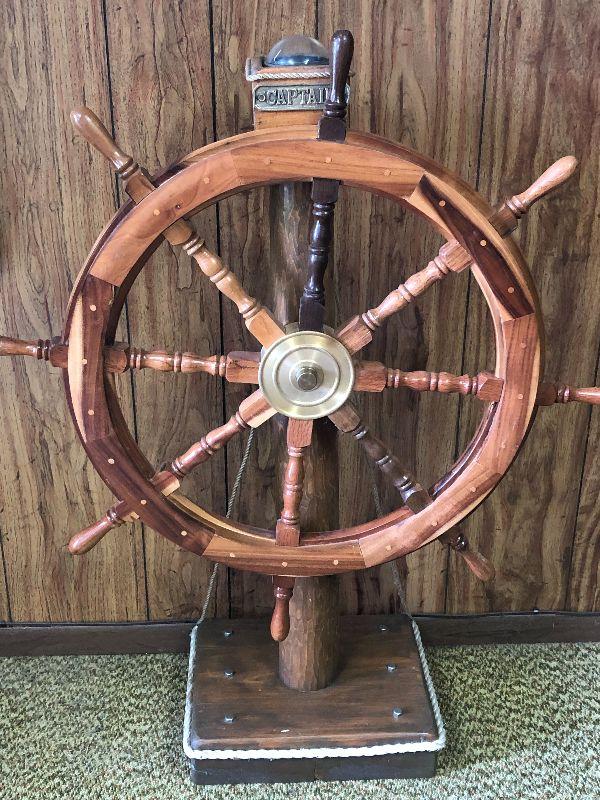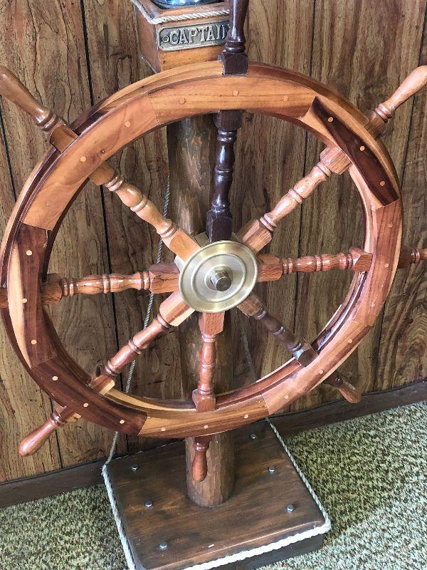 This is a standing ships wheel for decor. It stands 44 inches tall and 35 inches wide. Great for man-cave or beach house. Not sure of age, or authenticity. Please see all pictures for exact contents of the lot, condition of the items, and if measurements if taken. Thank you for looking and have fun bidding.