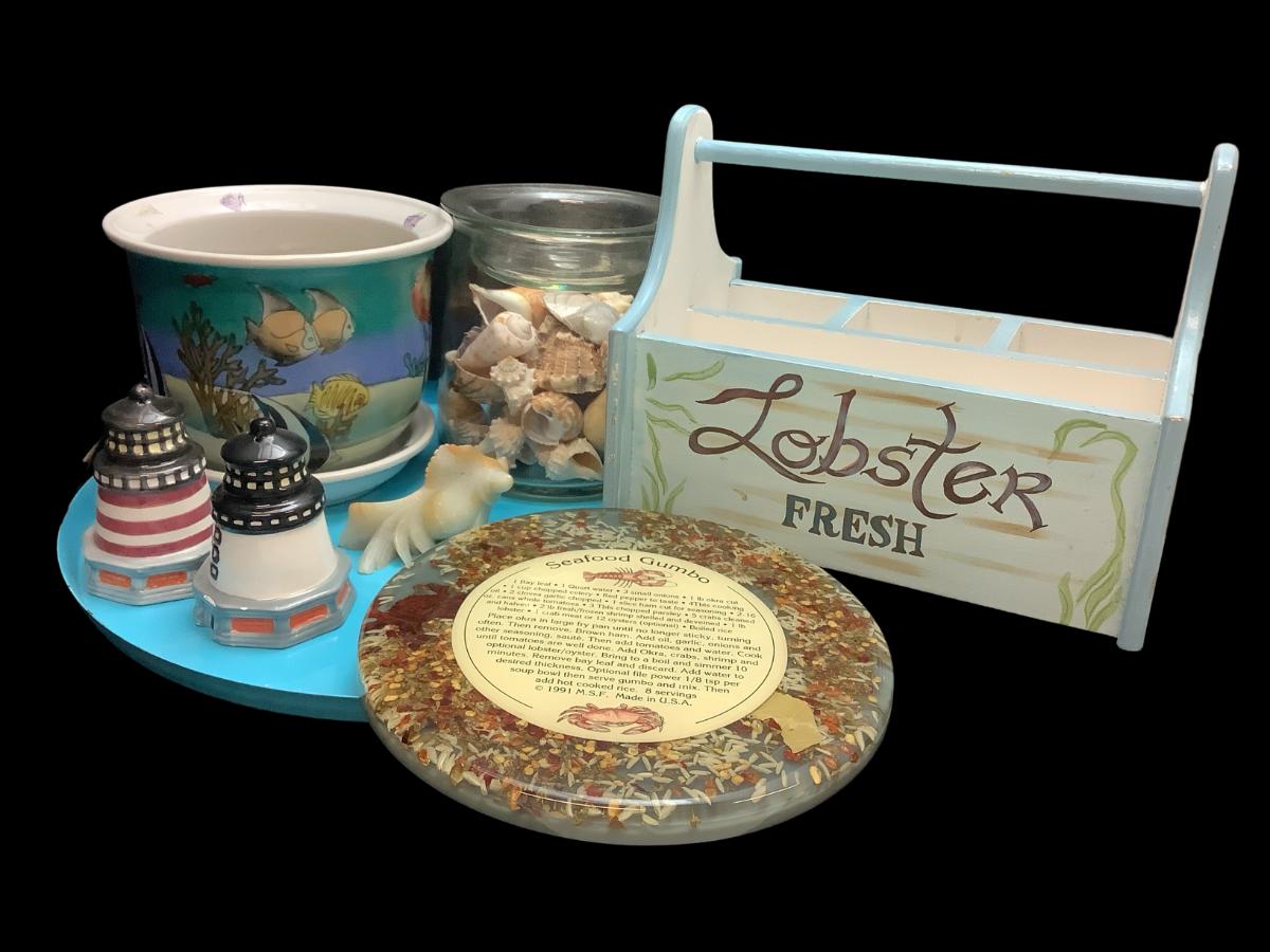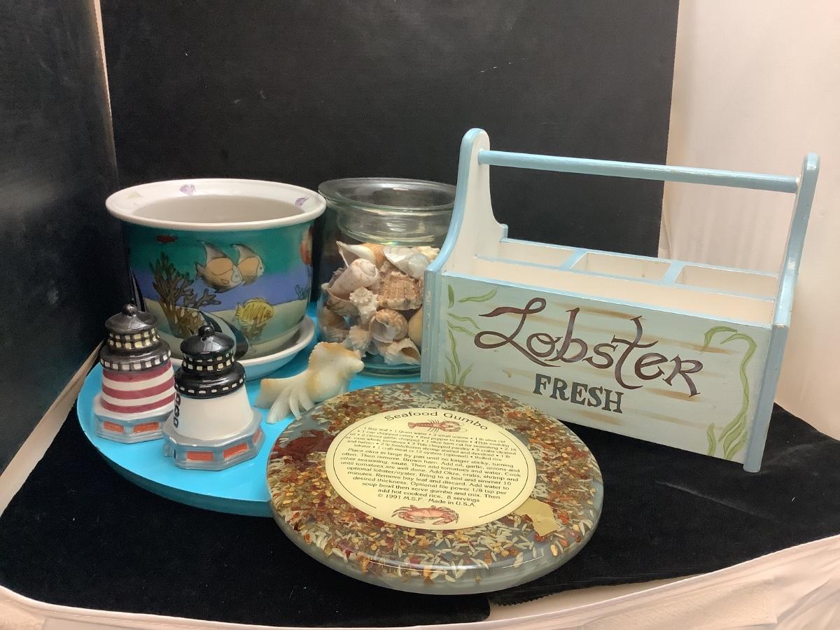 Lobster utensil caddy, jar of shells, shrimp gumbo hot plate lighthouse salt and pepper, fish pottery flower pot and more