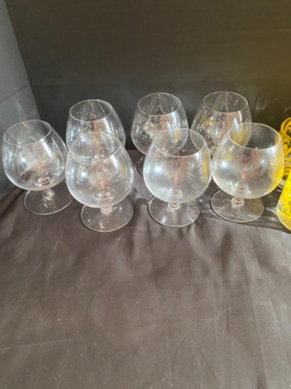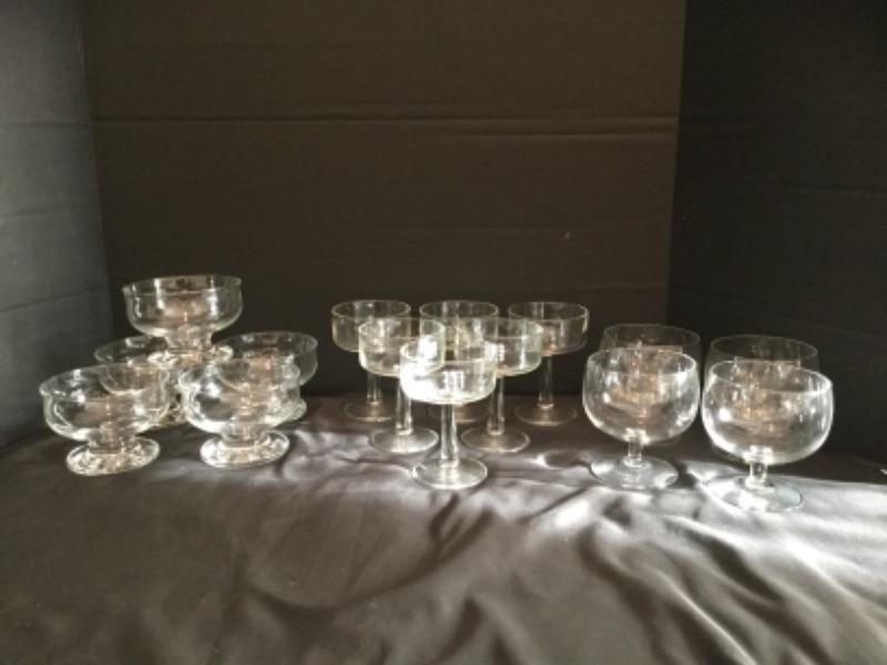 Set of 5 Footed Glass dessert Bowls, 5 white pasta bowls, and several assorted brandy snifter and champagne glasses
