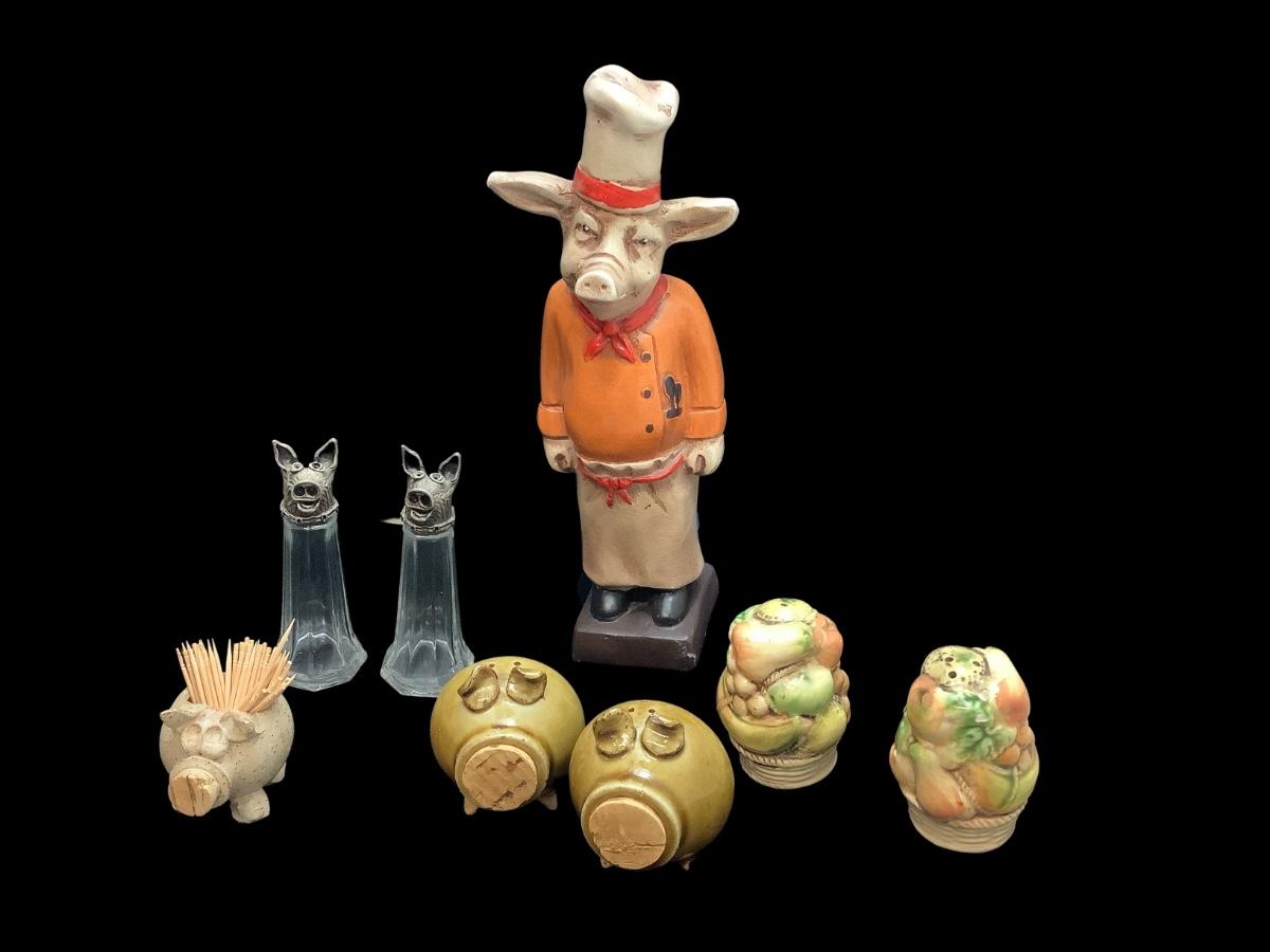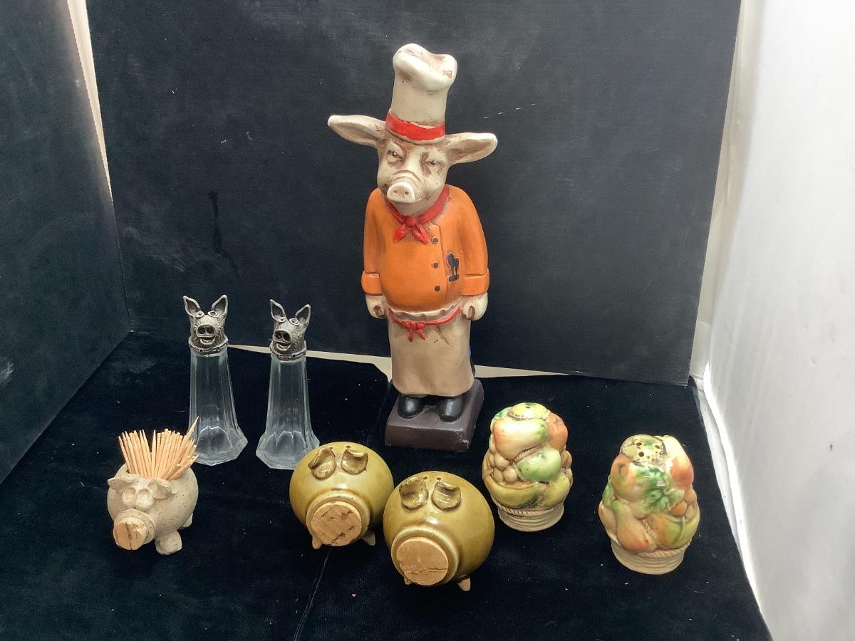 with fruit basket salt and pepper, bigs, and pig toothpick holder