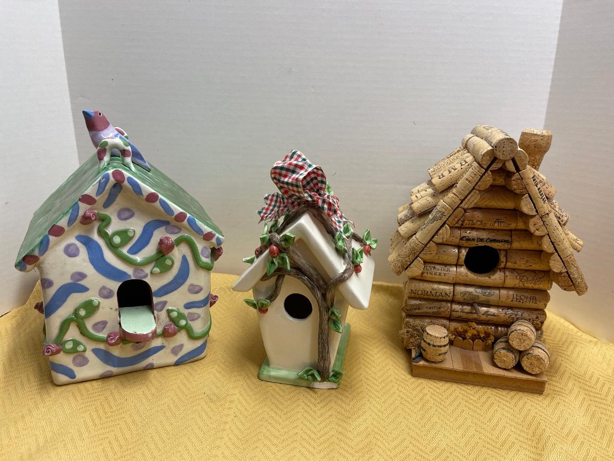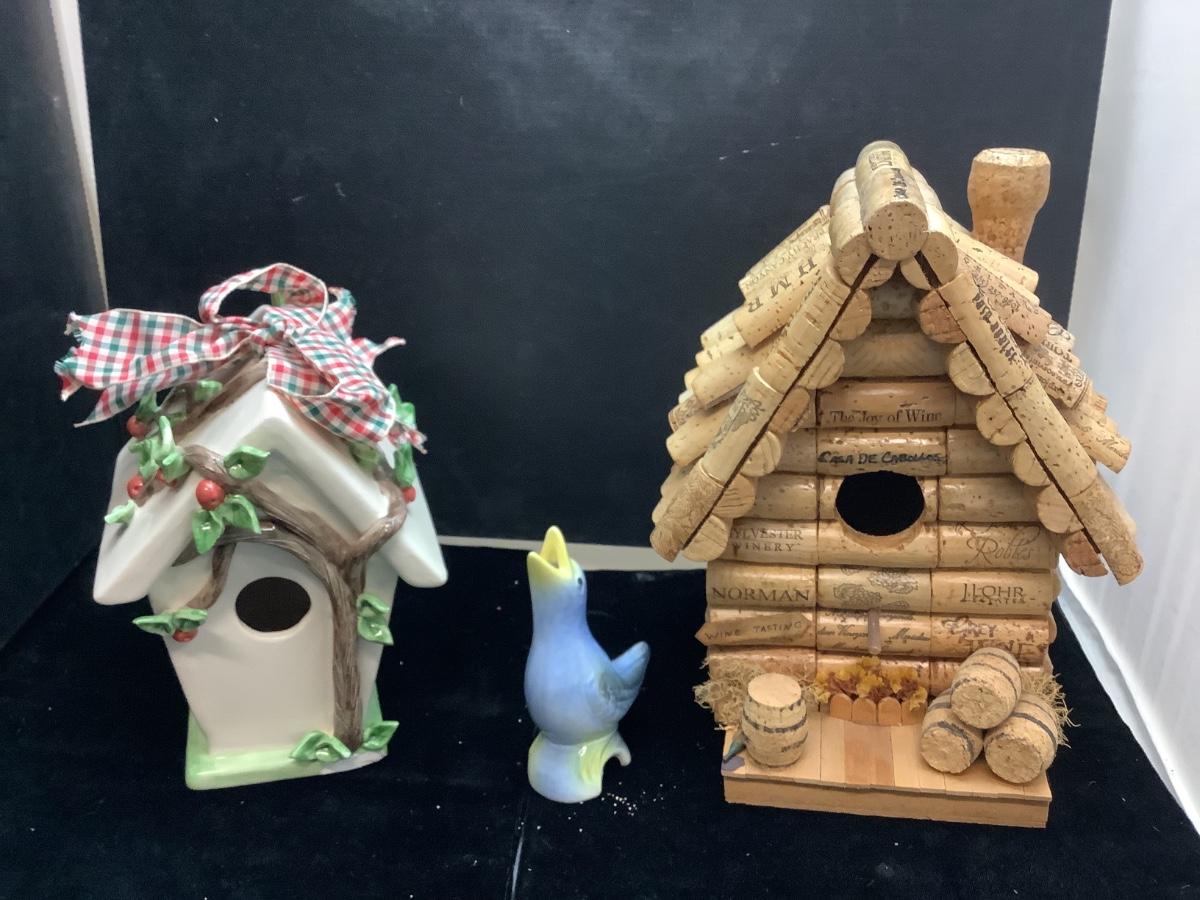 two birdhouses one measures 7" high and the other is 10” cork house is 9.5" high