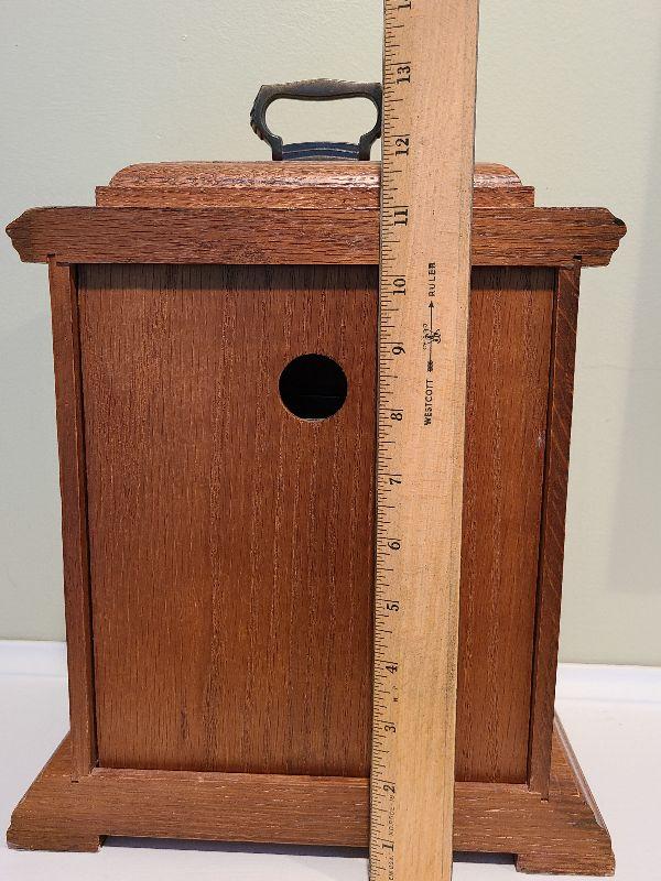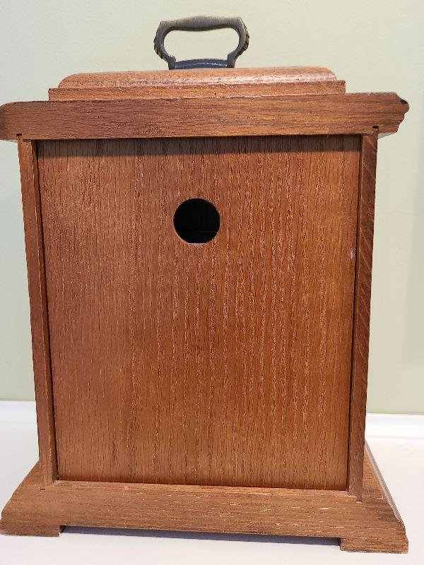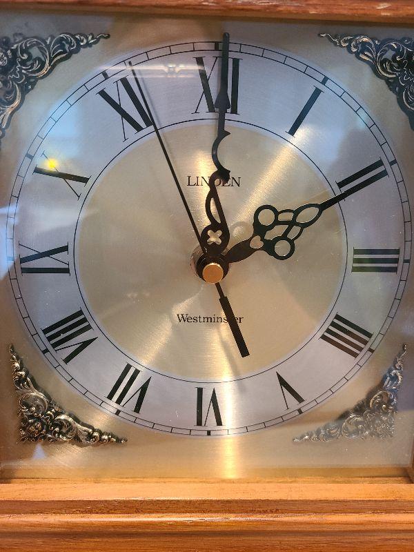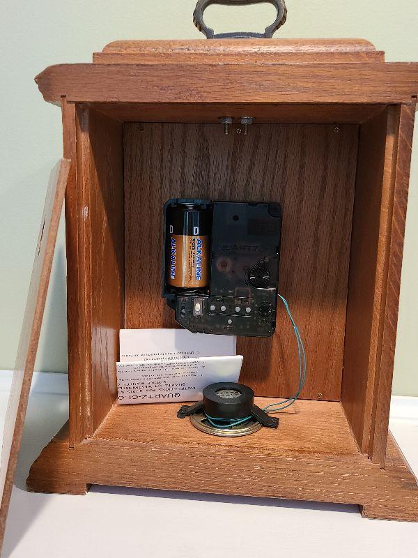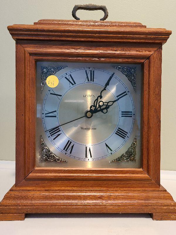 Battery operated mantle clock. Please see all pictures for contents in this listing, the condition of items in the listing, and the size if measurements were taken. Thank you for looking and have fun bidding.