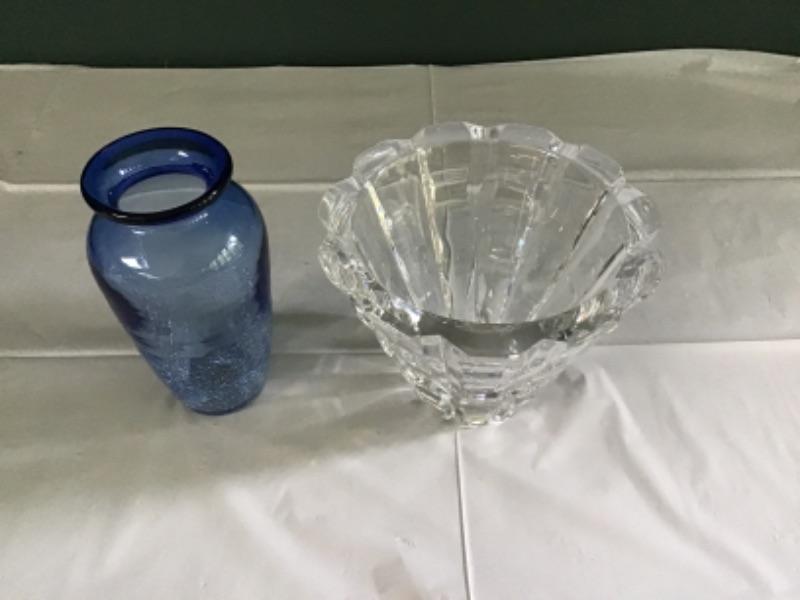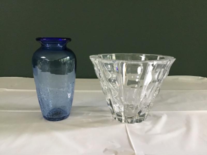 F-111 (2) Vases Hand Blown Blue Glass Crackle & Orrefors Crystal