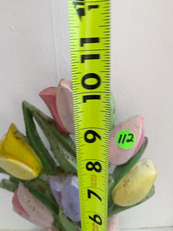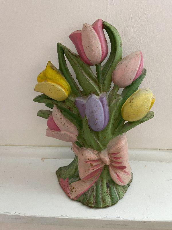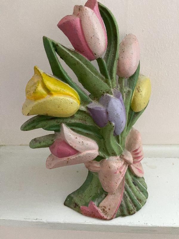 Flower bouquet door stop. Please review all photos. First photo shows all that is in the lot, unless otherwhise noted. All items sold AS IS-WHERE IS. Please bring help for larger lots, and boxes or bags to remove your lots.