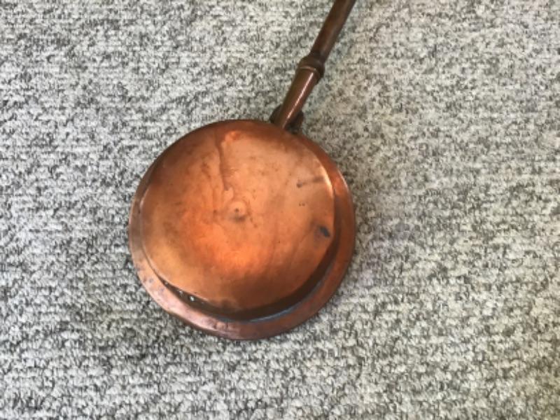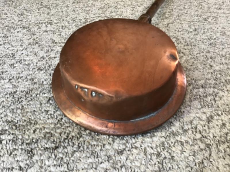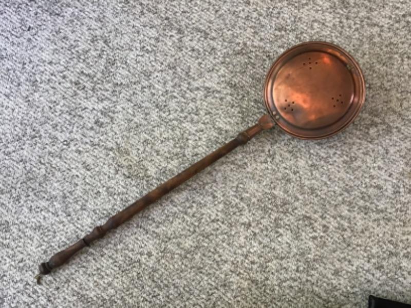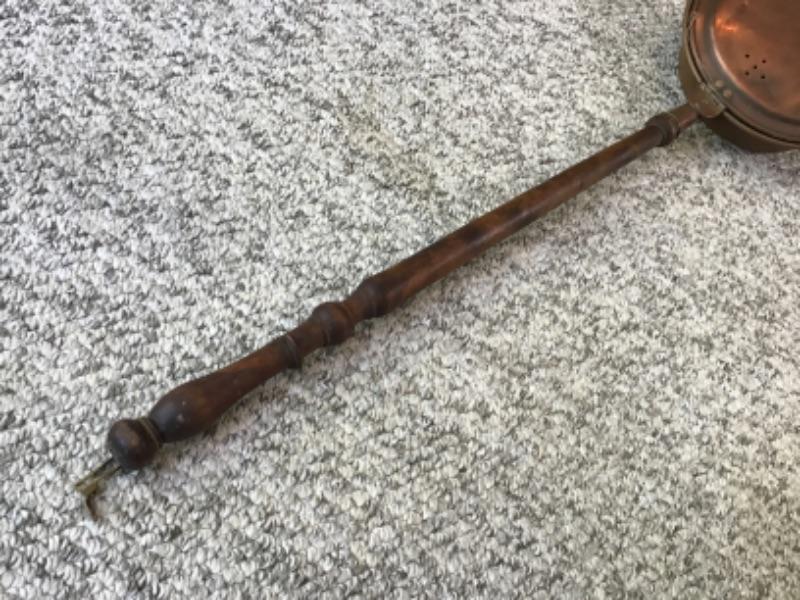 F-115 Antique Copper Chestnut Roaster / Bed Warmer with Long Wood Handle